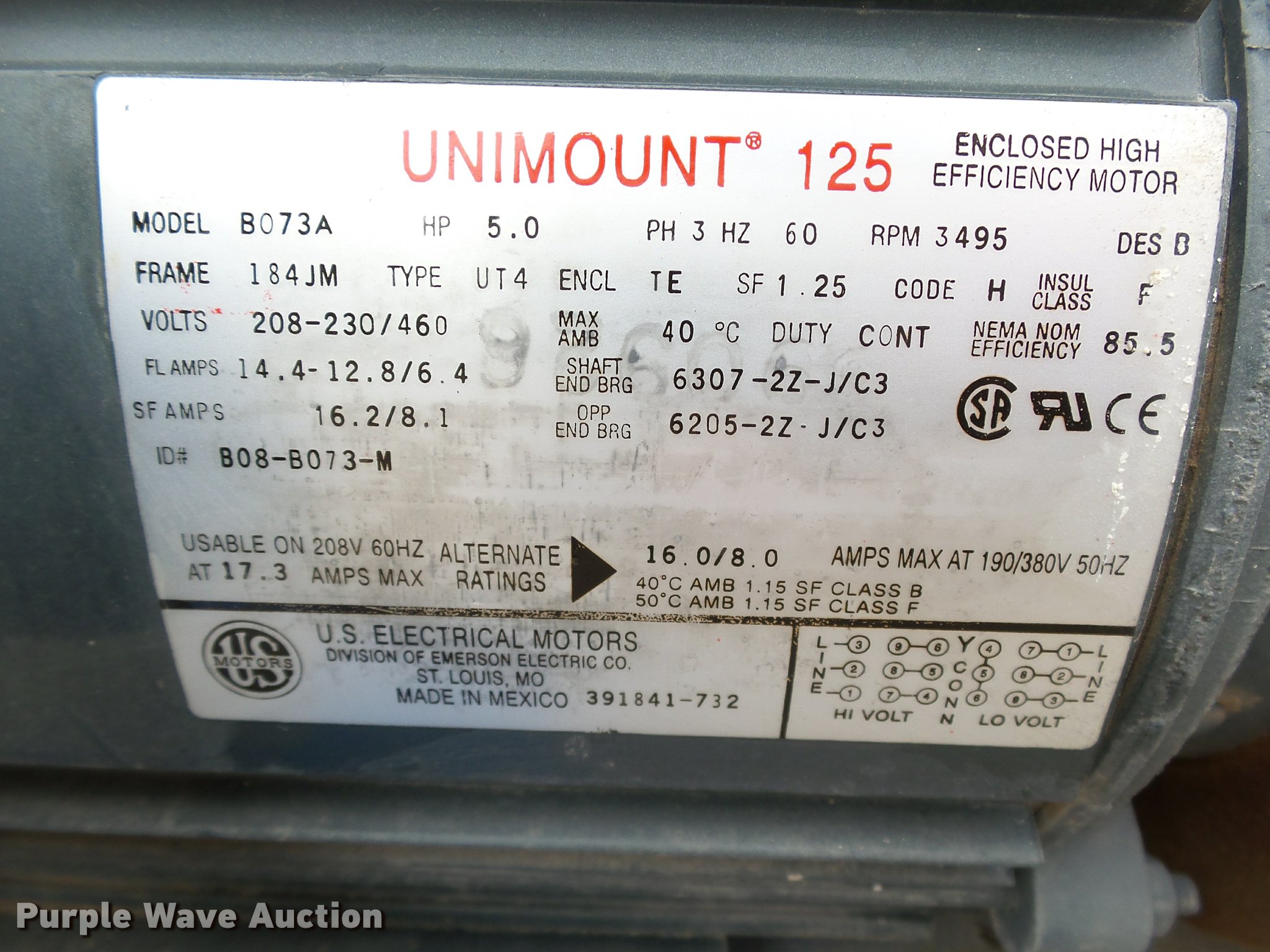 Purple Wave is selling a used Electric Motor in Oklahoma. This item is a U.S. Electric Motors unimount 125 B073A electric motor with the following: 5 HP, 208-230/460V, Three phase, 3,495 RPM, Serial 808-8073-M