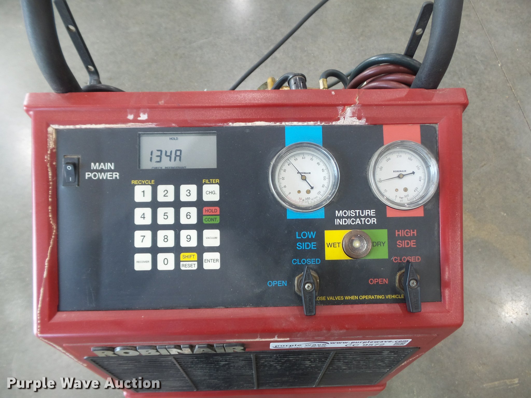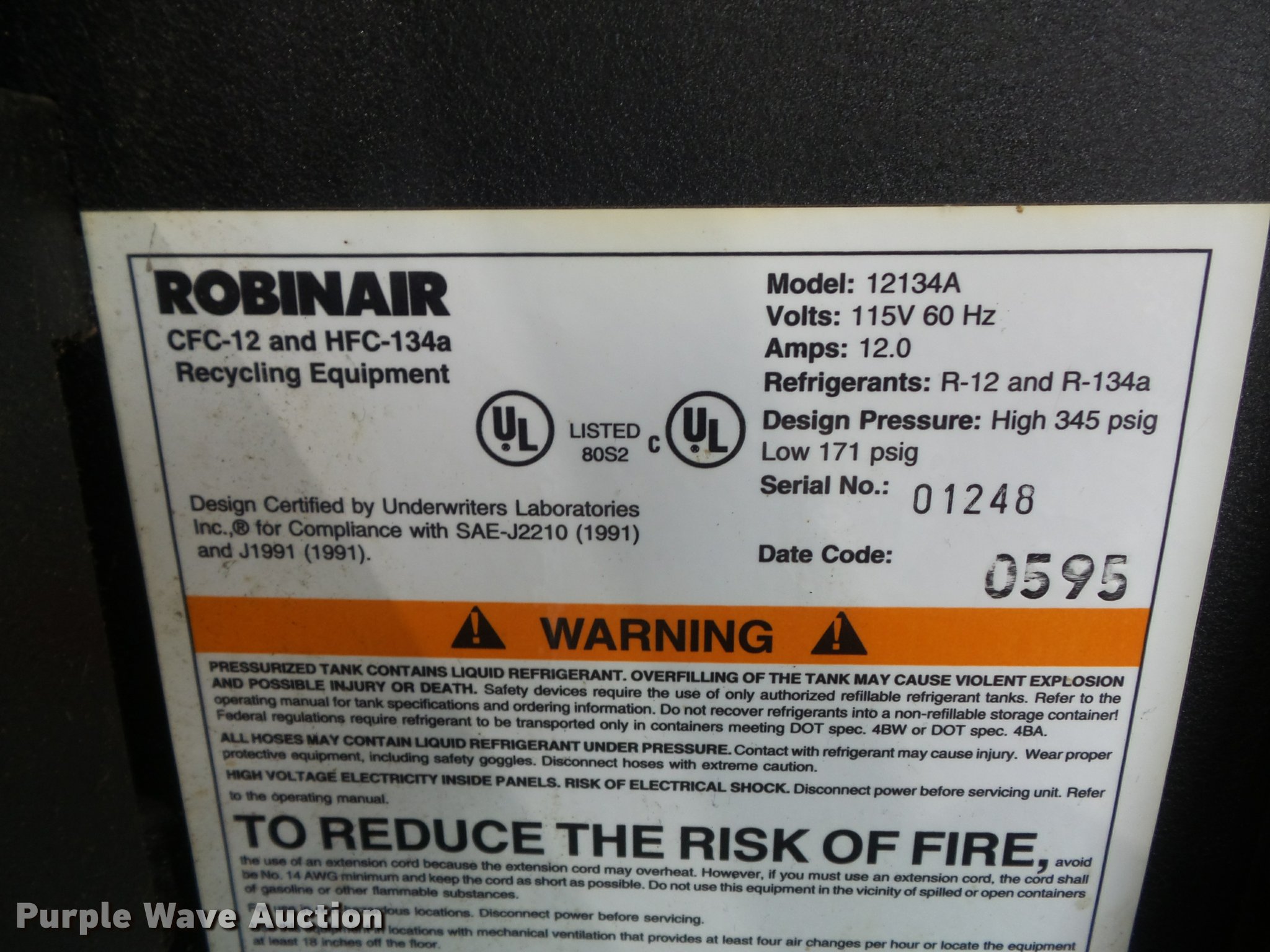 Purple Wave is selling a used Tools in Missouri. This item is a 1995 Robinair 12134A AC recovery/recycling/recharging unit with the following: For R-12 and R-134A freon, Tank not included, Serial 01248