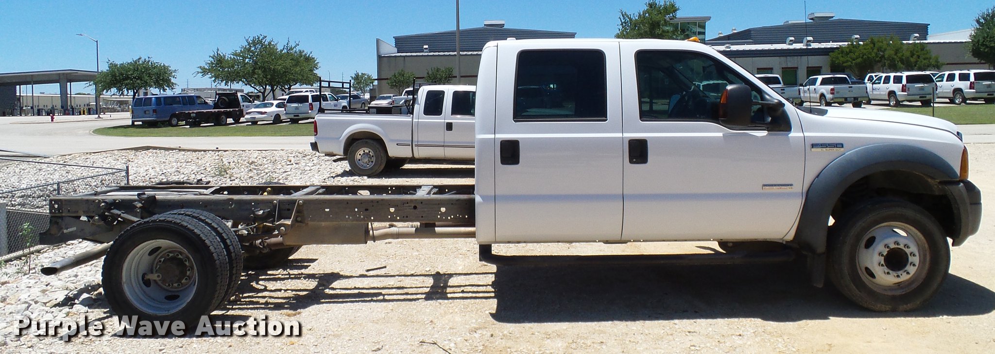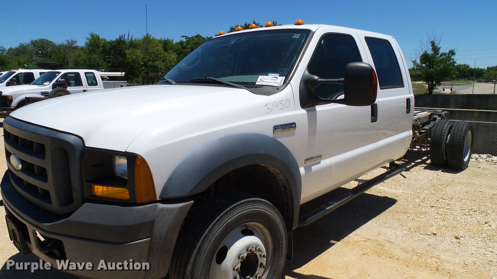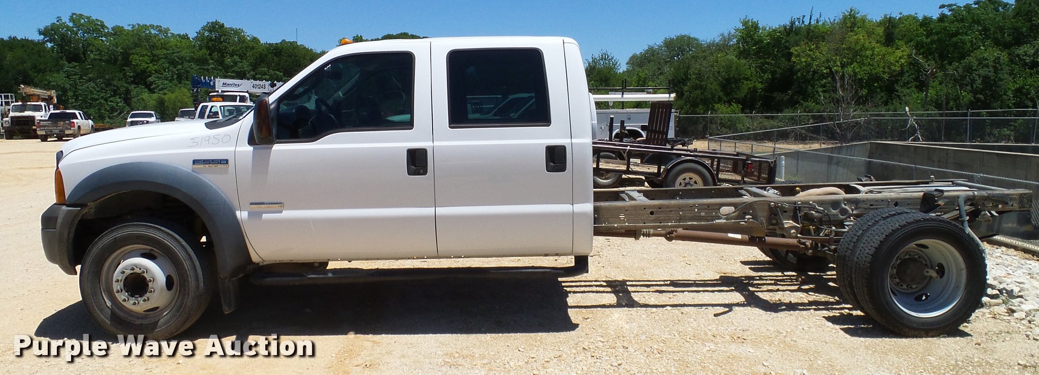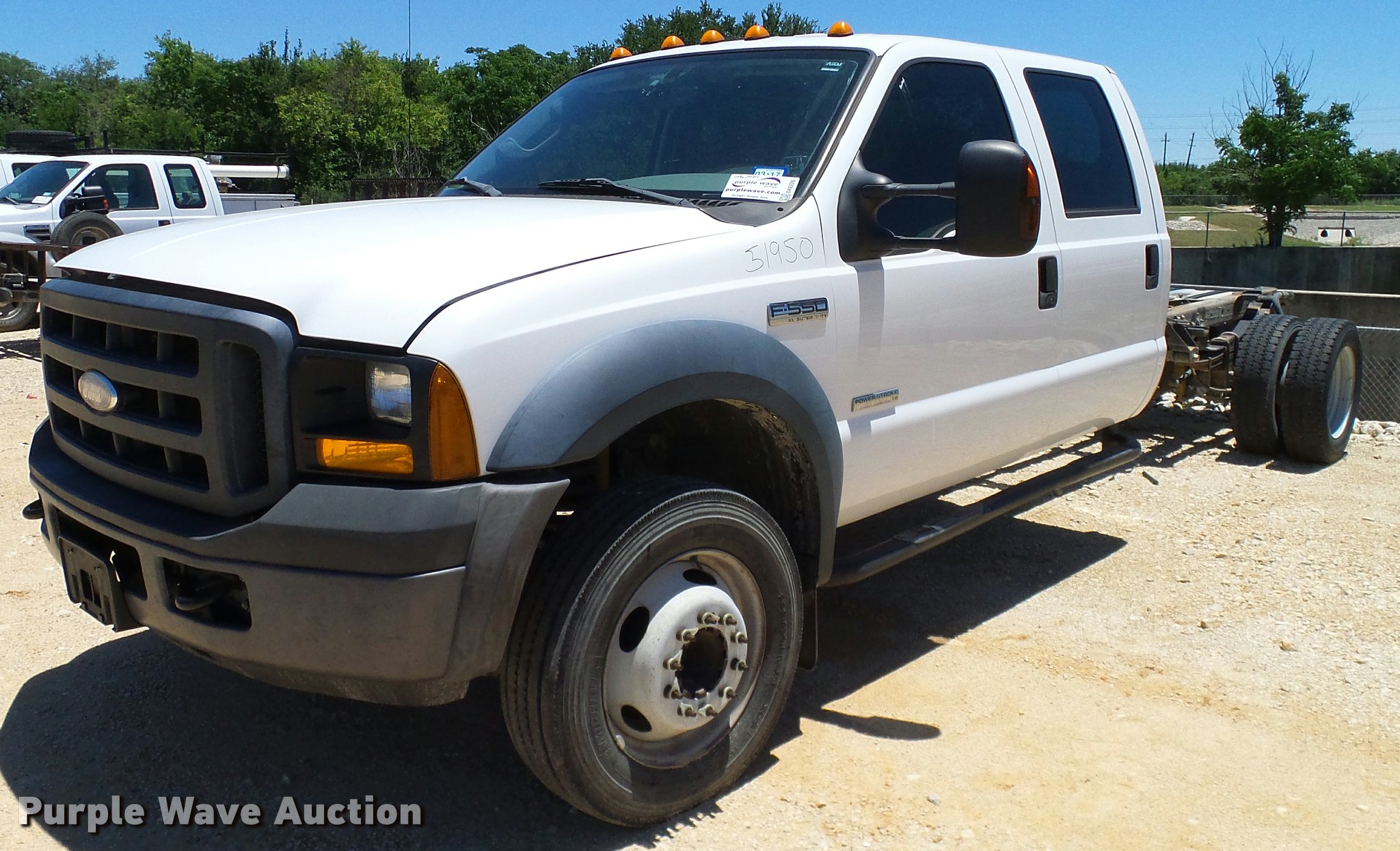 Purple Wave is selling a used Truck Chassis in Texas. This item is a 2006 Ford F550 Crew Cab truck cab and chassis with the following: 154,459 miles on odometer, 6.0L V8 OHV 32V turbo diesel engine, Automatic transmission, AC and heat, Tilt, Cruise, AM/FM, Power windows, locks, and mirrors, Cloth interior, Brake controller, Front tow hooks, Receiver hitch, 11' from cab to end of chassis, 225/70R19.5 tires, Engine failure, Non-operational unit, Unit# 51950