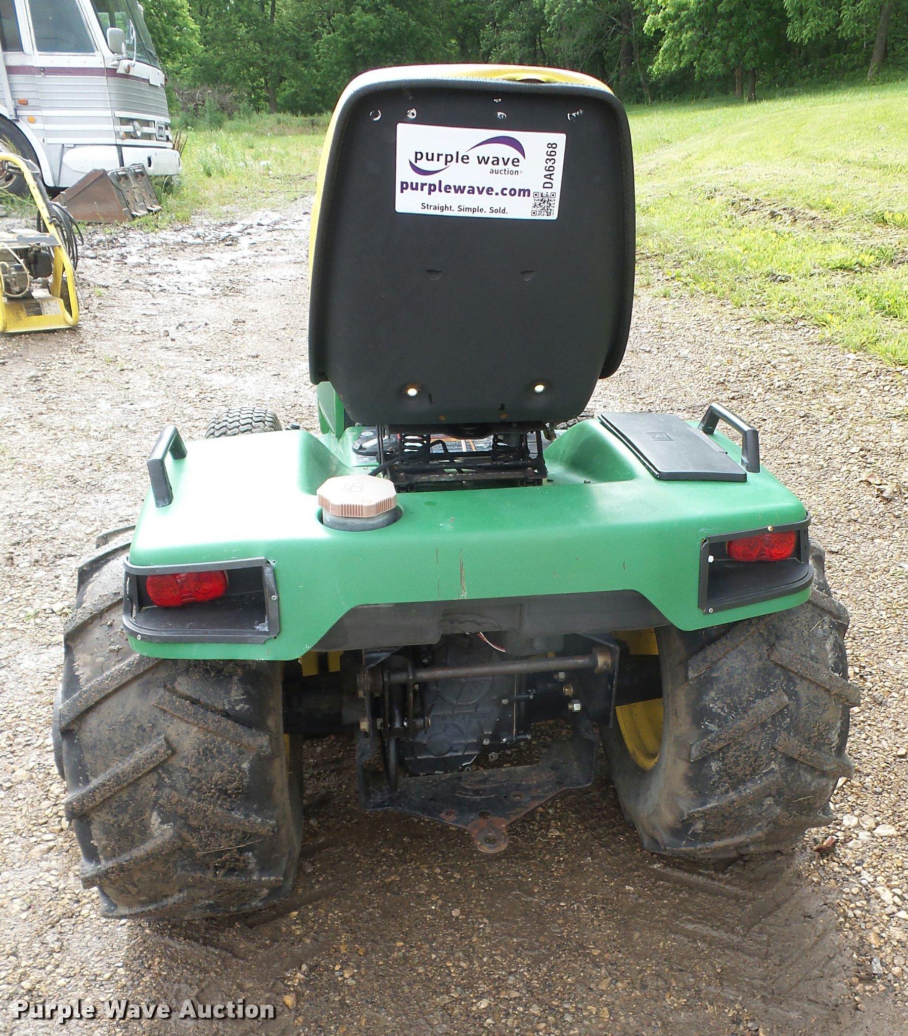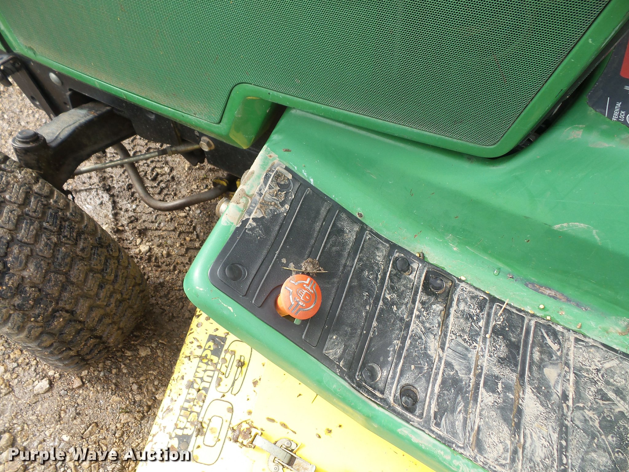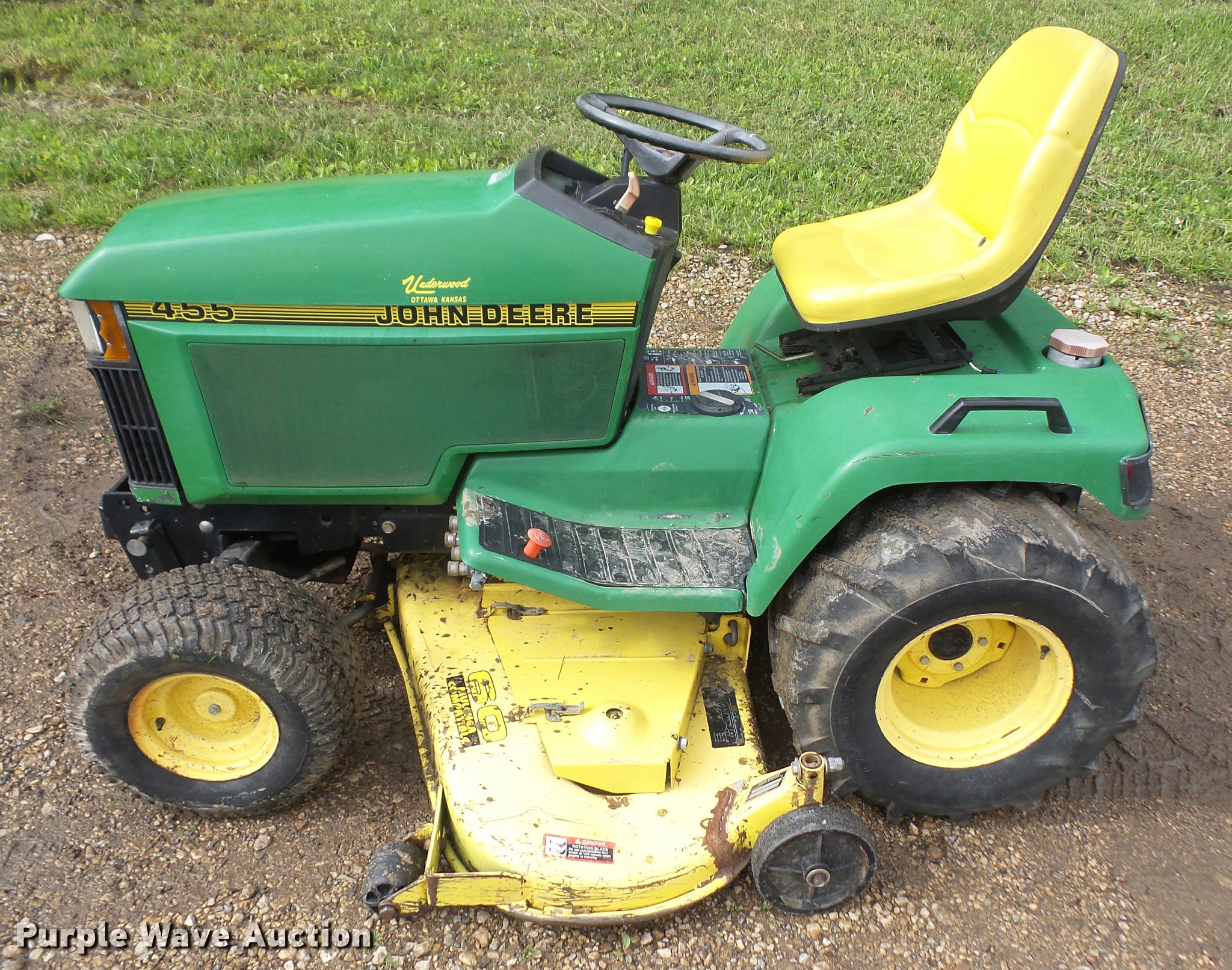 Purple Wave is selling a used Lawn Mower in Kansas. This item is a John Deere 455 lawn mower with the following: 1,991 hours on meter, 60" cut, John Deere three cylinder diesel engine, 22 HP, Front hydraulics, 18.00x8.50-8 front tires, 26x12.00-12 rear tires, Hood mount loose, Serial M00455C030006