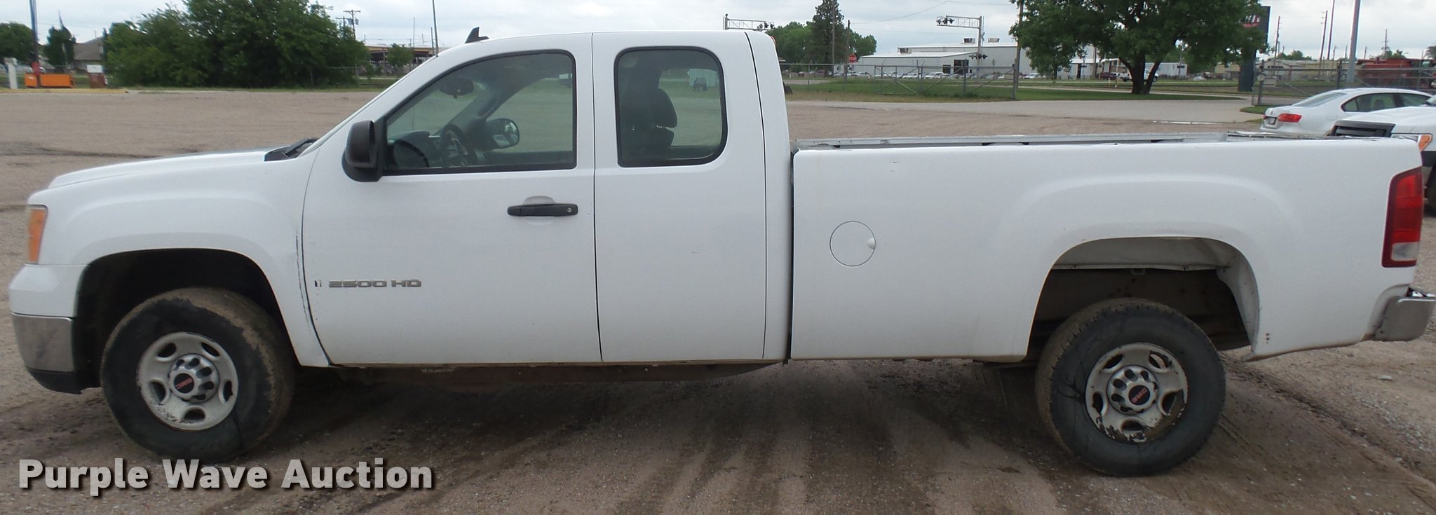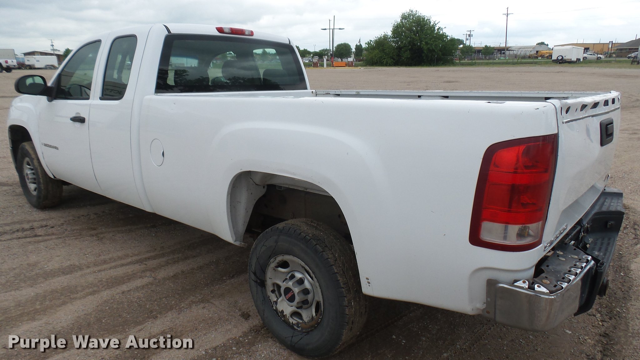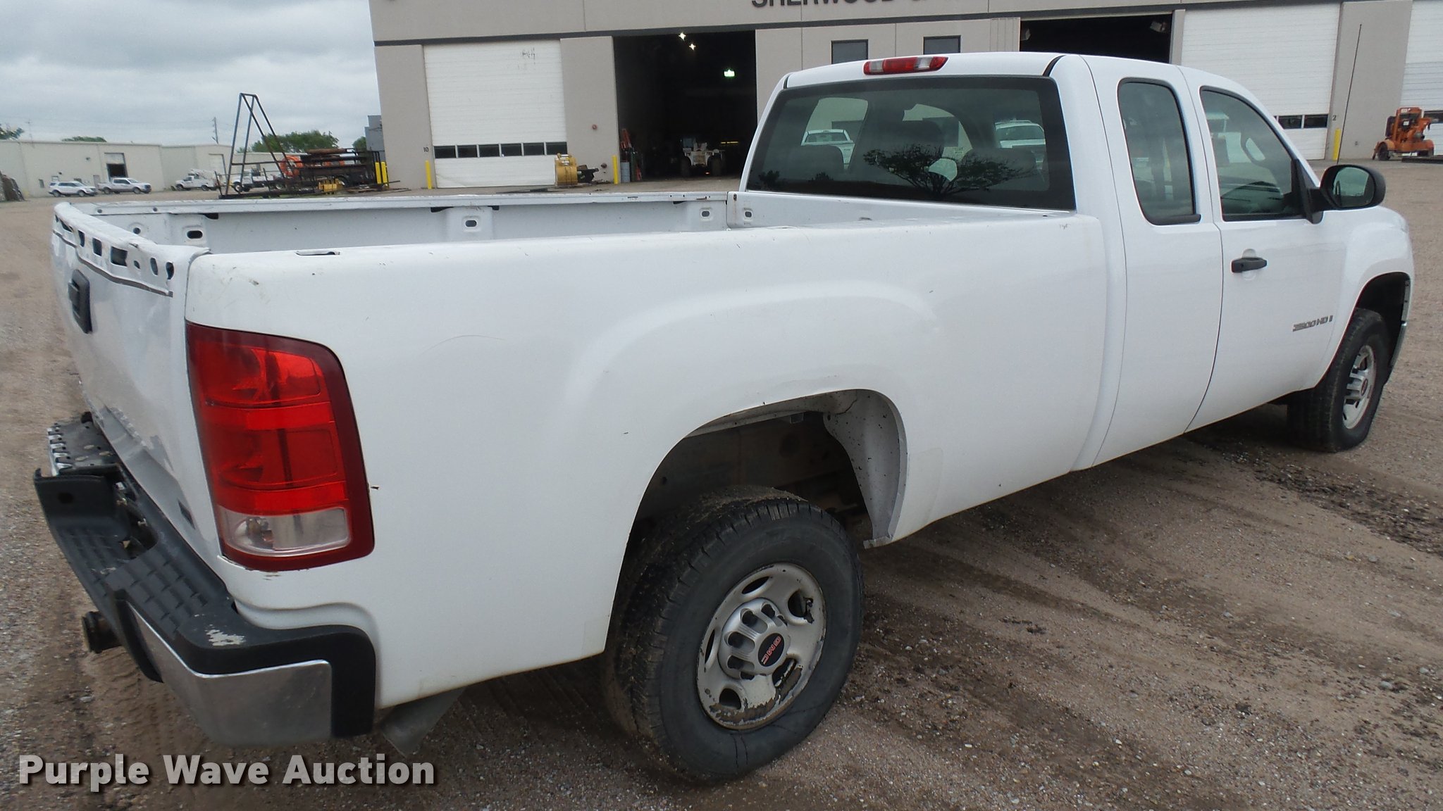 2008 GMC Sierra 2500HD Ext. Cab pickup truck. 161,682 miles on odometer, 6.0L V8 16V OHV gas engine, Automatic transmission, AC and heat, Tilt, Cruise, AM/FM/CD, Manual windows and locks, Cloth interior, Front tow hooks, Receiver hitch, Trailer wiring, 245/75R16 tires, Rear bumper cover damage, Tailgate damage, Unit# 02.59W. Kansas title. 1GTHC29K88E125739. Sherwood Construction Co.. 3219 W May St. Wichita, KS 67213