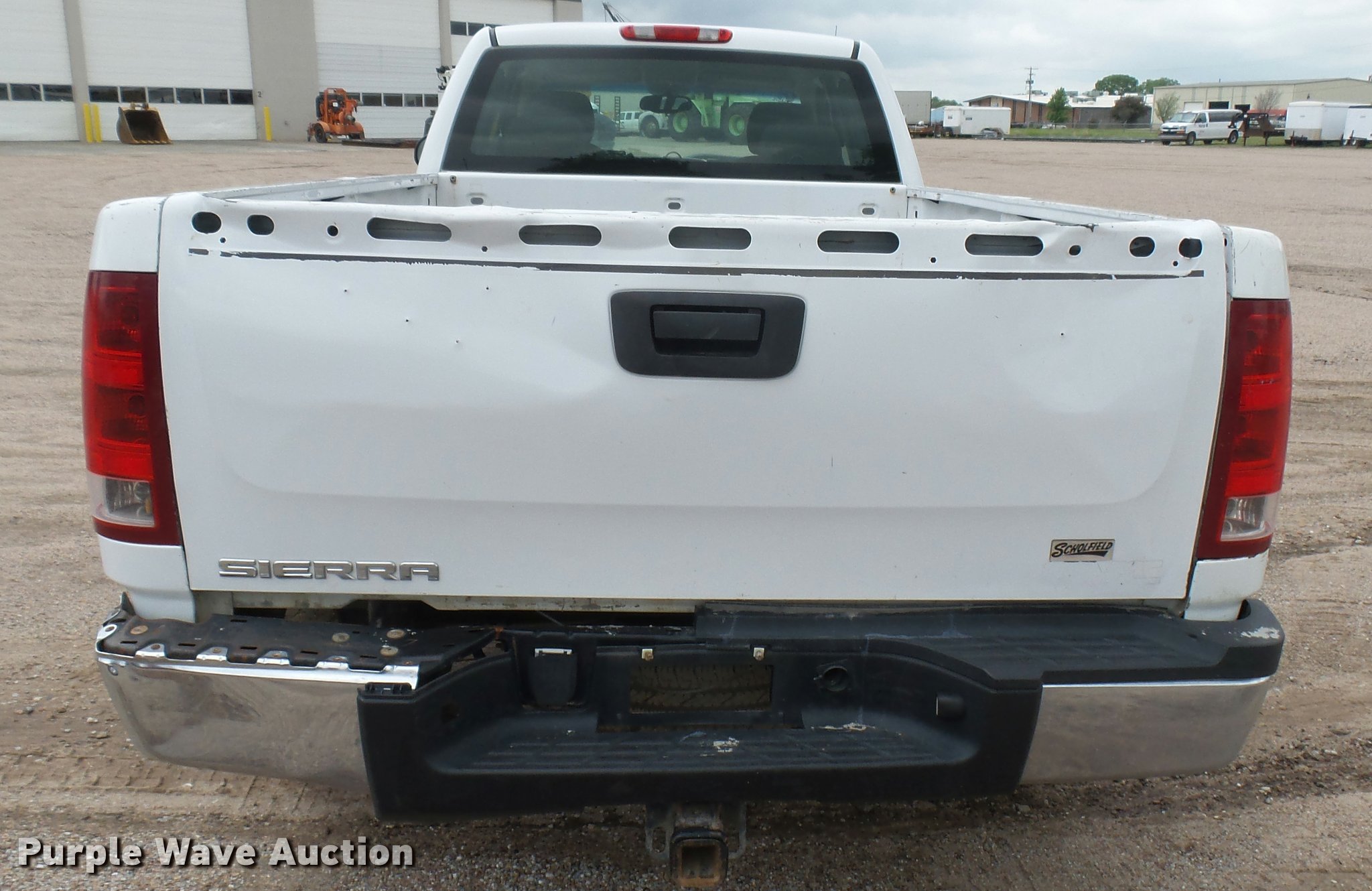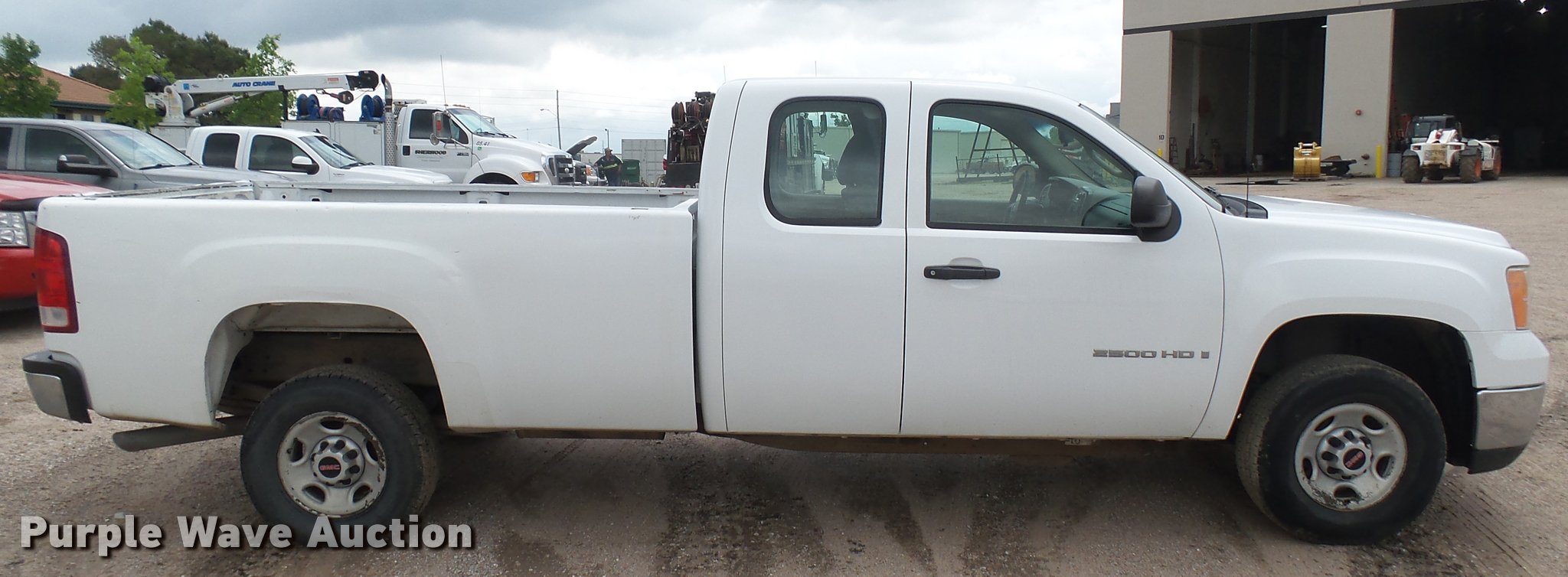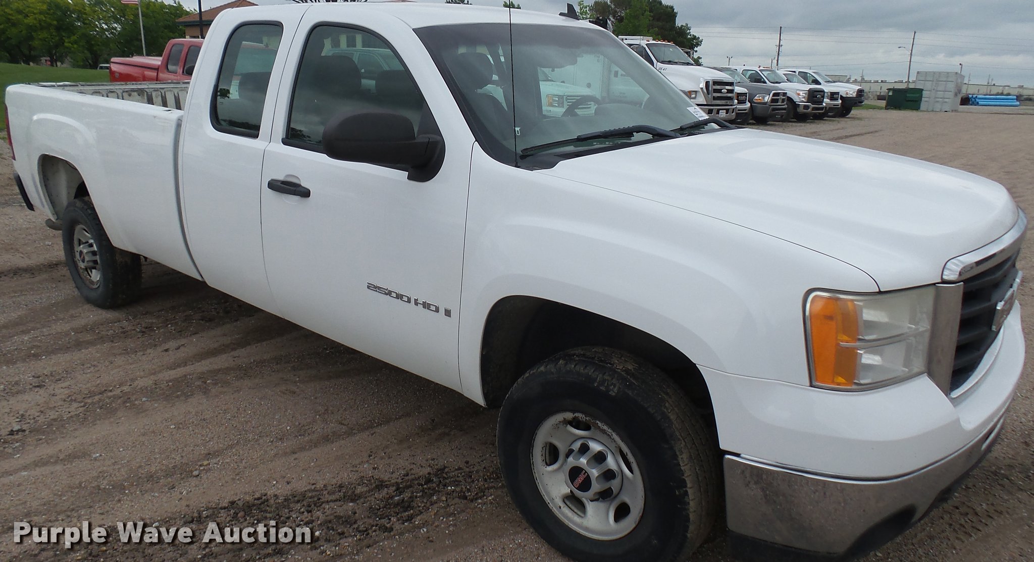2008 GMC Sierra 2500HD Ext. Cab pickup truck. 161,682 miles on odometer, 6.0L V8 16V OHV gas engine, Automatic transmission, AC and heat, Tilt, Cruise, AM/FM/CD, Manual windows and locks, Cloth interior, Front tow hooks, Receiver hitch, Trailer wiring, 245/75R16 tires, Rear bumper cover damage, Tailgate damage, Unit# 02.59W. Kansas title. 1GTHC29K88E125739. Sherwood Construction Co.. 3219 W May St. Wichita, KS 67213