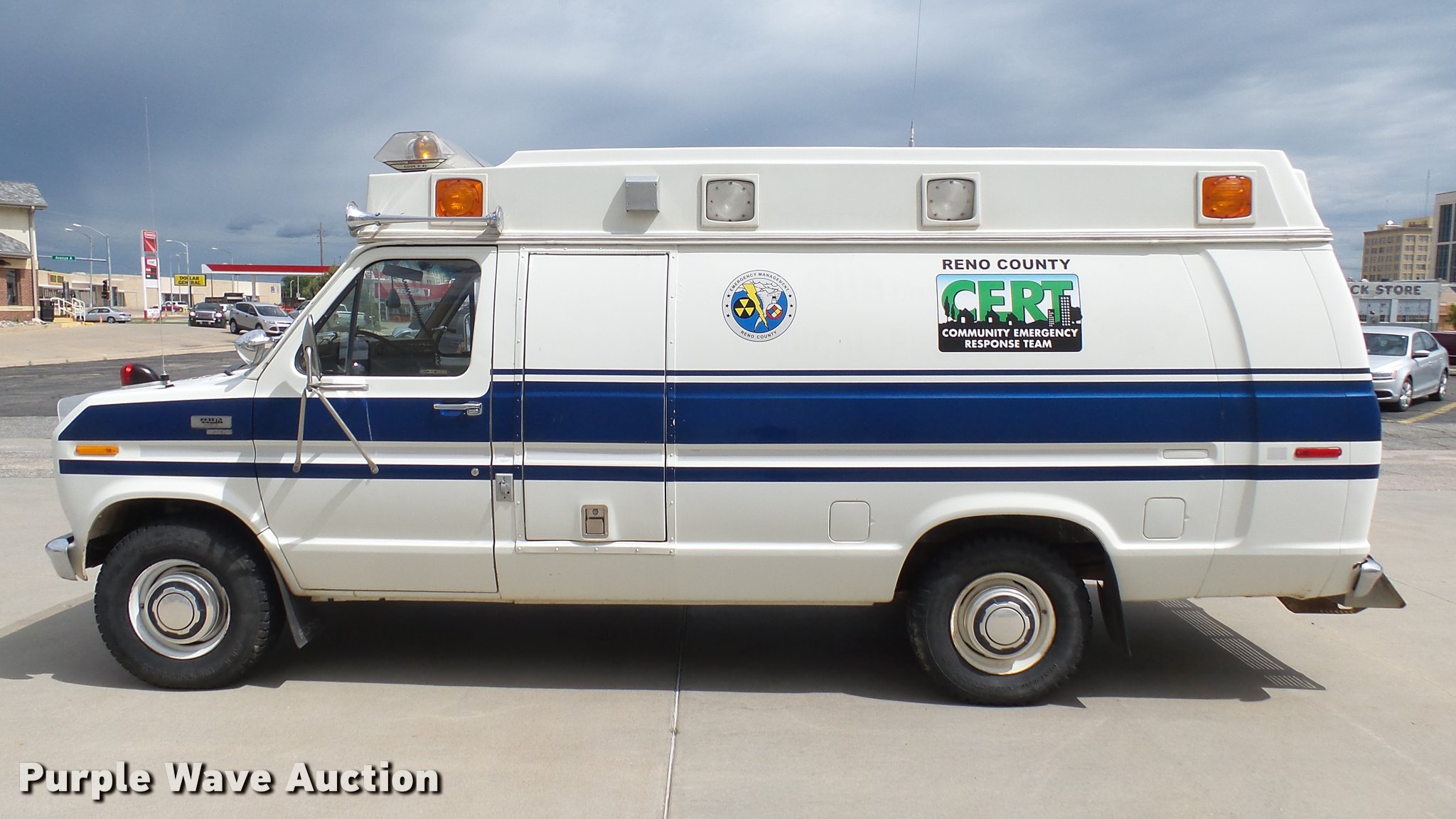 Purple Wave is selling a used Fire Truck or Emergency Vehicle in Kansas. This item is a 1984 Ford Econoline E350 Super Collins ambulance with the following: 4,603 miles on odometer, Actual mileage unknown, 7.5L V8 OHV 16V gas engine, Automatic transmission, AC and heat, AM/FM, Manual windows and locks, Vinyl interior, Light package, 9.50R16.5 tires