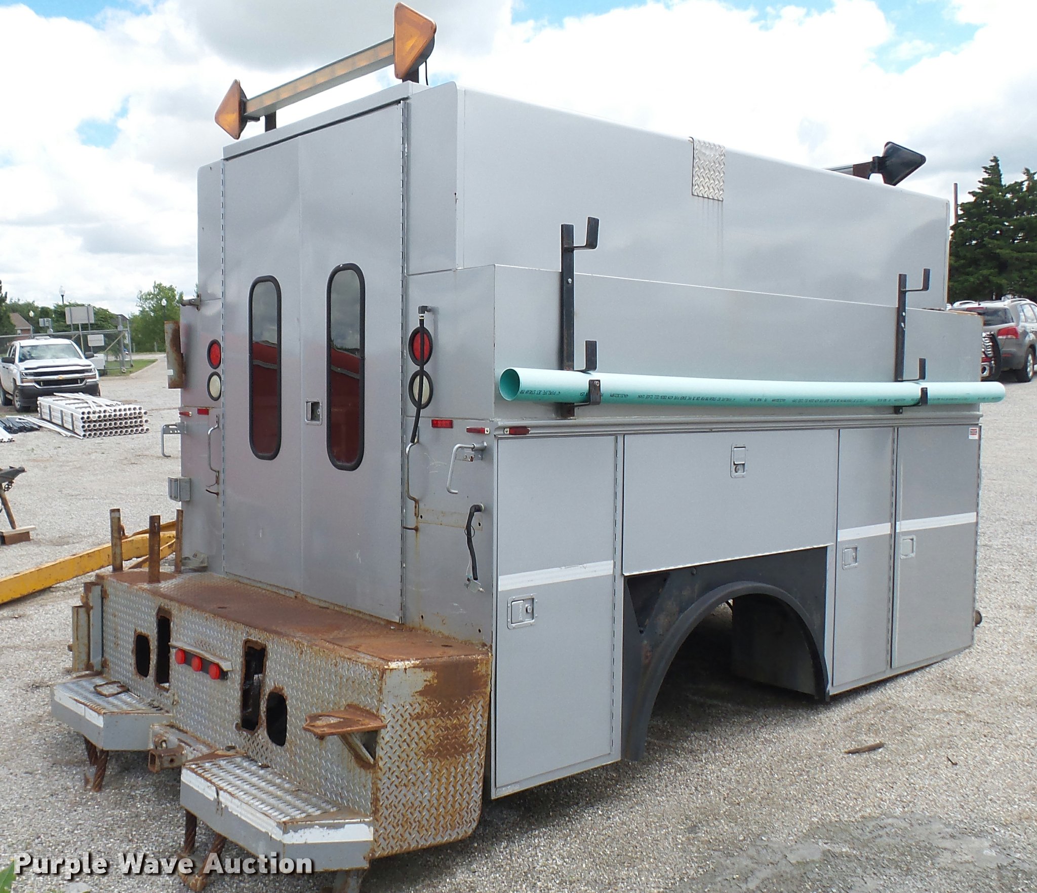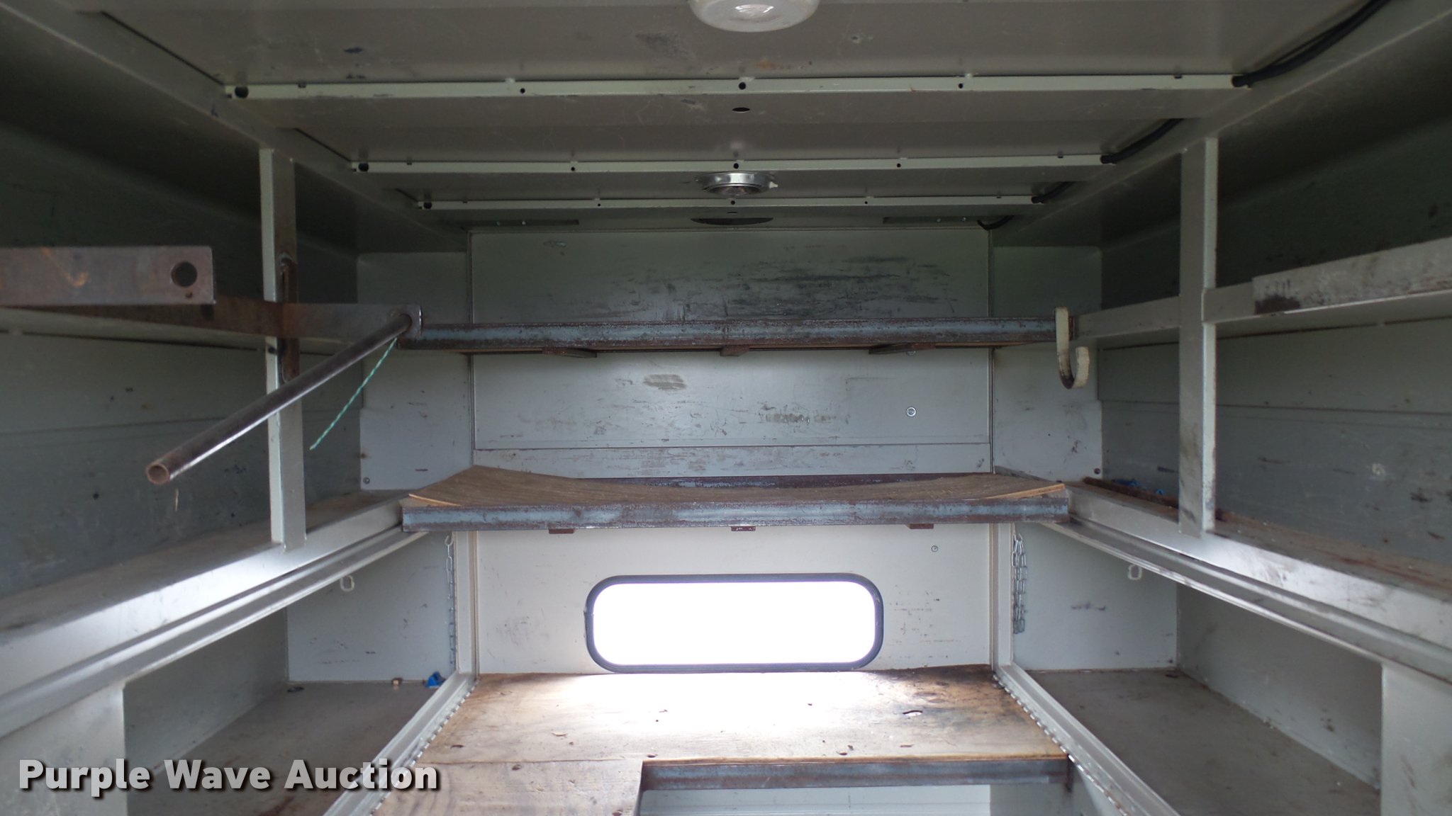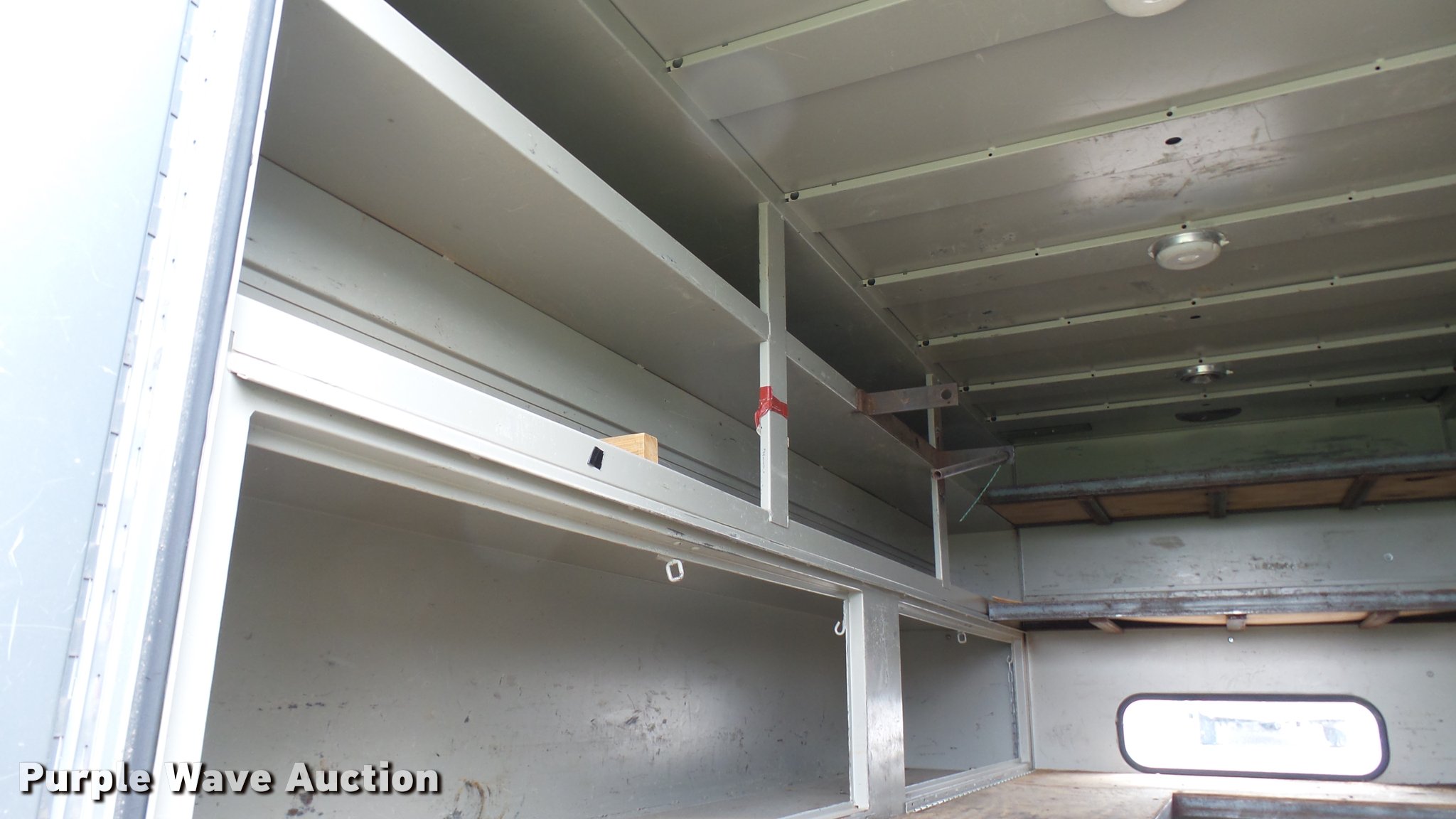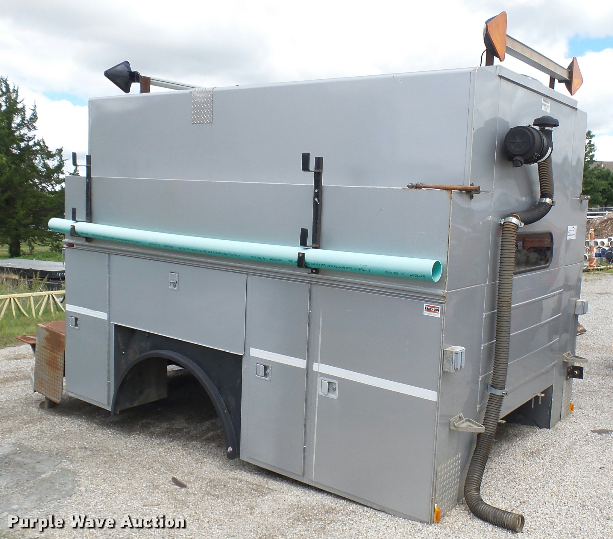 Purple Wave is selling a used Automotive Parts or Acces. in Kansas. This item is a Knapheide steel utility bed with the following: 11'L x 8'W, (8) compartments, Shelving, Rear swing doors, Lights, Receiver hitch