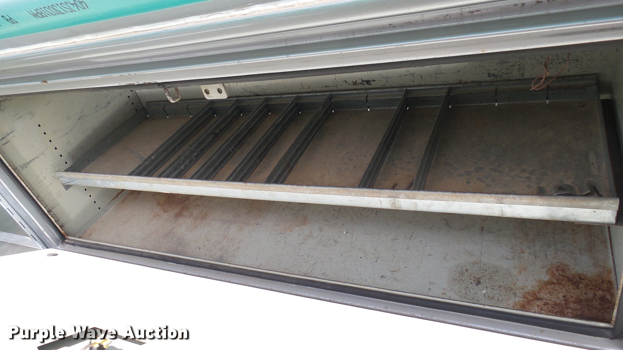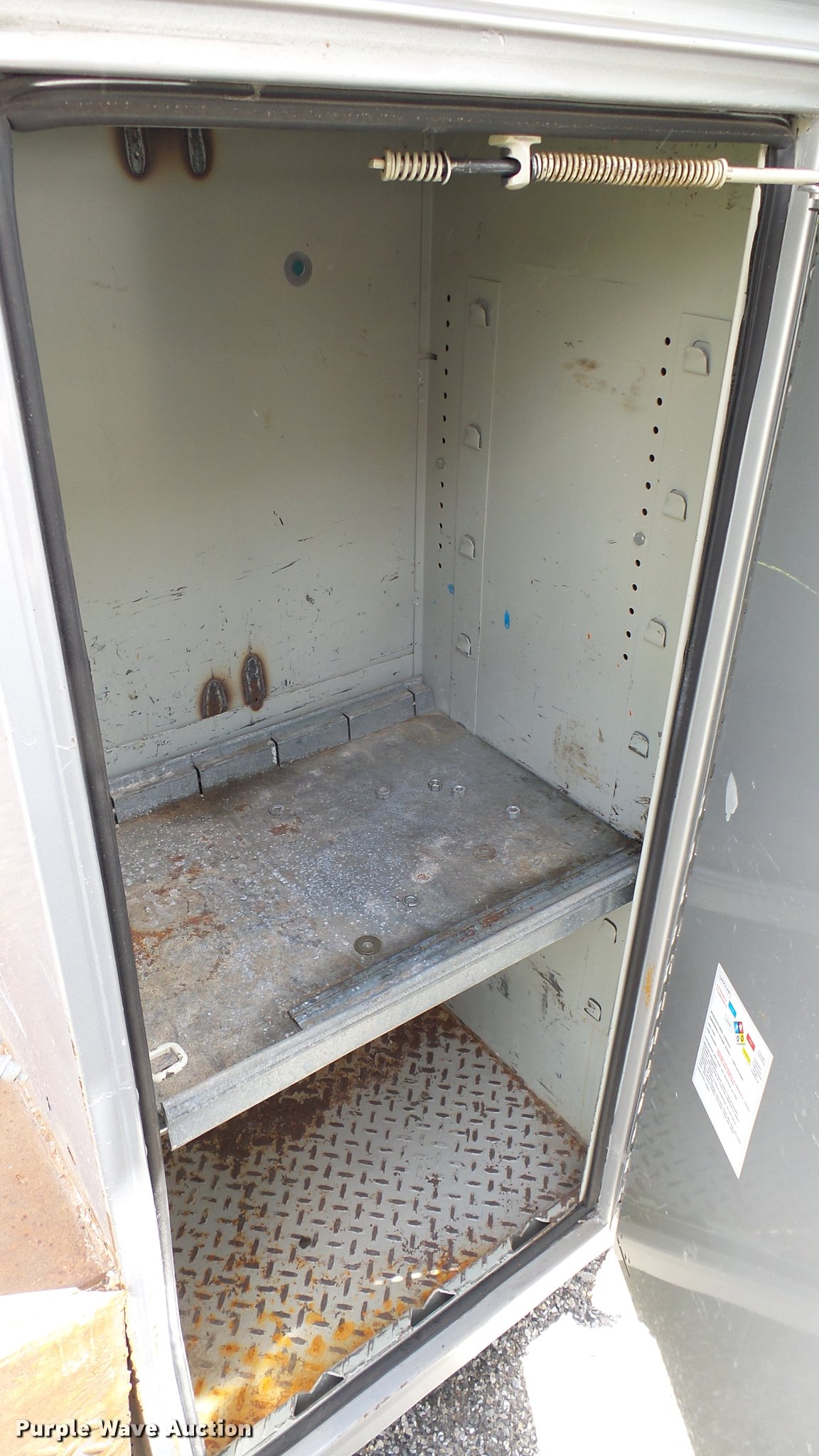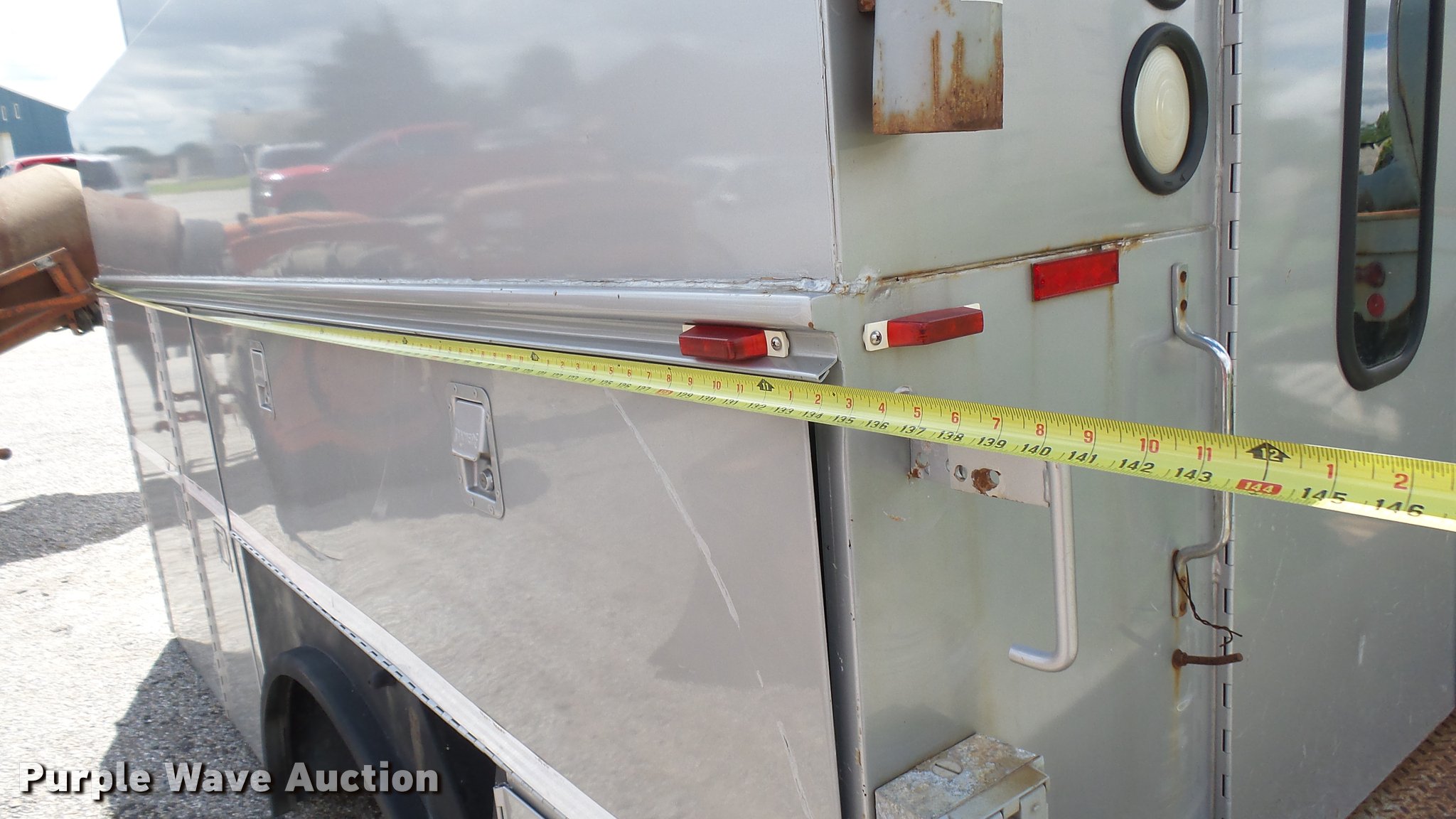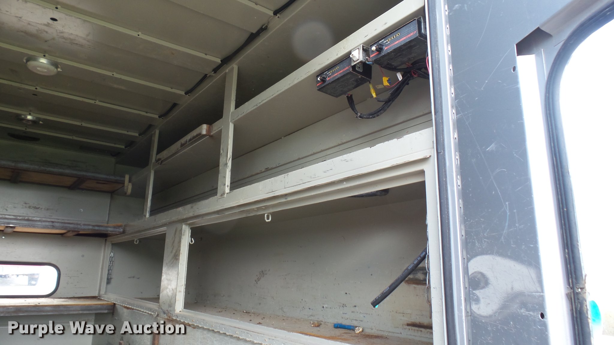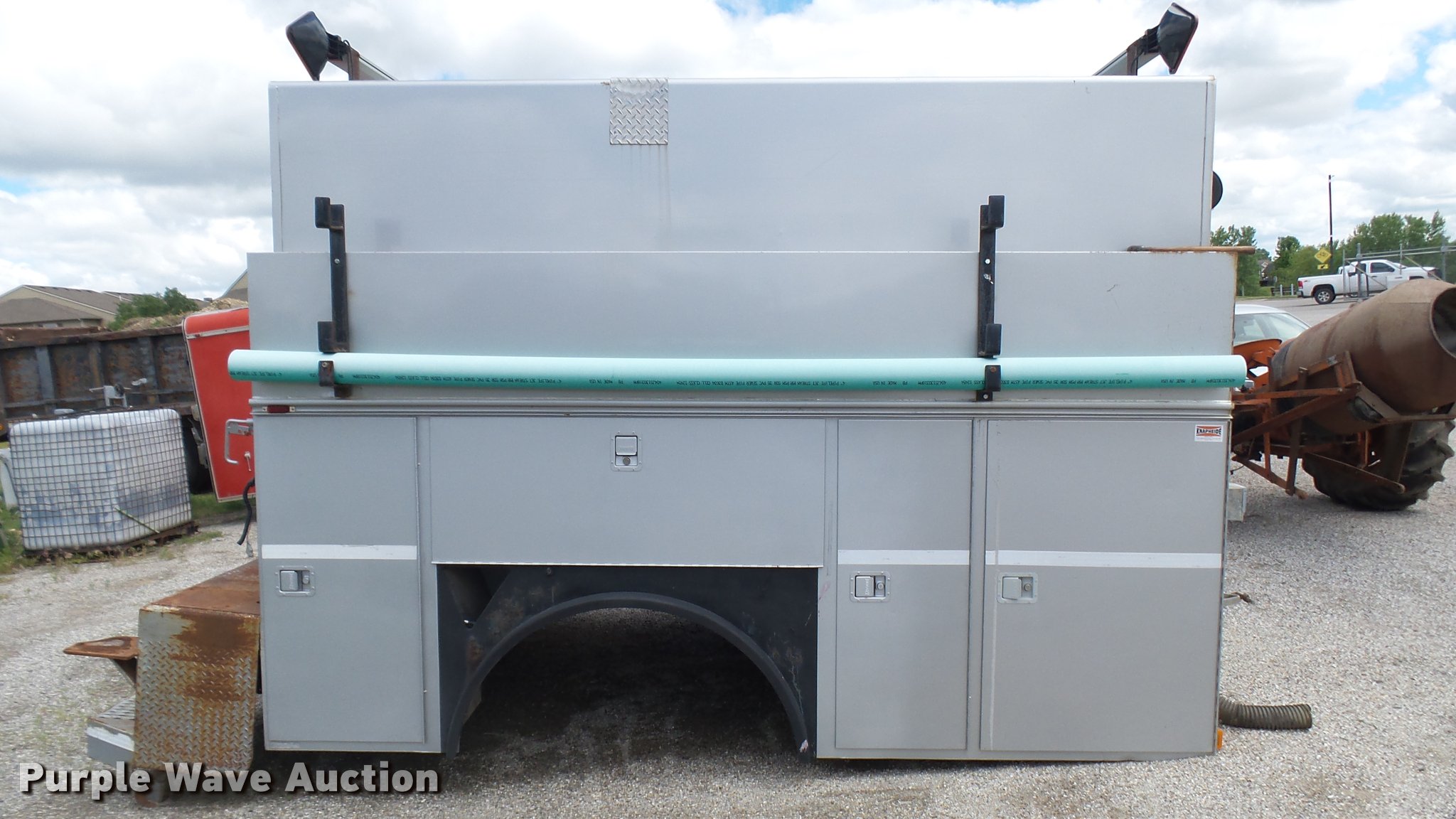 Purple Wave is selling a used Automotive Parts or Acces. in Kansas. This item is a Knapheide steel utility bed with the following: 11'L x 8'W, (8) compartments, Shelving, Rear swing doors, Lights, Receiver hitch