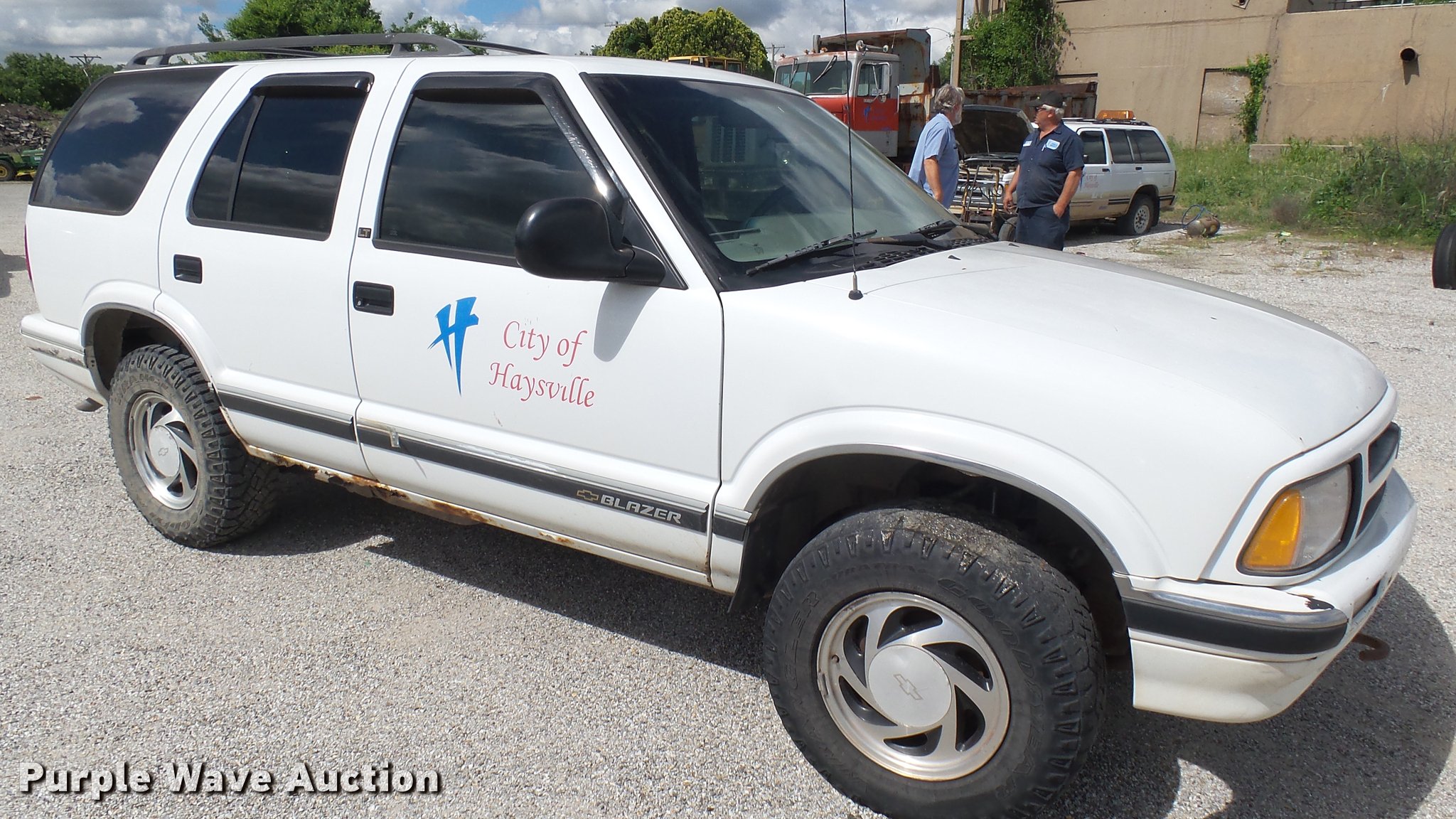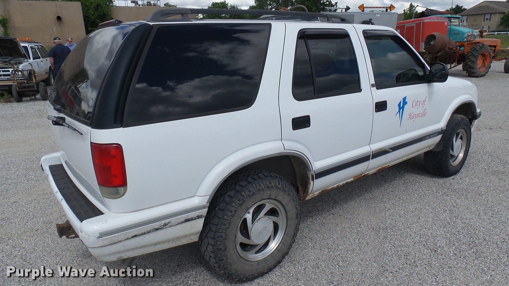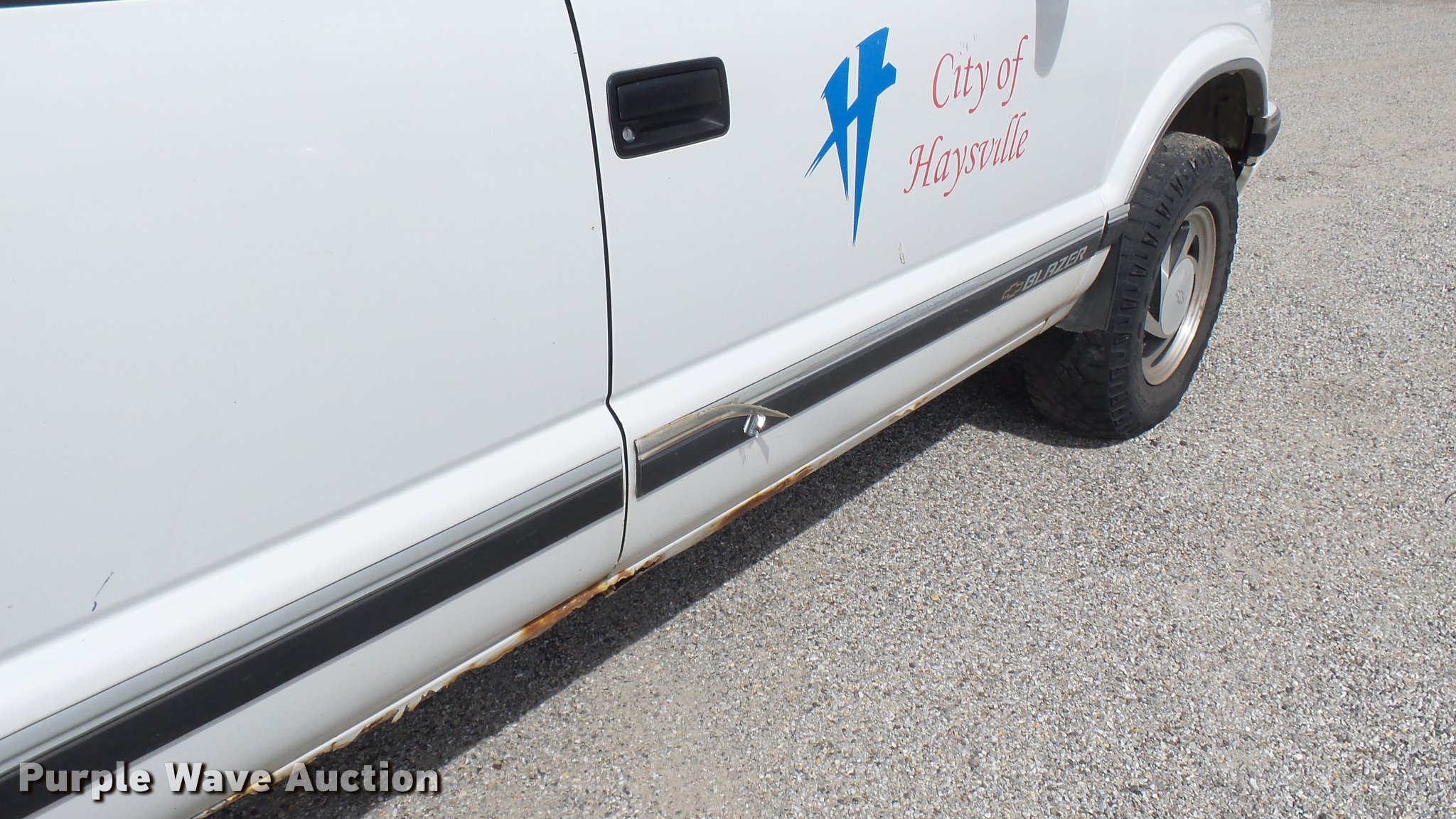 1997 Chevrolet Blazer SUV. 199,567 miles on odometer, 4.3L V6 OHV 12V gas engine, Automatic transmission, Four wheel drive, AC and heat, AM/FM/CD, Power windows, locks, and mirrors, Leather interior, Front tow hooks, Receiver hitch, 235/75R15 tires, Rust, Seats damaged, Deals will be removed prior to auction. Kansas title. 1GNDT13W3VK230343. City of Haysville. Haysville, KS 67060