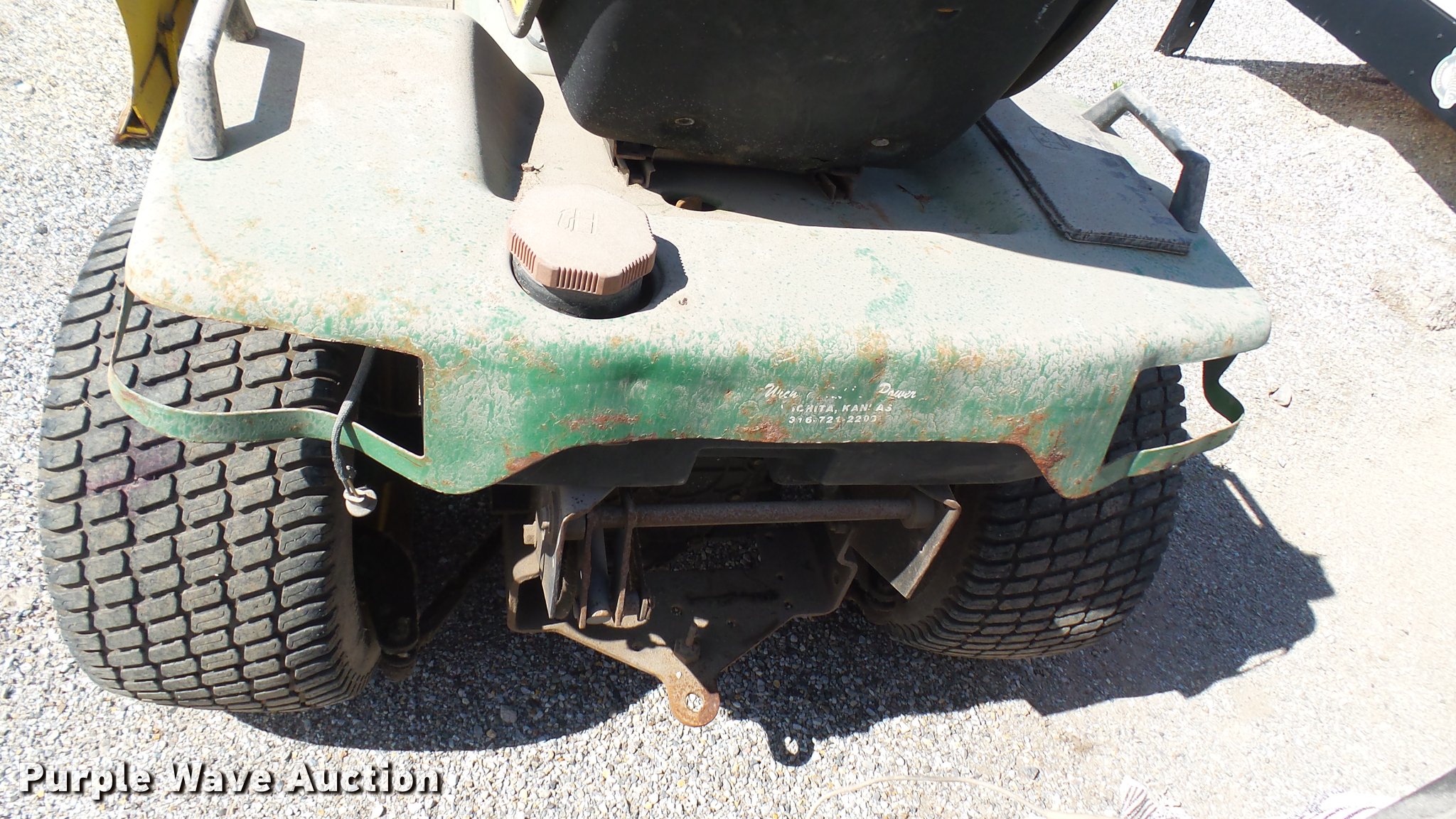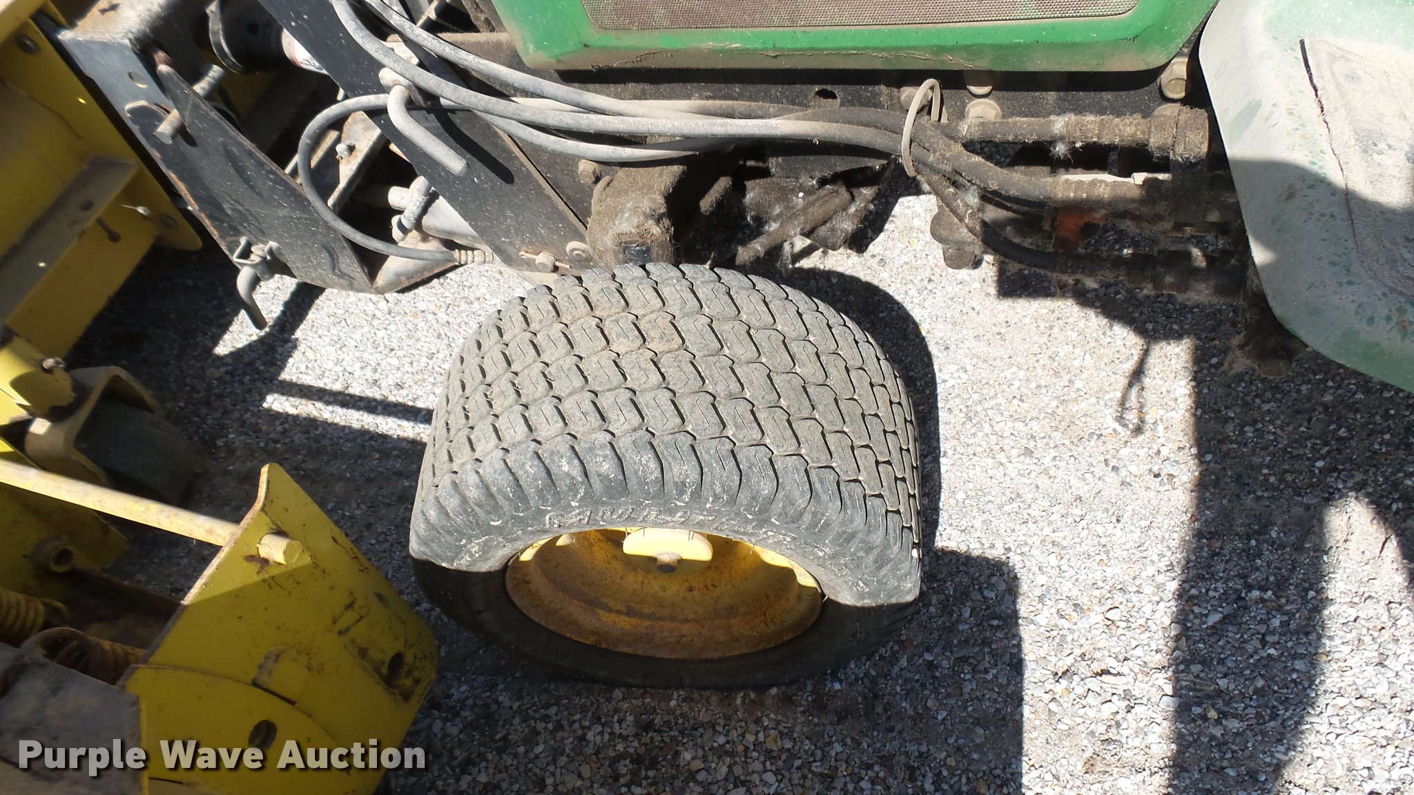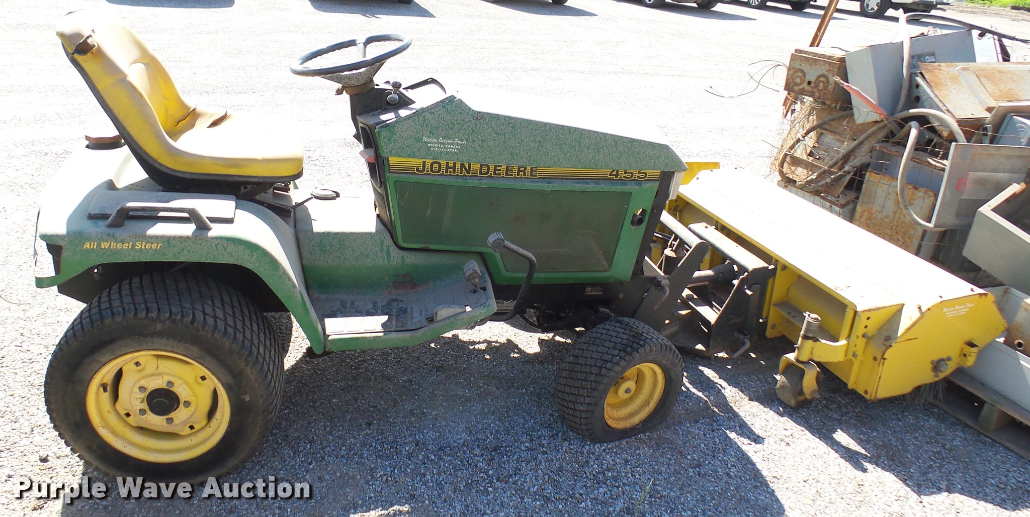 Purple Wave is selling a used Lawn Mower in Kansas. This item is a John Deere 455 lawn mower with the following: 60" cut, Three cylinder diesel engine, All wheel steer, Lights, 55"W blade, 52"W broom, 23x10.50-12 tires, Leaks oil