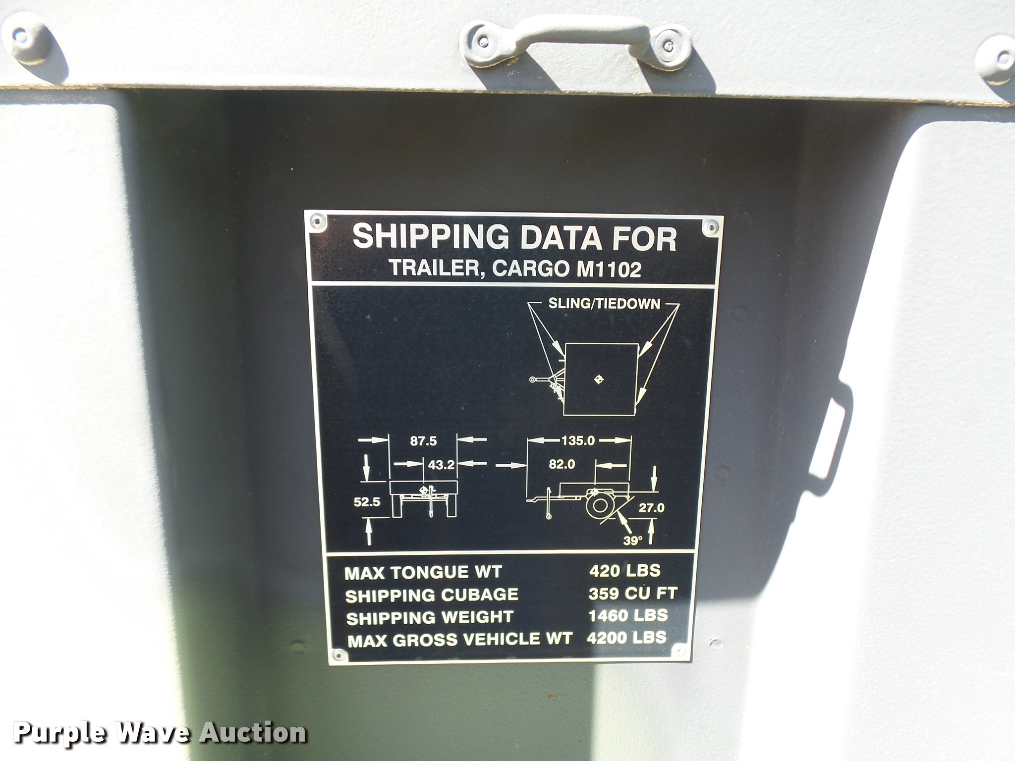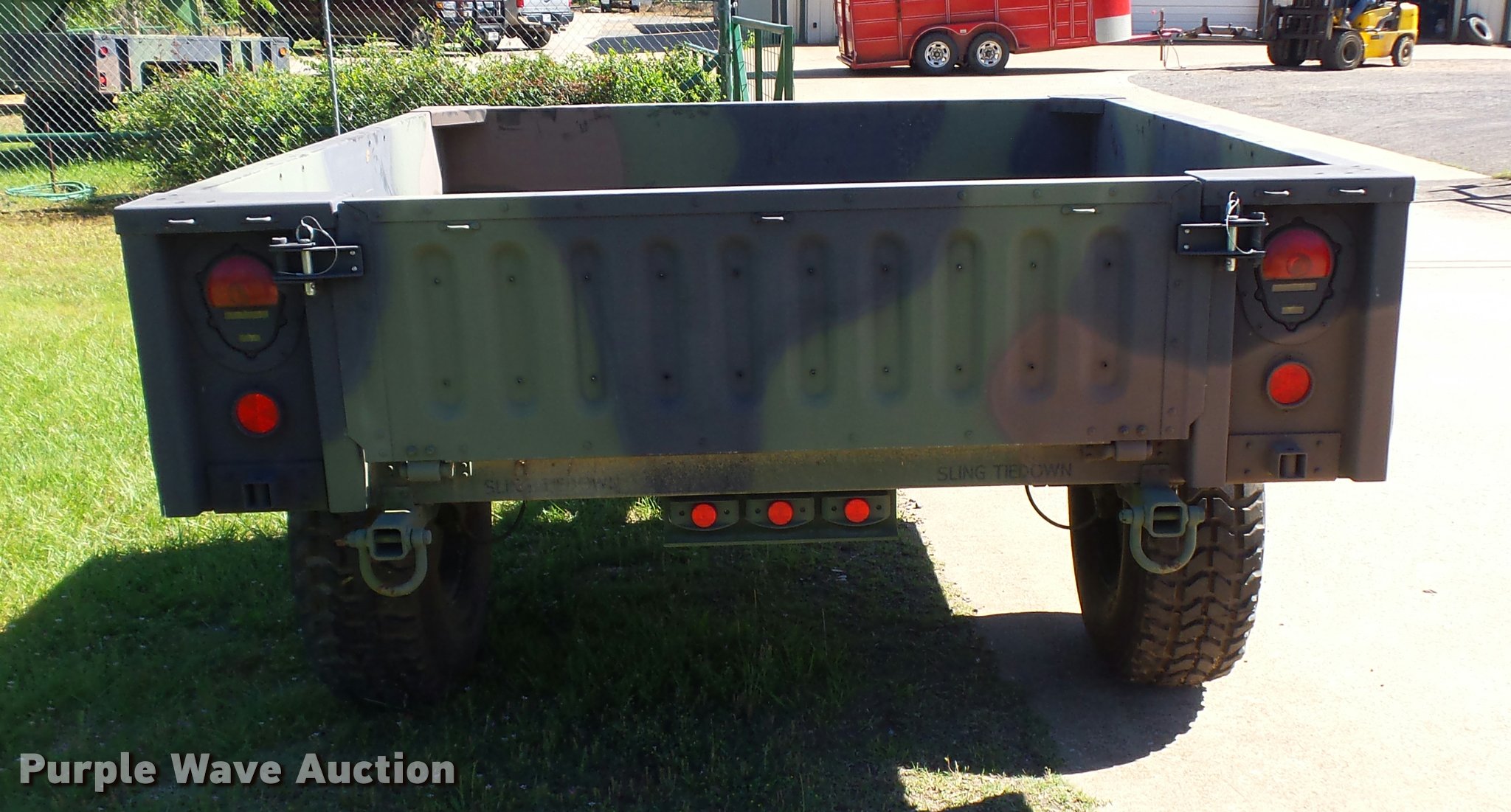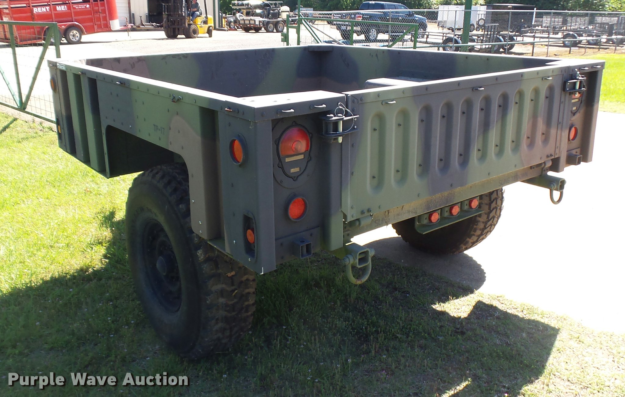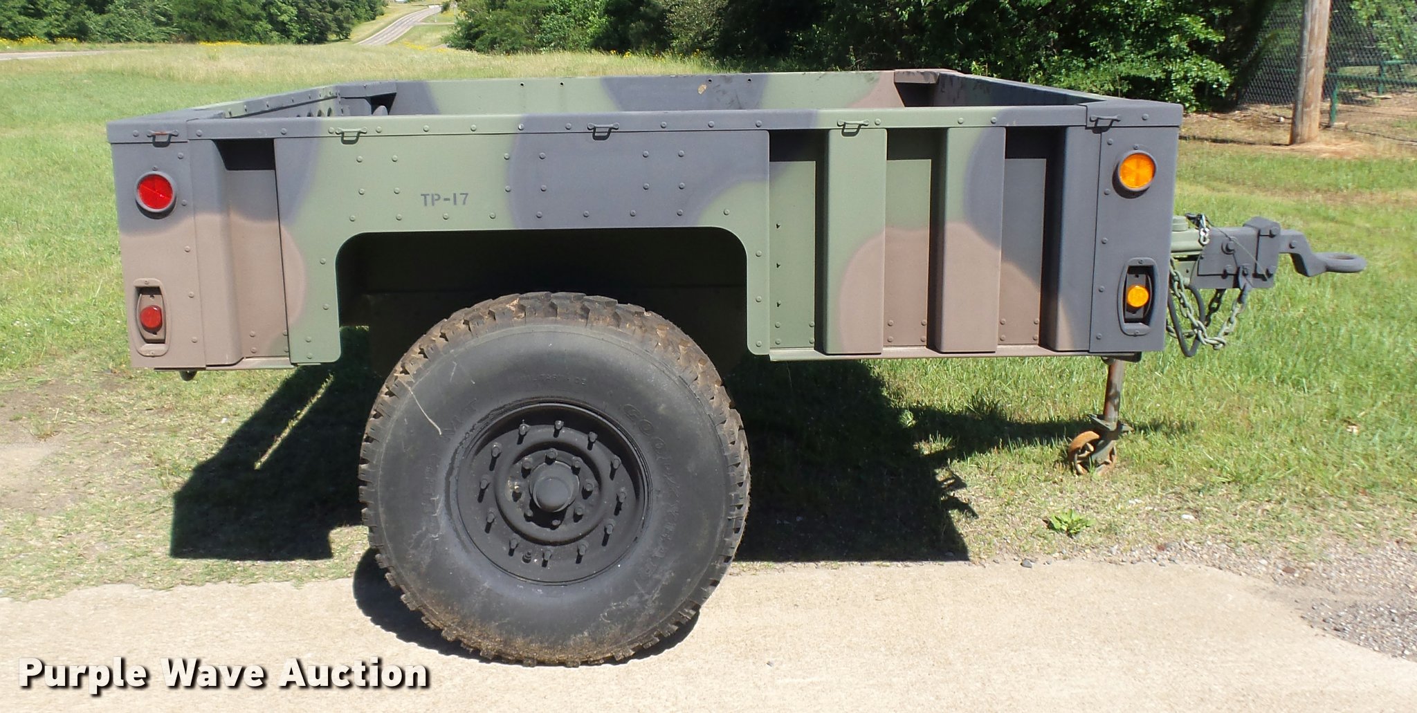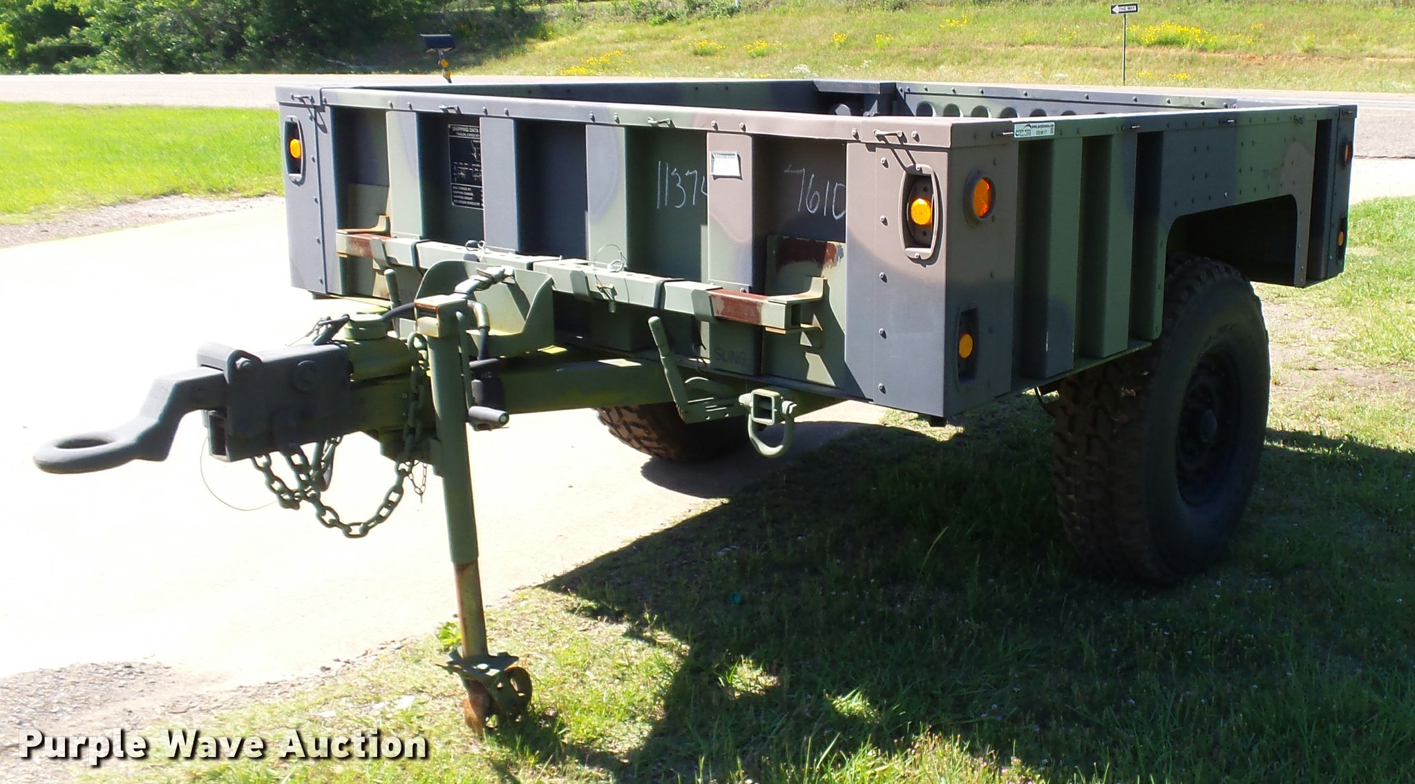 Purple Wave is selling a used Car or Utility Trailer in Texas. This item is a 2013 U.S. Military M-1102 utility trailer with the following: 132"L x 85"W, 2,740 lbs max payload, Pintle hitch, Single leg landing gear, Single axle, Eight hole wheels, 37x12.50R16.5 tires, GVWR 4,200 lbs