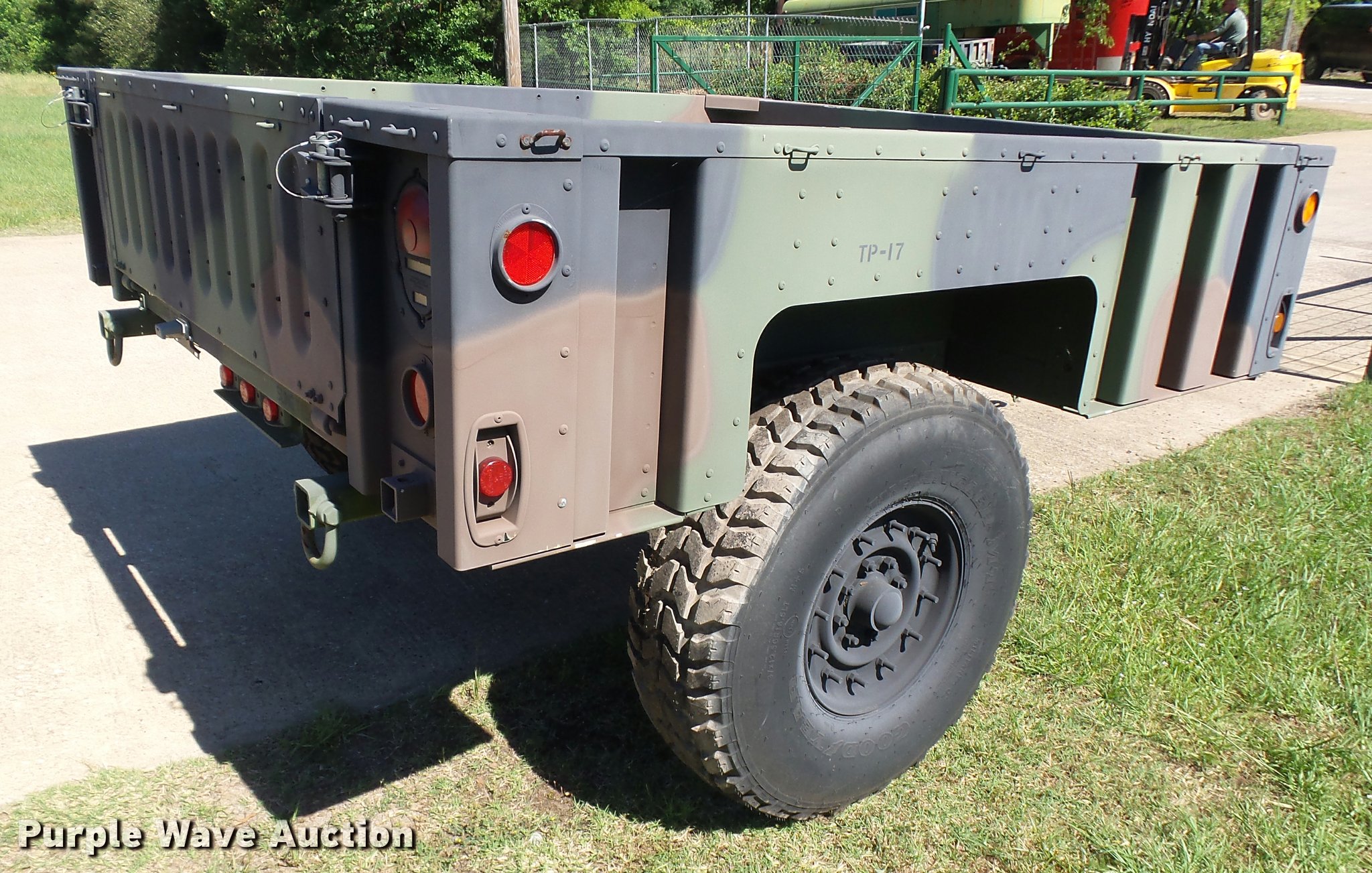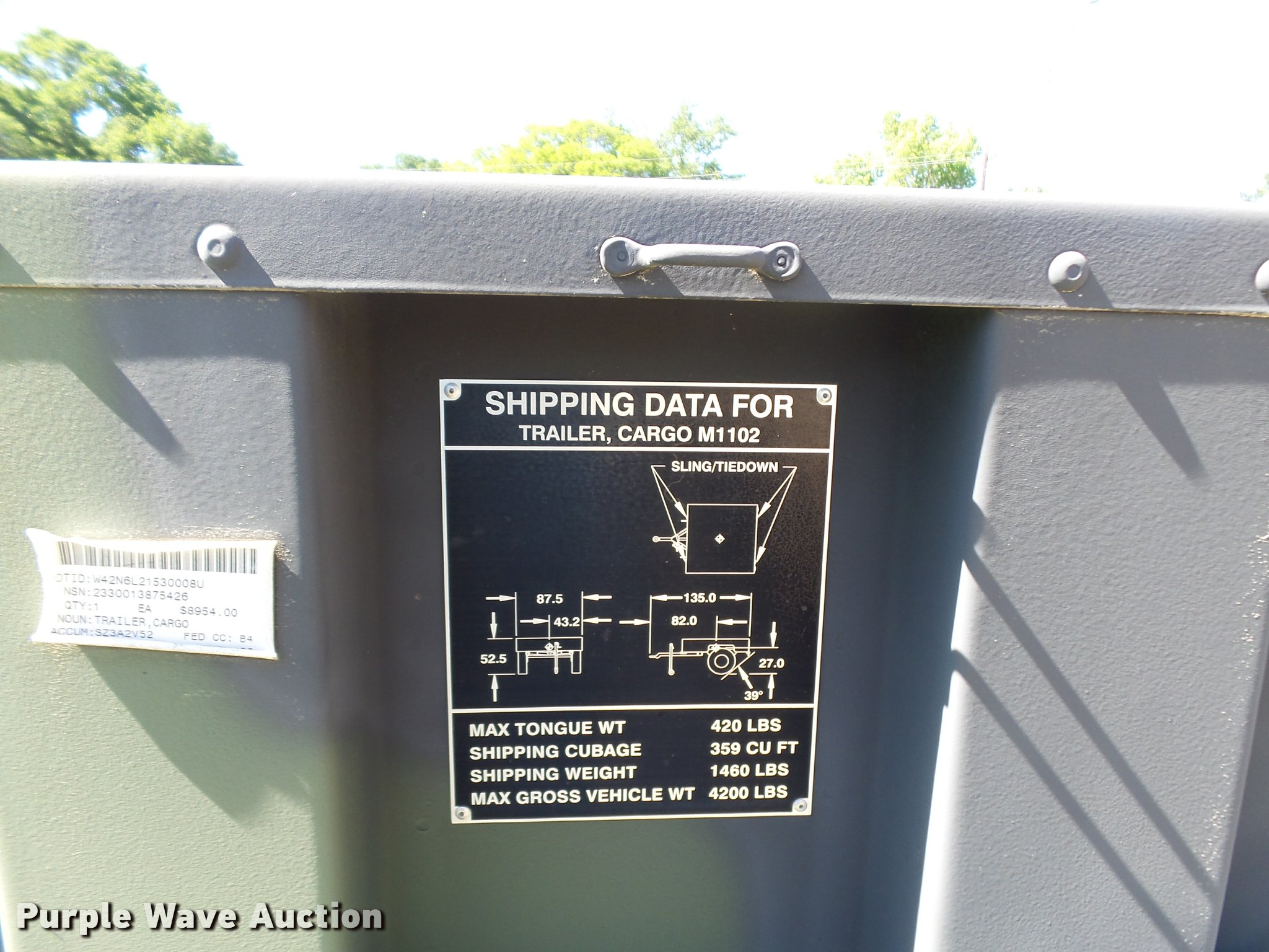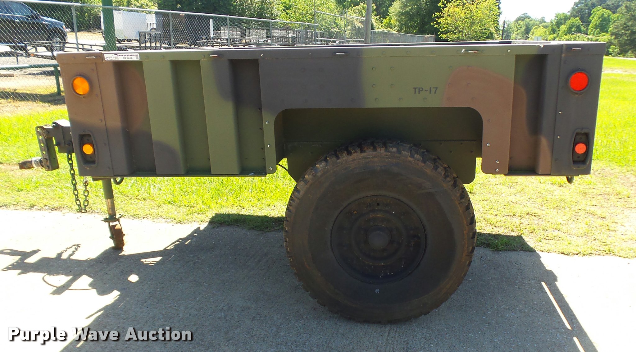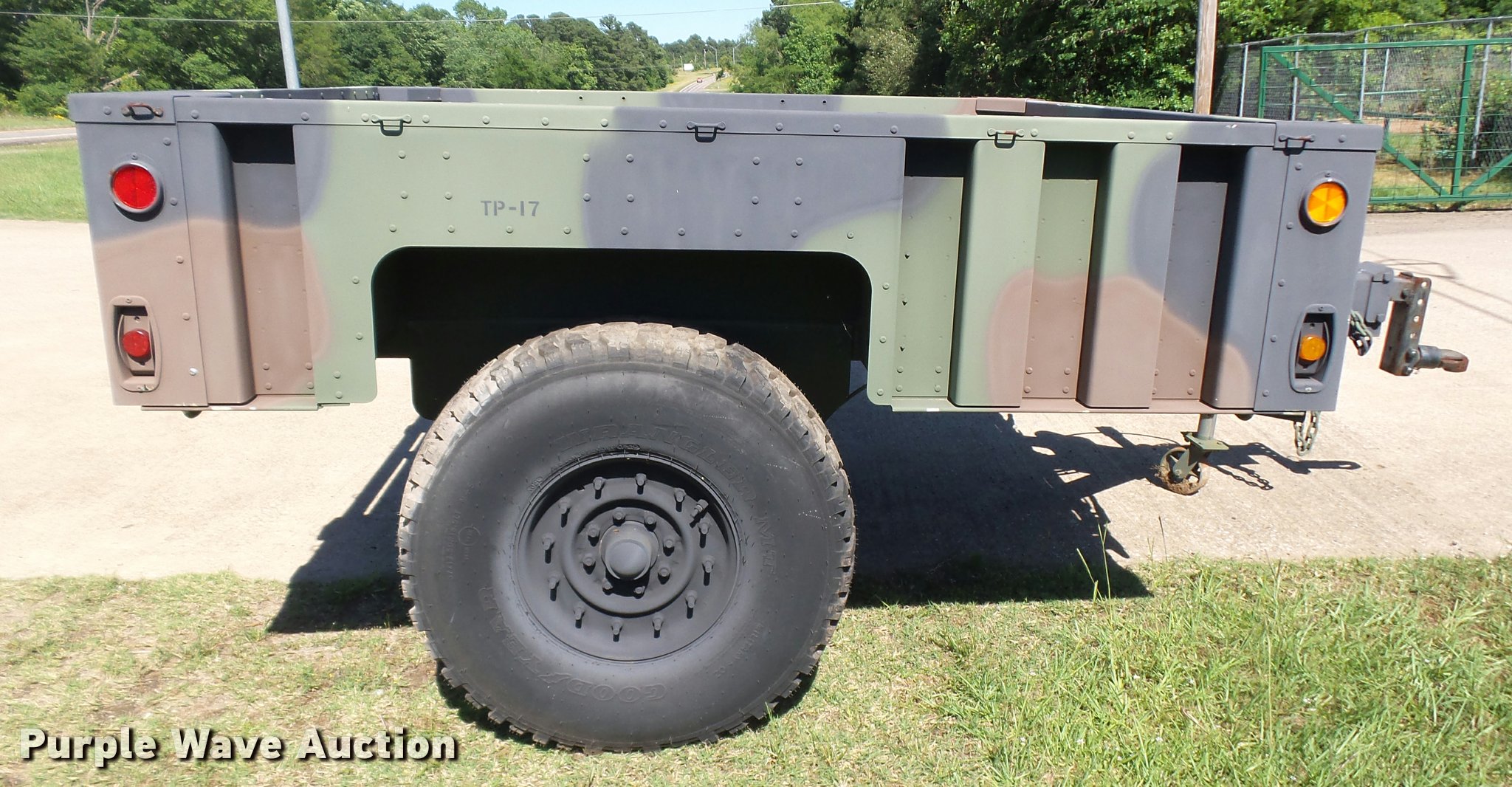 Purple Wave is selling a used Car or Utility Trailer in Texas. This item is a 2013 U.S. Military M-1102 utility trailer with the following: 132"L x 85"W, 2,740 lbs max payload, Ball hitch, Single leg landing gear, Single axle, Eight hole wheels, 37x12.50R16.5 tires, GVWR 4,200 lbs