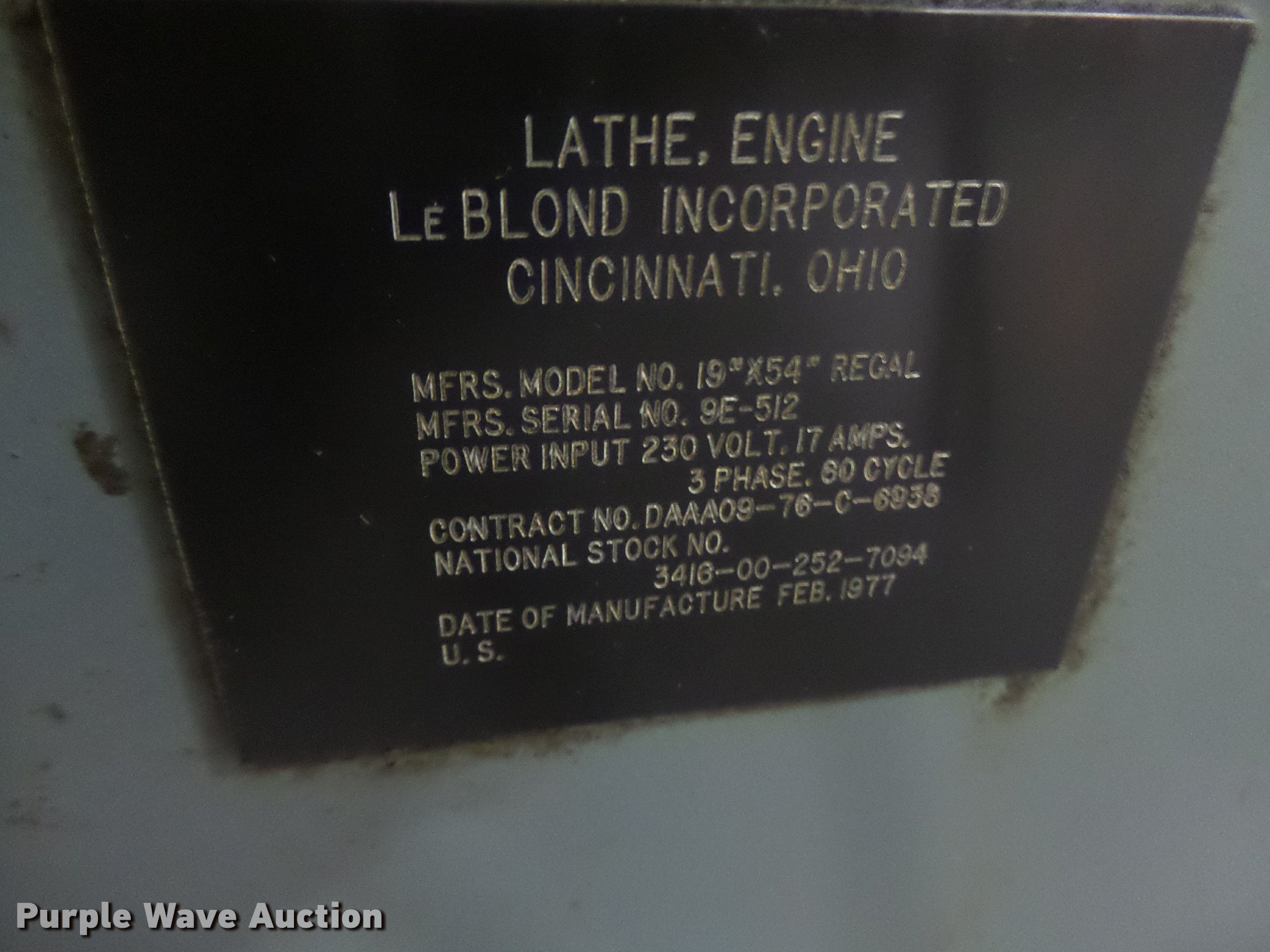 Purple Wave is selling a used Lathes, Manual in Missouri. This item is a Leblond Regal lathe with the following: 19" x 54", Three phase, 220V, Center rest, Follow rest, Four jaw chuck, Three jaw chuck, Face plate, Drive in plate, Rubber flex collet chuck, Tapper attachment
