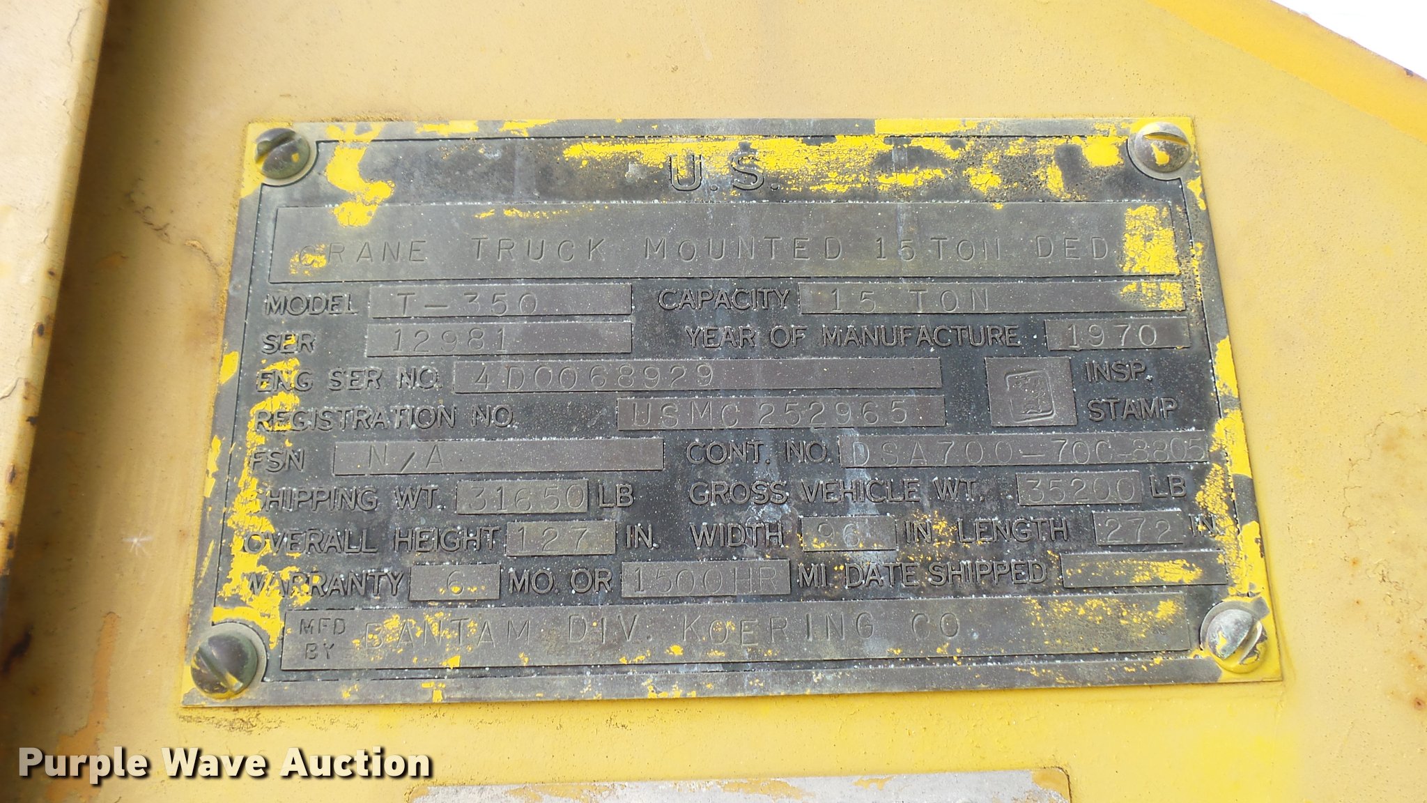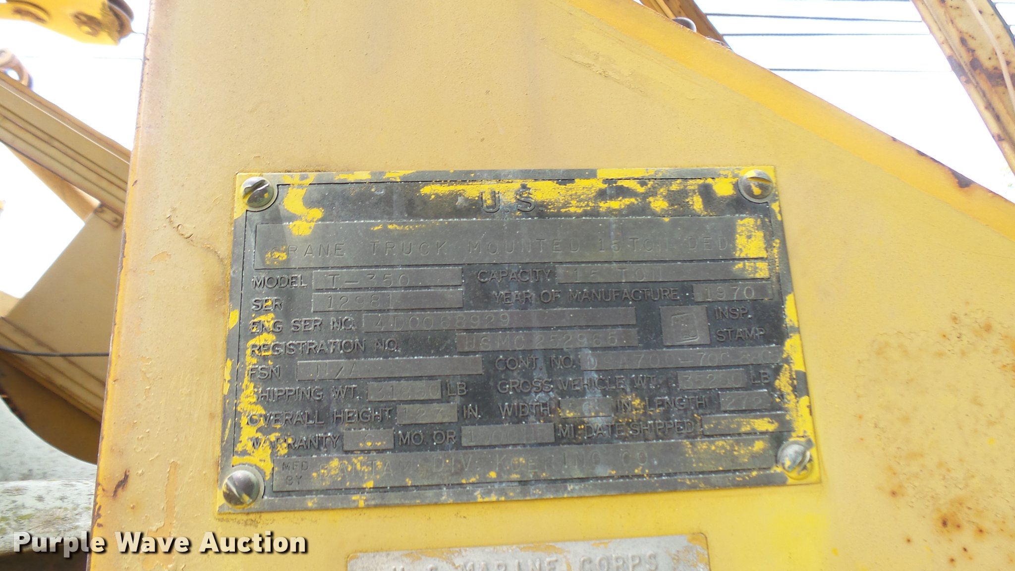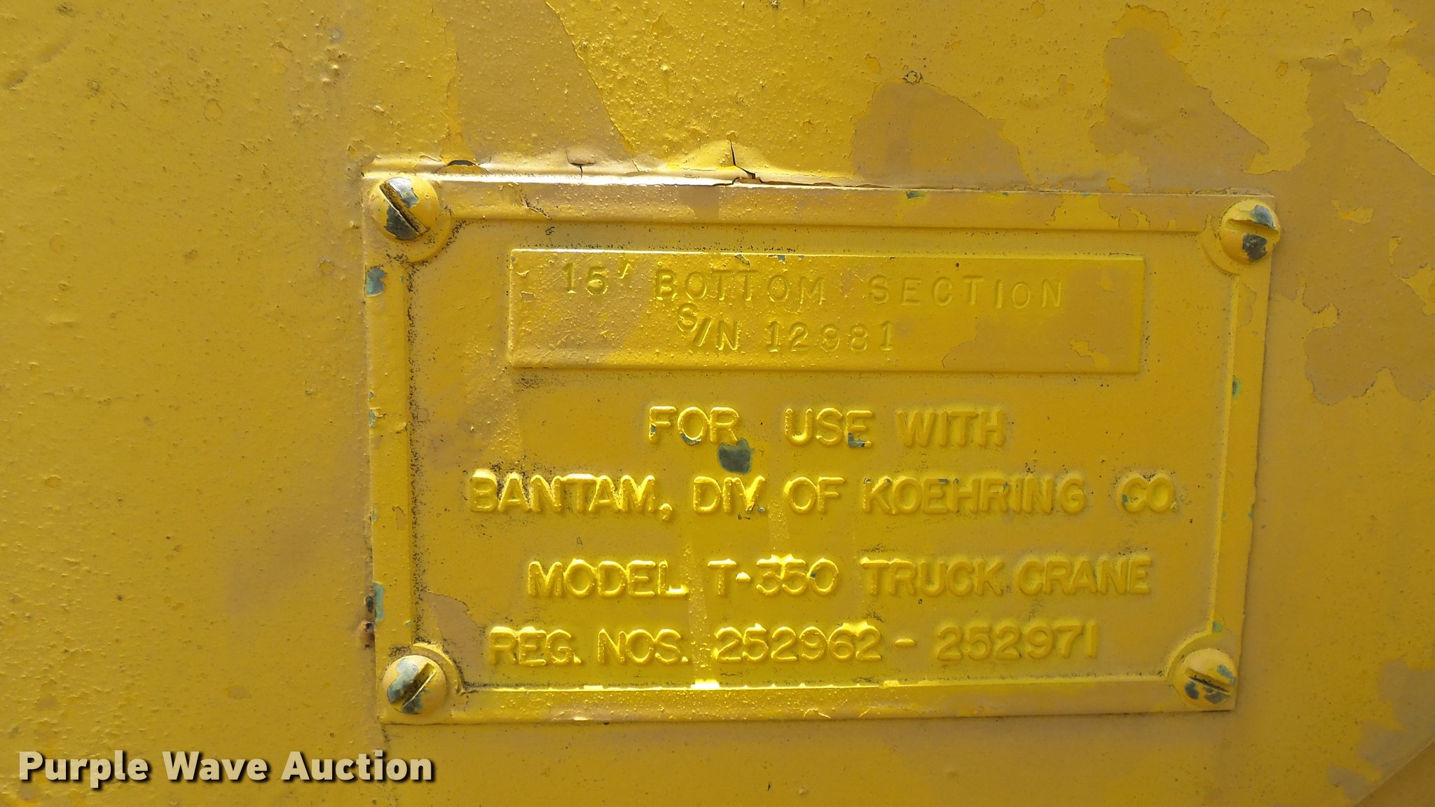 Purple Wave is selling a used Truck Crane in Kansas. This item is a 1970 Bantam T-350 truck crane with the following: Detroit Diesel upper and lower engines, Manual transmission, Stick crane control, 30' boom, 15 ton capacity, GVWR 32,500 lbs, Non-operational unit, Serial 12981