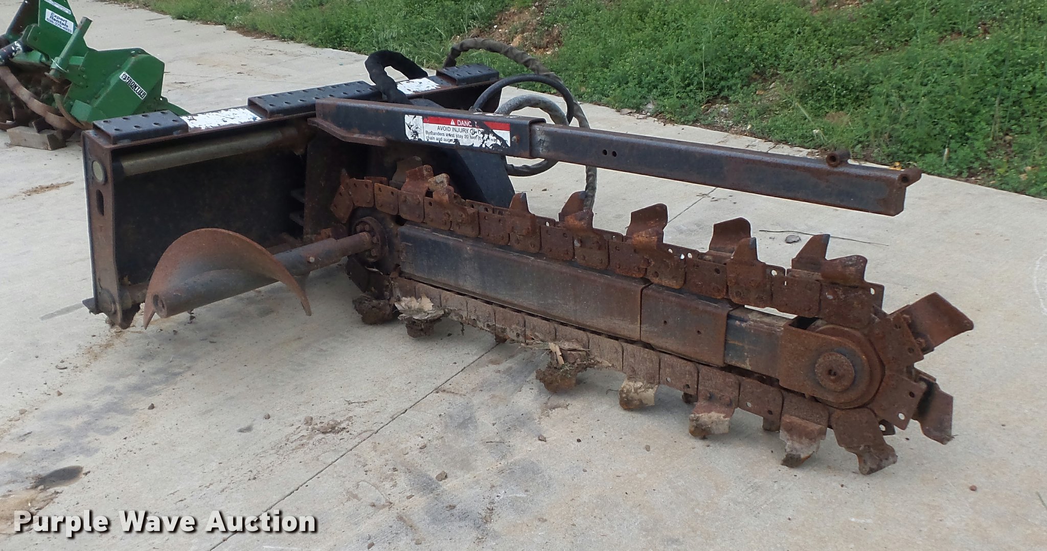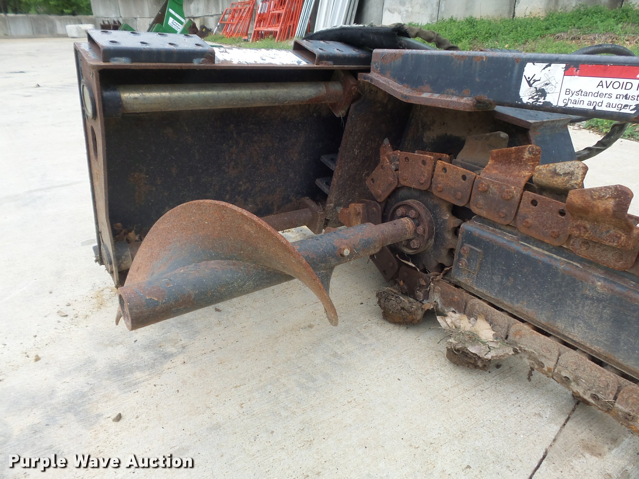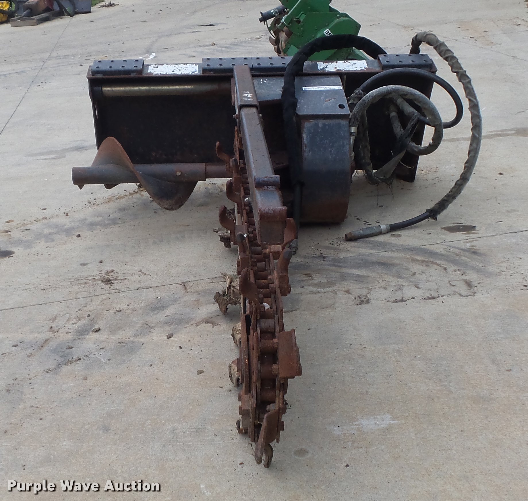 Purple Wave is selling a used Skid Steer Attach. in Missouri. This item is a Bobcat LT313 skid steer trencher with the following: 48" maximum digging depth, 6" cutting width, Shark tooth combination chain, Manual sliding offset, Mounting frame cracked, Hydraulic quick coupler missing, Hydraulic motor leak, Serial 045406138