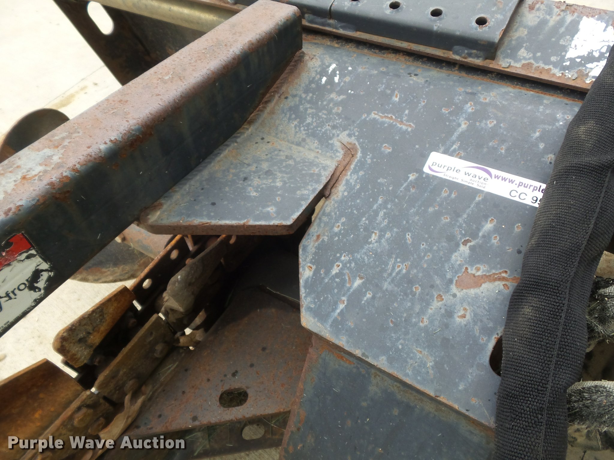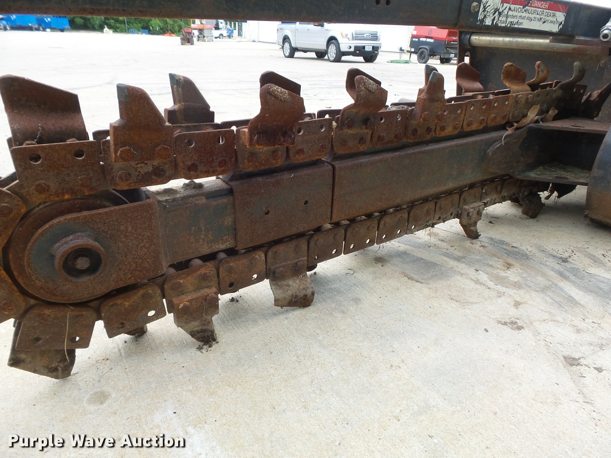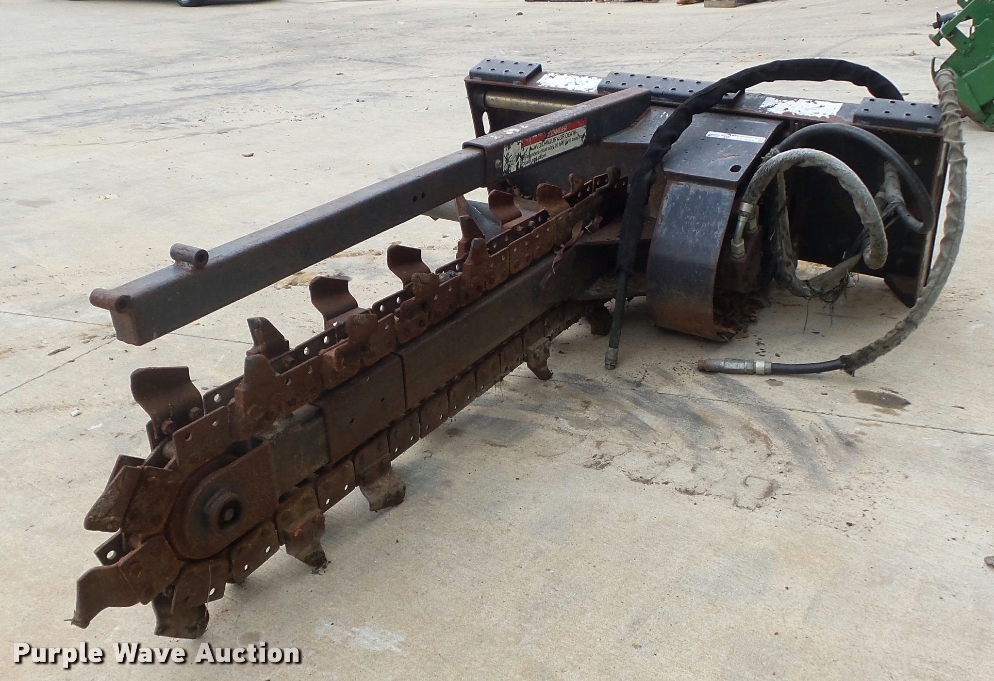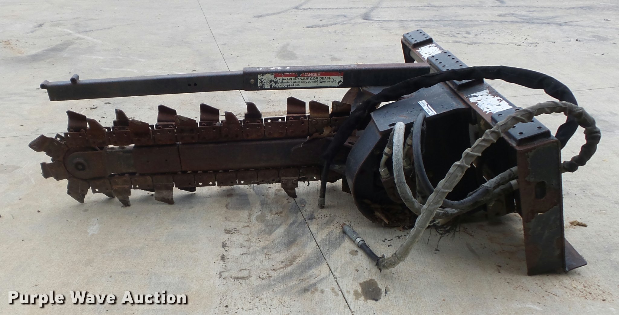 Purple Wave is selling a used Skid Steer Attach. in Missouri. This item is a Bobcat LT313 skid steer trencher with the following: 48" maximum digging depth, 6" cutting width, Shark tooth combination chain, Manual sliding offset, Mounting frame cracked, Hydraulic quick coupler missing, Hydraulic motor leak, Serial 045406138