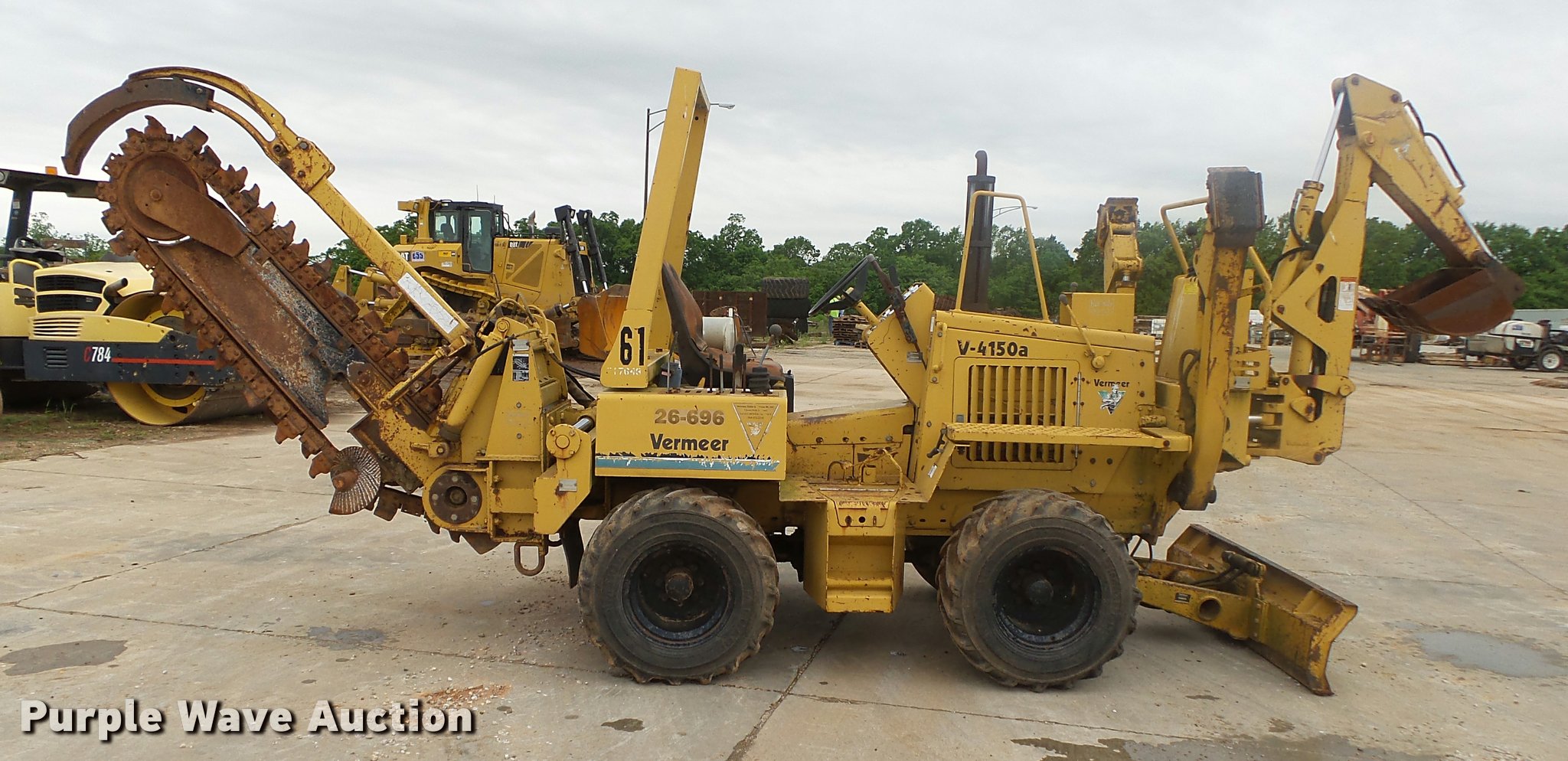 Purple Wave is selling a used Trencher or Rock Saw in Missouri. This item is a 1997 Vermeer V4150A trencher with the following: 1,482 hours on meter, Deutz F3L-1011F diesel engine, 45 HP, Hydrostatic transmission, OROPS, Trencher model TR4150, 4' maximum digging depth, 6" cutting width, Crumber shoe, Hydraulic sliding offset, Serial 1VRP070V4V1000345, BL4150 64"W six way backfill blade, B500 backhoe, 30" stick length, Two stick controls, 12"W bucket, (3) teeth, Hydraulic outriggers, Rear weights, 31 x 15.50-15 tires, Backhoe seat missing, Serial 1VKP082RXV1000405