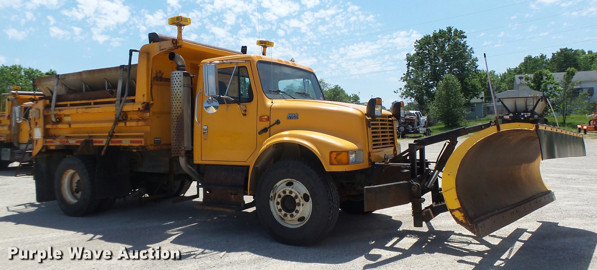 Purple Wave is selling a used Construction Dump Truck in Missouri. This item is a 2002 International 4900 dump truck with the following: 182,209 miles on odometer, 10,513 hours on meter, International DT466 7.6L L6 turbo diesel engine, Automatic transmission, Single axle, AC and heat, Cruise, Weatherband radio, Power and heated mirrors, Air suspension seat, Steel dump bed, 10'L x 8'W, 24" side height, Single ram hoist, Air operated end gate, Roll tarp, 11'W plow, MODOT ID P0443, Flink spreader, 10'L, MODOT ID 50176, Single fuel tank, Pintle hitch, Trailer wiring, Spring suspension, Air brakes, 315/80R22.5 front tires, 11R22.5 rear tires, MODOT ID 6914