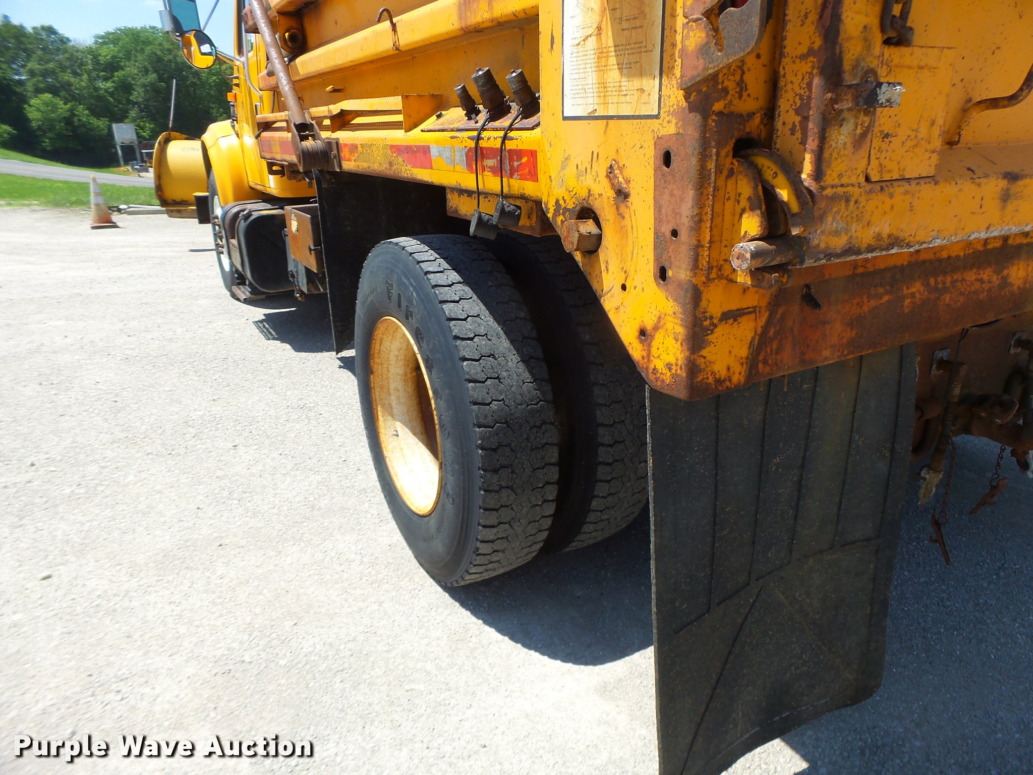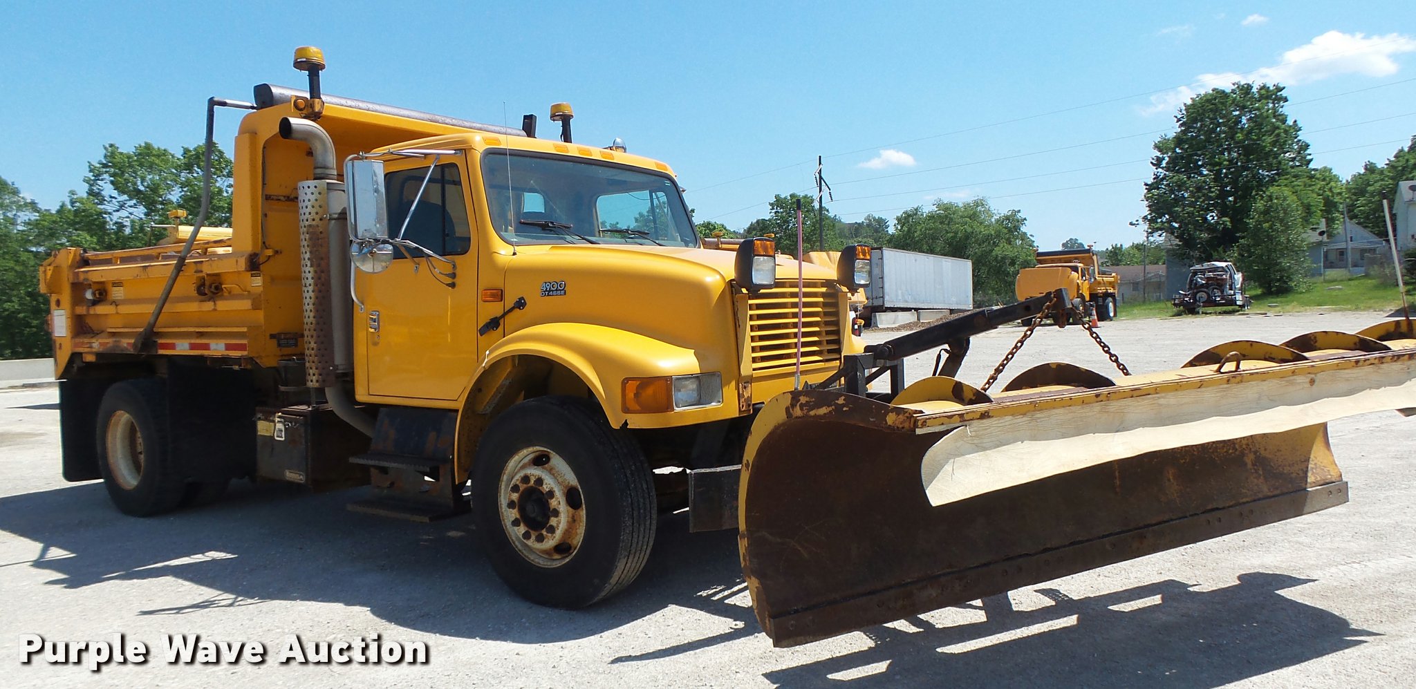 Purple Wave is selling a used Construction Dump Truck in Missouri. This item is a 2002 International 4900 dump truck with the following: 194,180 miles on odometer, 11,380 hours on meter, International DT466 7.6L L6 turbo diesel engine, Automatic transmission, Single axle, AC and heat, Cruise, Weatherband radio, Heated mirrors, Air suspension seat, Steel dump bed, 10'L x 8'W, 24" side height, Single ram hoist, Air operated end gate, Roll tarp, Plow, 11'W, MODOT ID P1956, Single fuel tank, Pintle hitch, Trailer wiring, Spring suspension, Air brakes, 315/80R22.5 front tires, 11R22.5 rear tires, MODOT ID 6899
