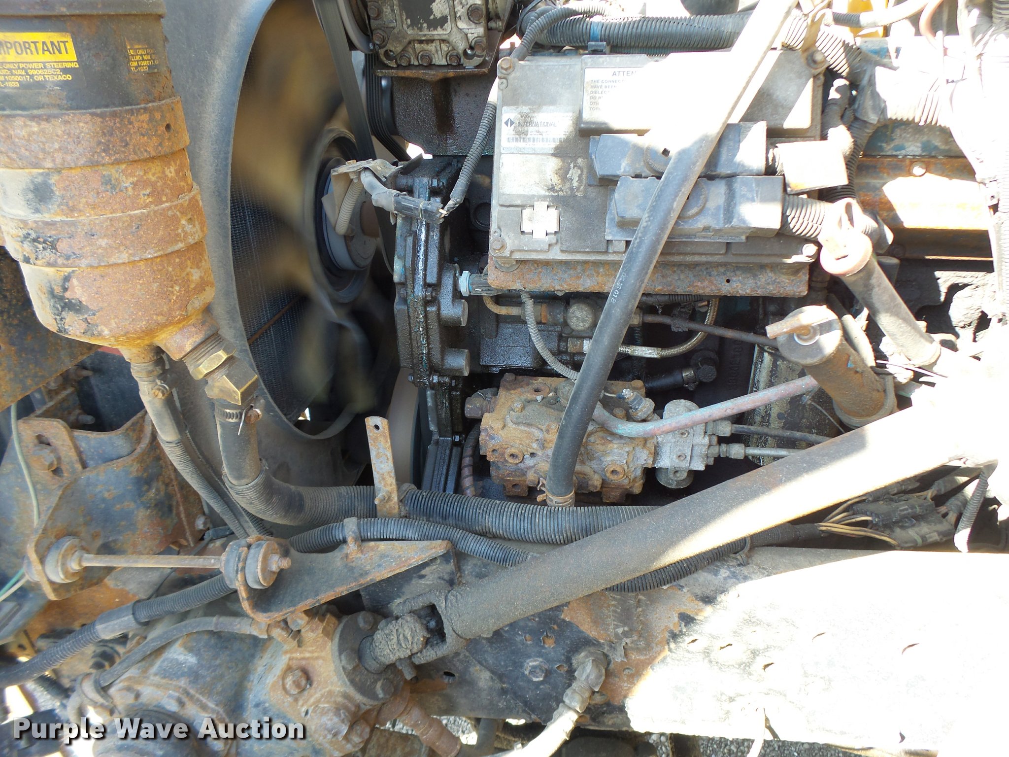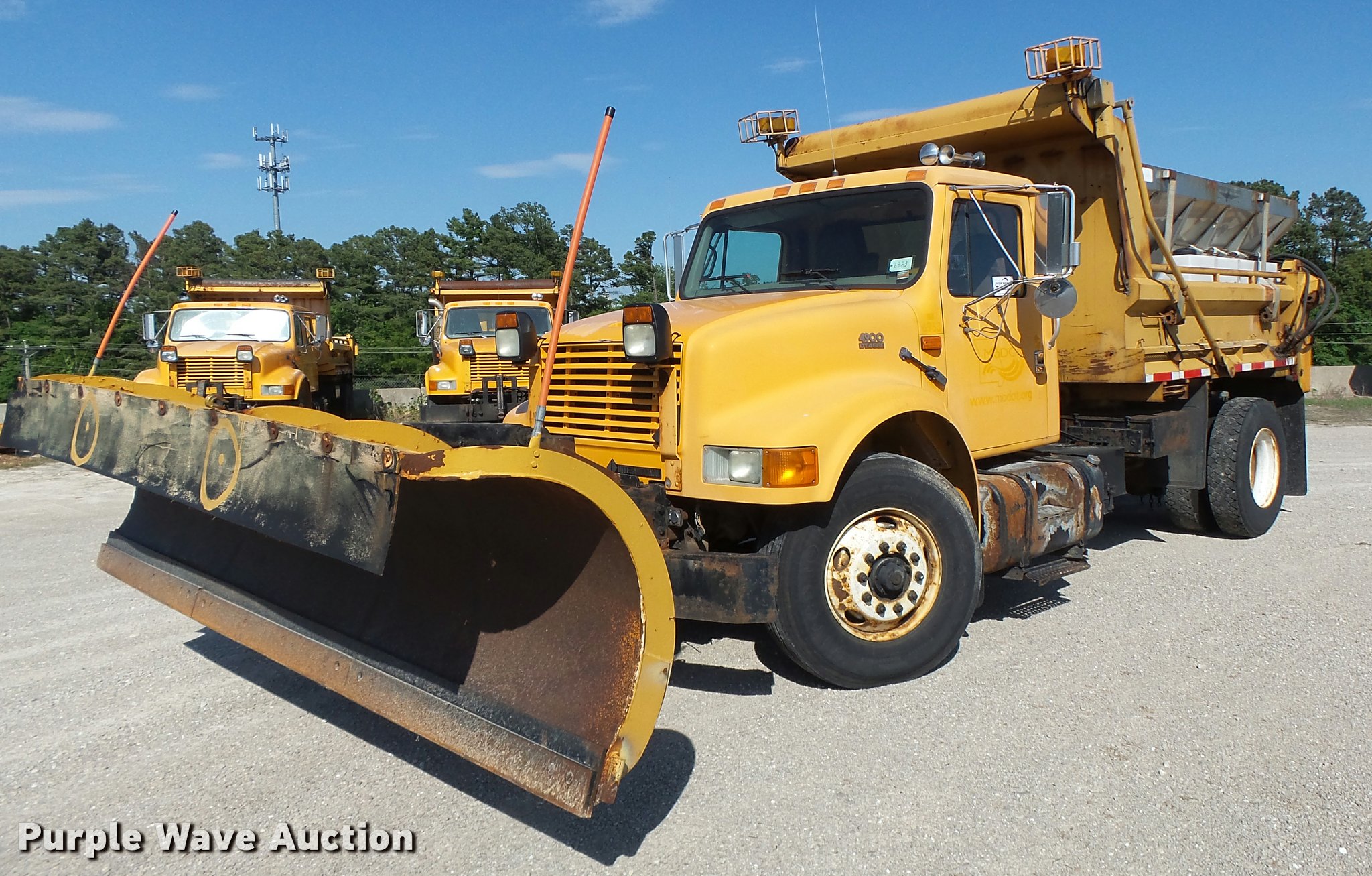 Purple Wave is selling a used Construction Dump Truck in Missouri. This item is a 2002 International 4900 dump truck with the following: 163,151 miles on odometer, 10,846 hours on meter, International DT466 7.6L L6 turbo diesel engine, Automatic transmission, Single axle, AC and heat, AM/FM/CD, Cruise, Heated mirrors, Steel dump bed, 10'L x 8'W, 24" side height, Single ram hoist, Air operated end gate, Roll tarp, 11'W plow, MODOT ID P1353, Swenson spreader, 10'W, MODOT ID 50317, Toolbox, Single fuel tank, Pintle hitch, Trailer wiring, Spring suspension, Air brakes, 315/80R22.5 front tires, 11R22.5 rear tires, MODOT ID 6983
