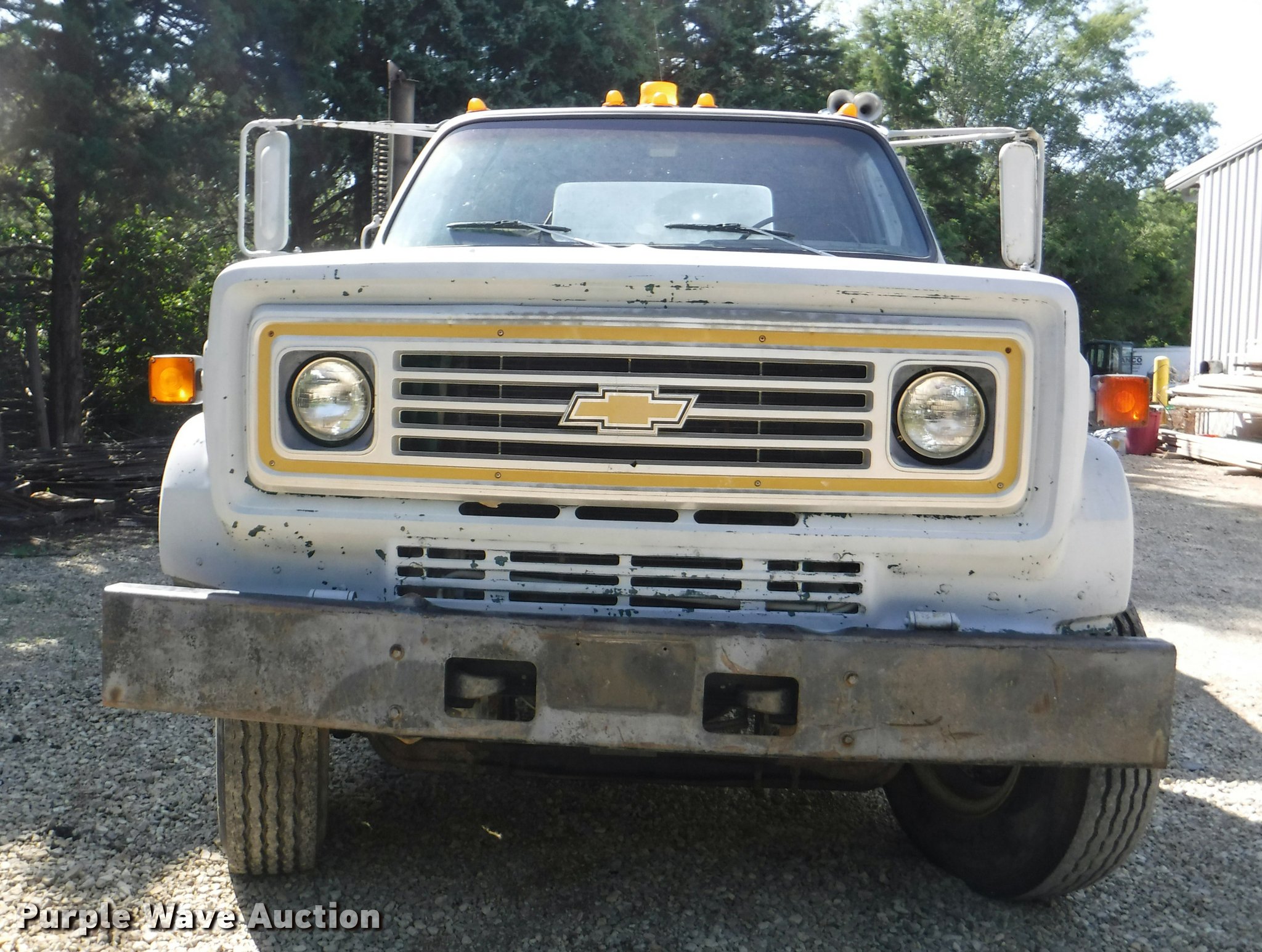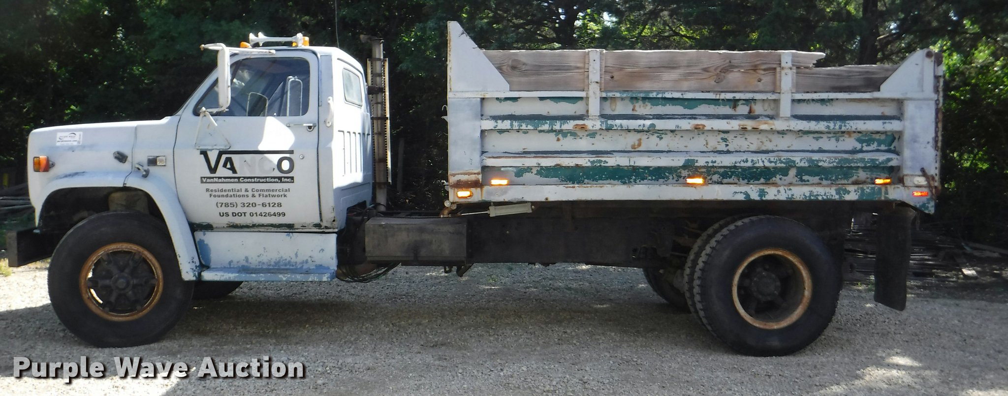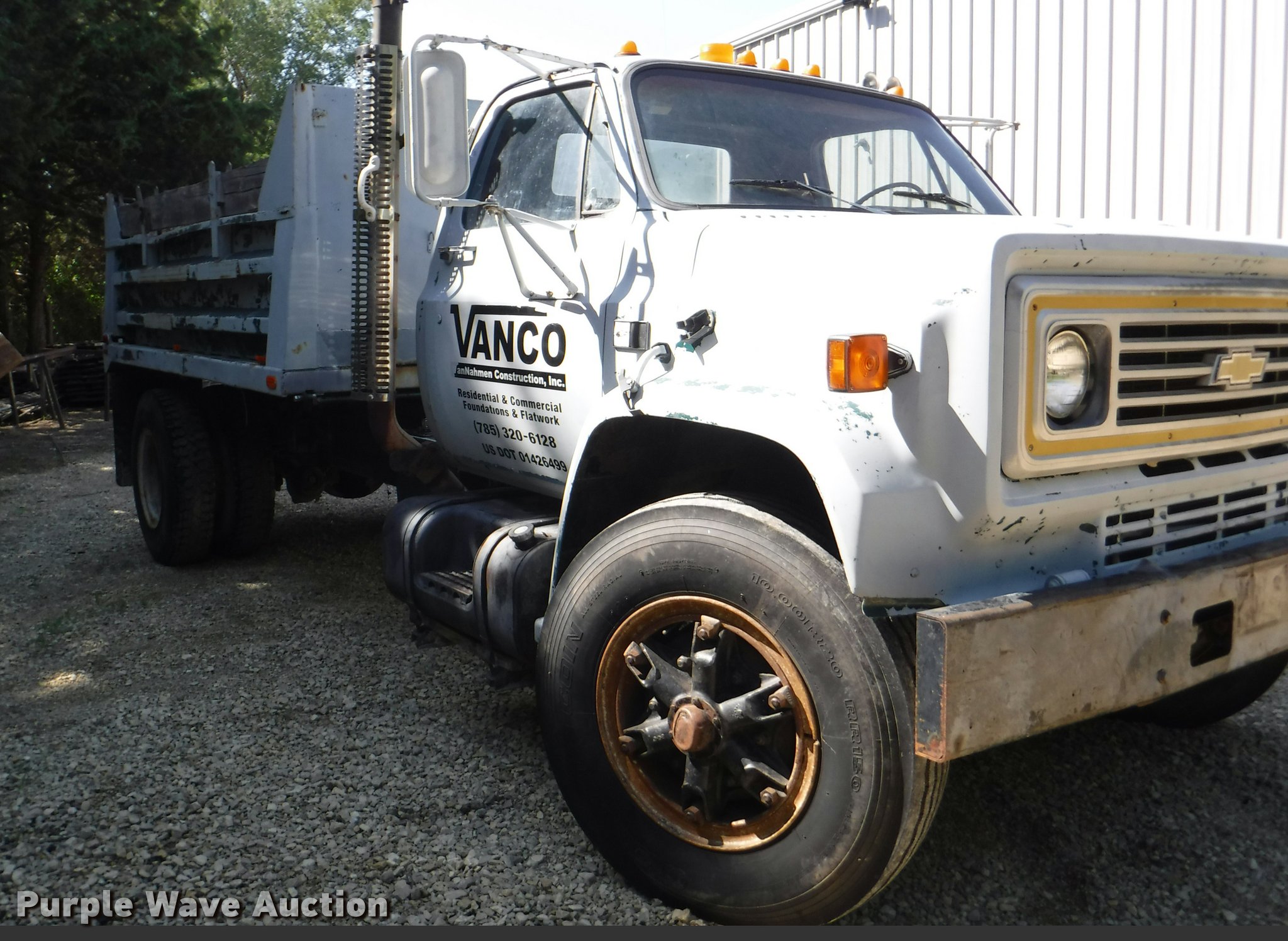 Purple Wave is selling a used Construction Dump Truck in Kansas. This item is a 1988 Chevrolet Kodiak dump truck with the following: 329,891 miles on odometer, Actual mileage unknown, 1997 GM Detroit Diesel Reman eight cylinder diesel engine, Serial 08GR110050, Five speed manual transmission, Two speed rear end, Single axle, Heat, Steel dump bed, 138"L x 8'W, 26" side height, 12"H side boards, Single ram hoist, Air operated end gate, Front tow hooks, Single fuel tank, Ball hitch, Trailer wiring, 185" wheelbase, Spring suspension, Air brakes, 10.00R20 tires, GVWR 33,200 lbs, FAWR 12,000 lbs, RAWR 21,200 lbs, Decals will be removed prior to auction