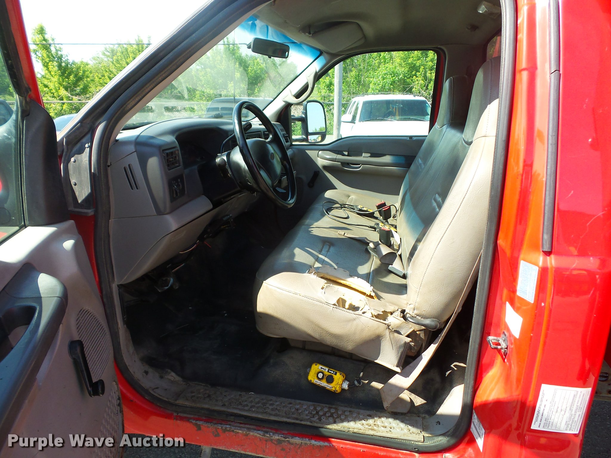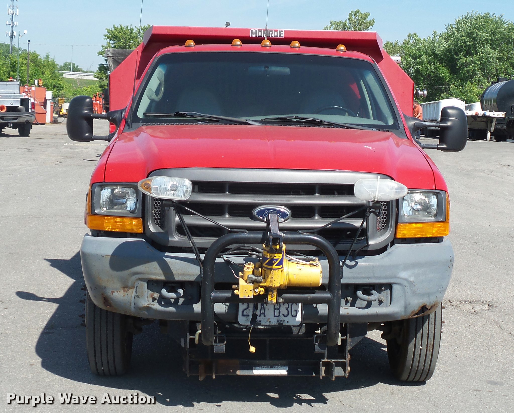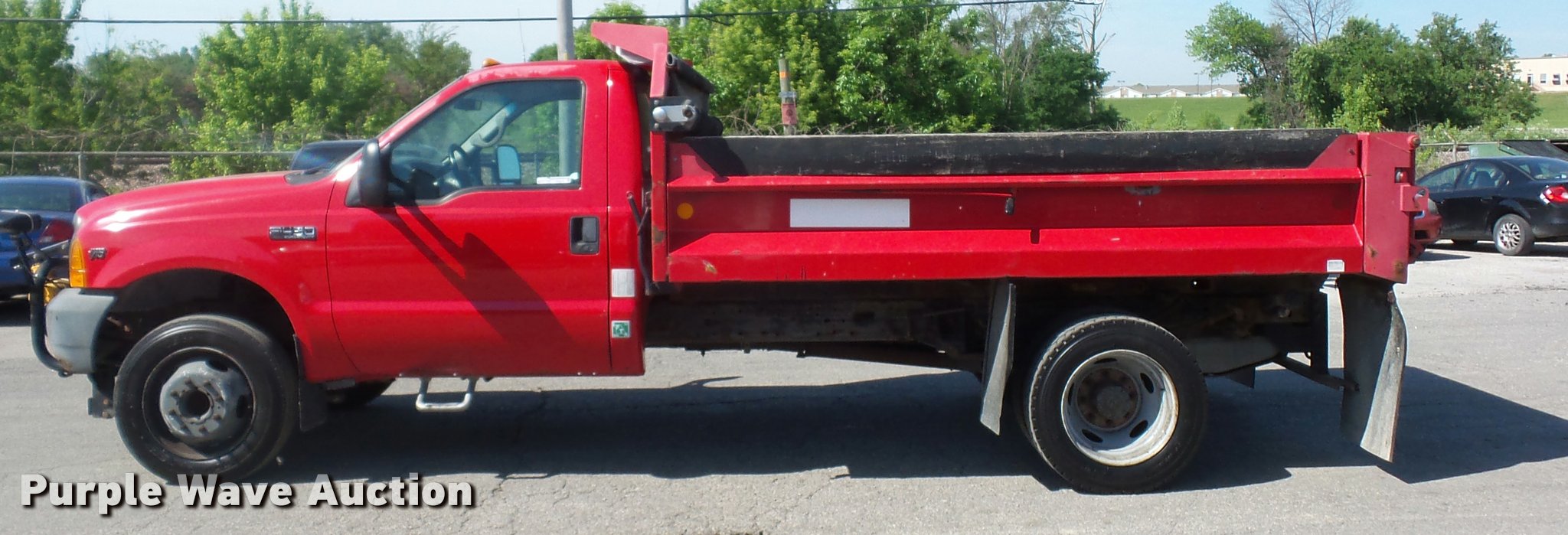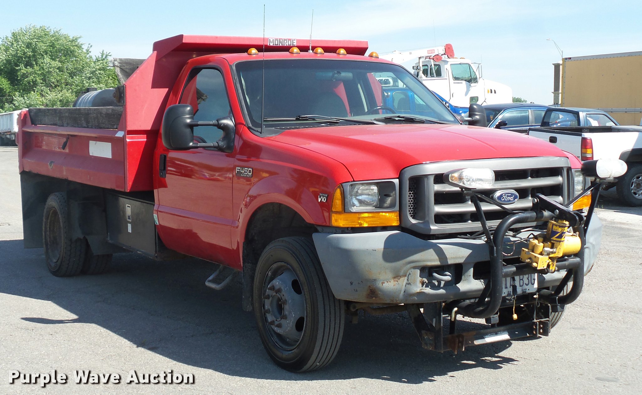 Purple Wave is selling a used Construction Dump Truck in Missouri. This item is a 2000 Ford F450 Super Duty dump truck with the following: 114,528 miles on odometer, 6.8L V10 SOHC 20V gas engine, Automatic transmission, Heat, AM/FM, Manual windows and locks, Vinyl interior, 11'L x 8'W dump bed, 14" folding sides, 7"H side boards, Toolbox, Meyer snow plow, 90"W, Pintle hitch, 225/75R19.5 tires, Check engine light is on