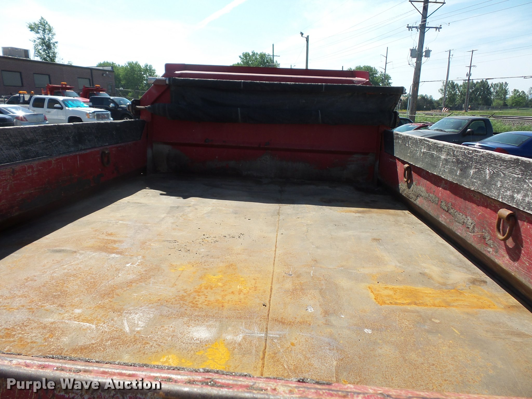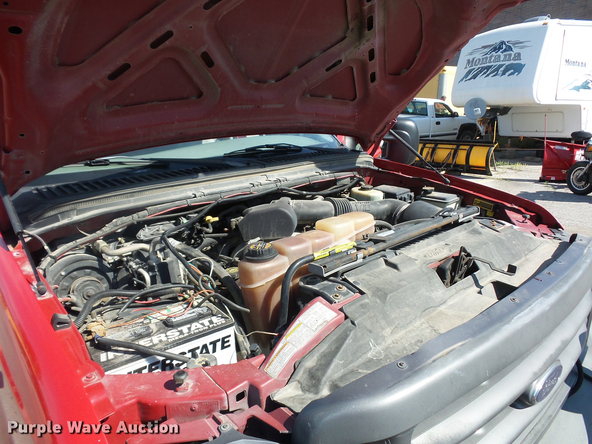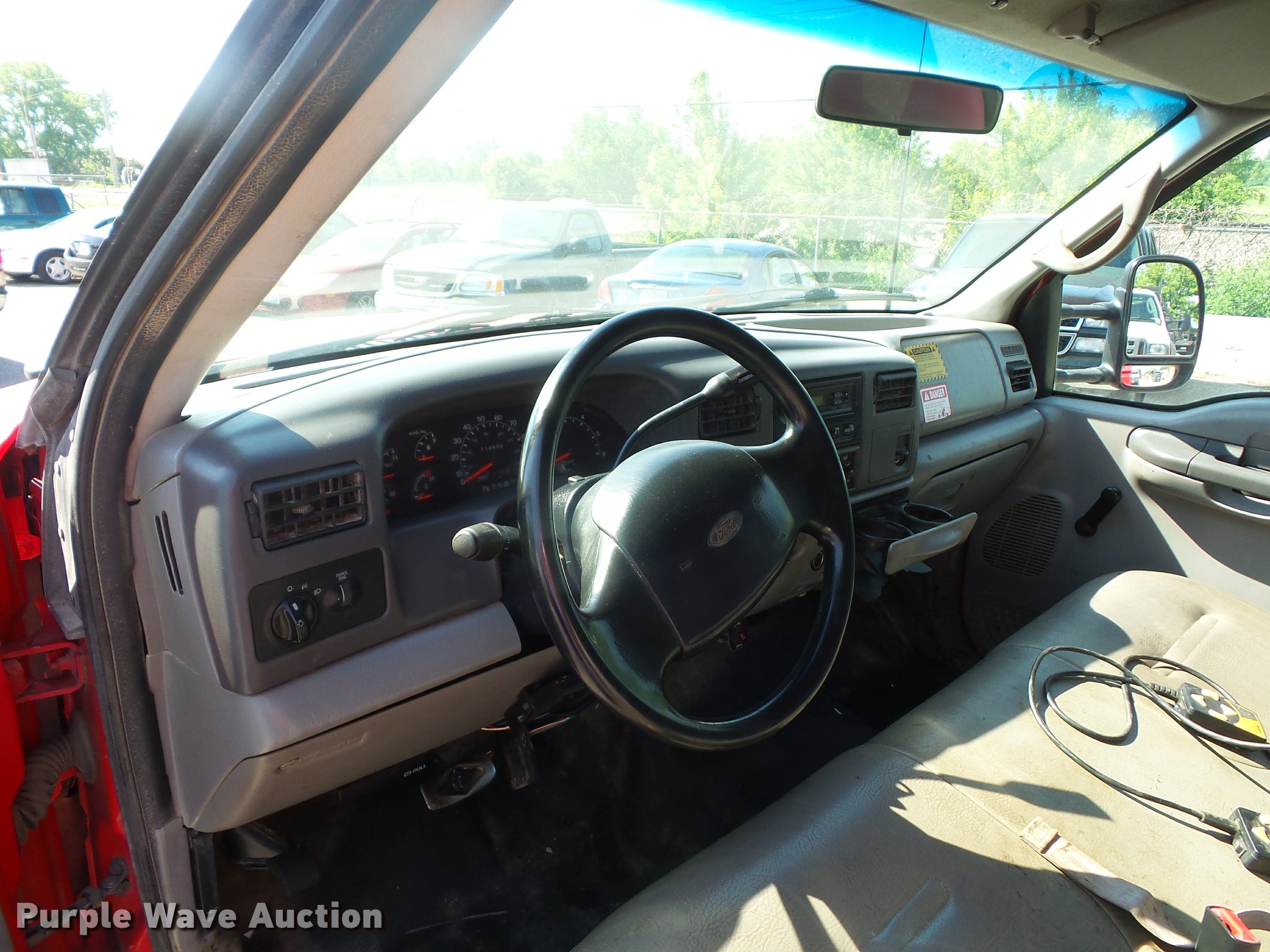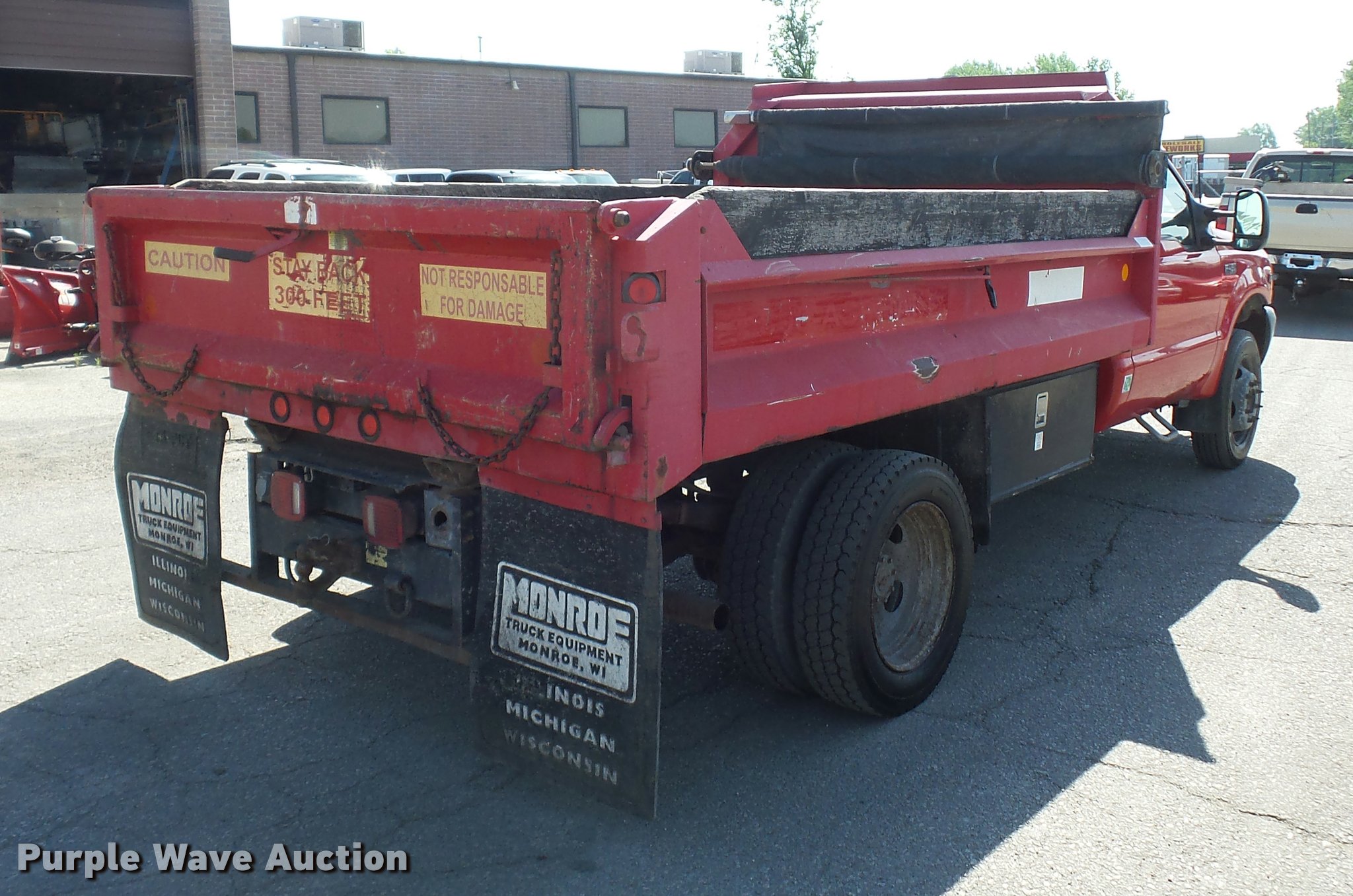 Purple Wave is selling a used Construction Dump Truck in Missouri. This item is a 2000 Ford F450 Super Duty dump truck with the following: 114,528 miles on odometer, 6.8L V10 SOHC 20V gas engine, Automatic transmission, Heat, AM/FM, Manual windows and locks, Vinyl interior, 11'L x 8'W dump bed, 14" folding sides, 7"H side boards, Toolbox, Meyer snow plow, 90"W, Pintle hitch, 225/75R19.5 tires, Check engine light is on