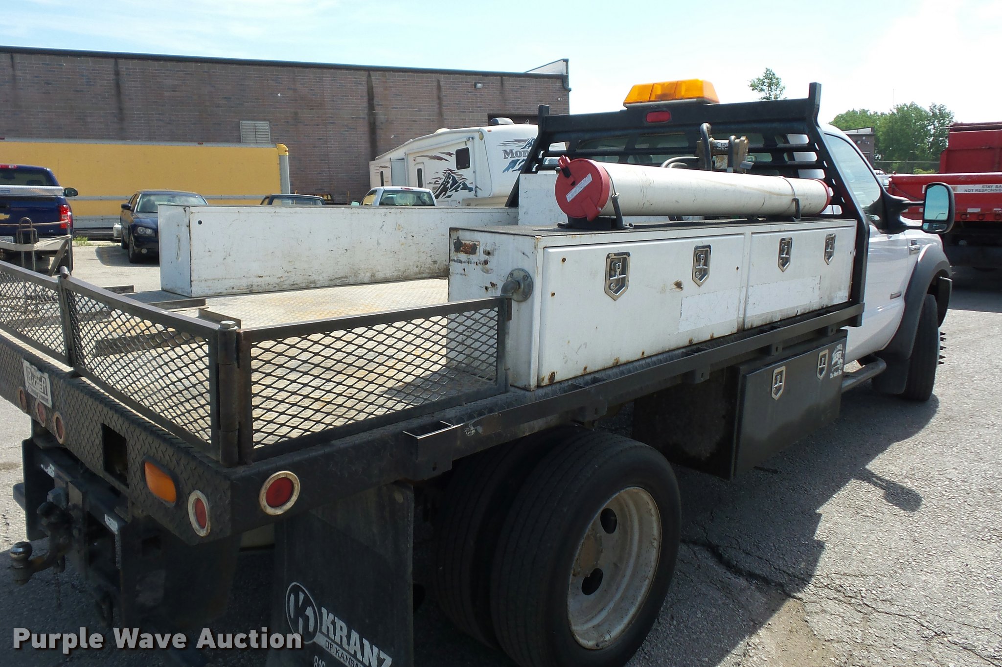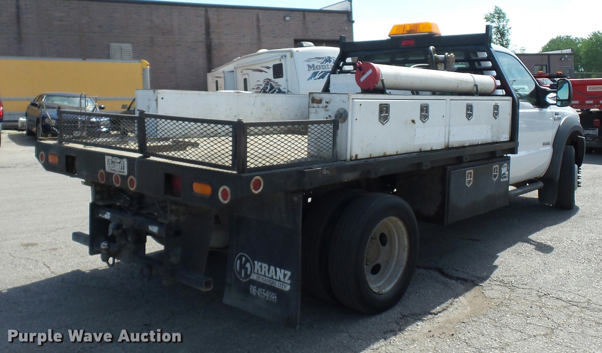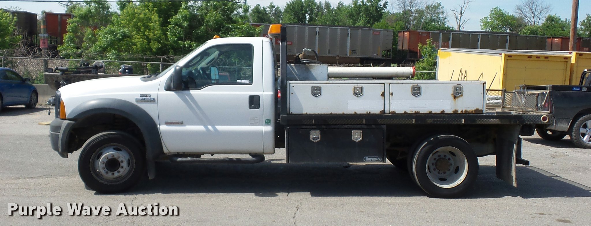 Purple Wave is selling a used Flat Bed Truck in Missouri. This item is a 2006 Ford F450 Super Duty flatbed truck with the following: 96,081 miles on odometer, 6.0L V8 OHV 32V turbo diesel engine, Automatic transmission, AC and heat, Tilt, Cruise, AM/FM/CD, Manual windows and locks, Cloth interior, 11'L x 92"W flatbed, Toolbox, Auxiliary fuel tank, 12V pump,, 225/75R19.5 tires