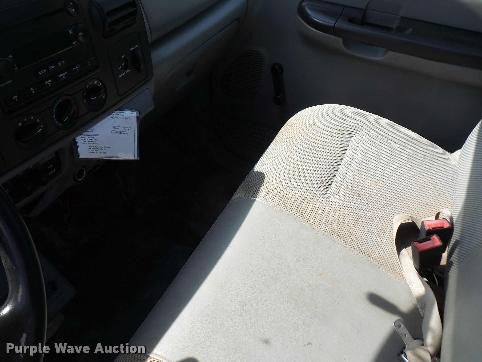 2006 Ford F450 Super Duty flatbed truck. 96,081 miles on odometer, 6.0L V8 OHV 32V turbo diesel engine, Automatic transmission, AC and heat, Tilt, Cruise, AM/FM/CD, Manual windows and locks, Cloth interior, 11'L x 92"W flatbed Toolbox, Auxiliary fuel tank 12V pump, 225/75R19.5 tires. Missouri title. 1FDXF46P36ED97008. Seal-O-Matic Paving. 2601 NW Tullison Rd. Riverside, MO 64150