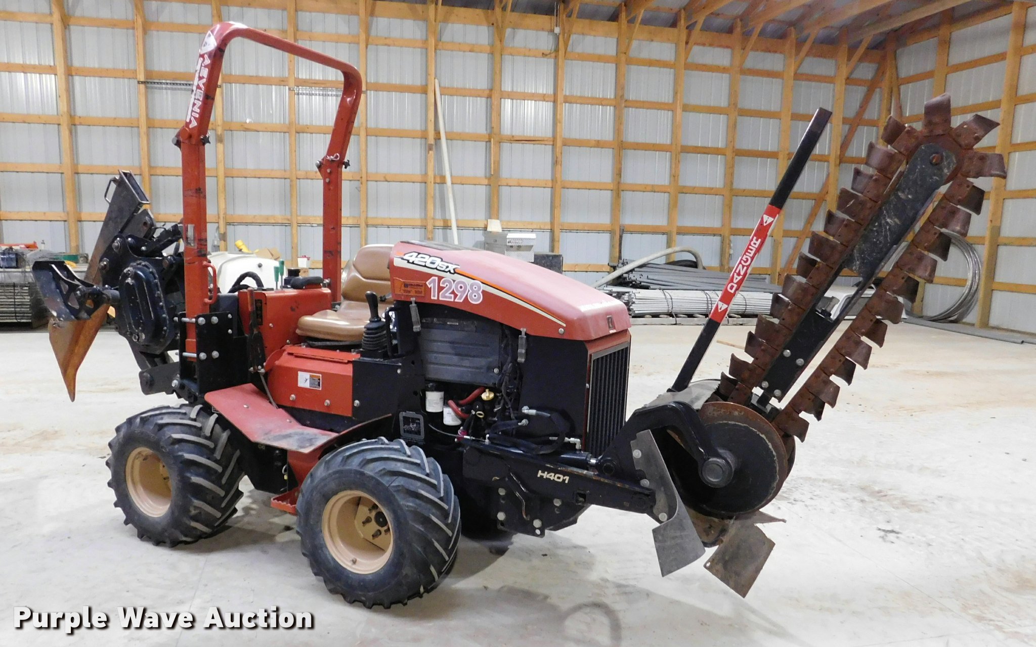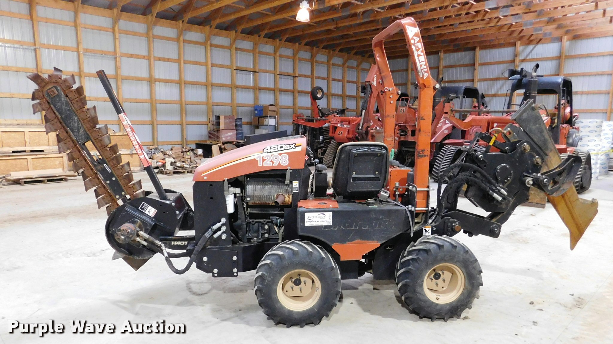 Purple Wave is selling a used Trencher or Rock Saw in Minnesota. This item is a 2011 Ditch Witch 420ST trencher with the following: 613 hours on meter, Deutz 7DZXL03 2.3L three cylinder diesel engine, 41 HP, Serial C19768KA2004/26040400, Hydrostatic transmission, Four wheel drive, OROPS, Vibratory plow, Pull blade, 48" depth, 1.5" thickness, Ditch Witch H401 trencher, 48" boom length, 4.5" cutting width, 6" diameter end idler, Dirt teeth, Carlisle Tru-Power 26x12-12.00 tires, Serial CMW420SXKB0000293, Unit# 1298