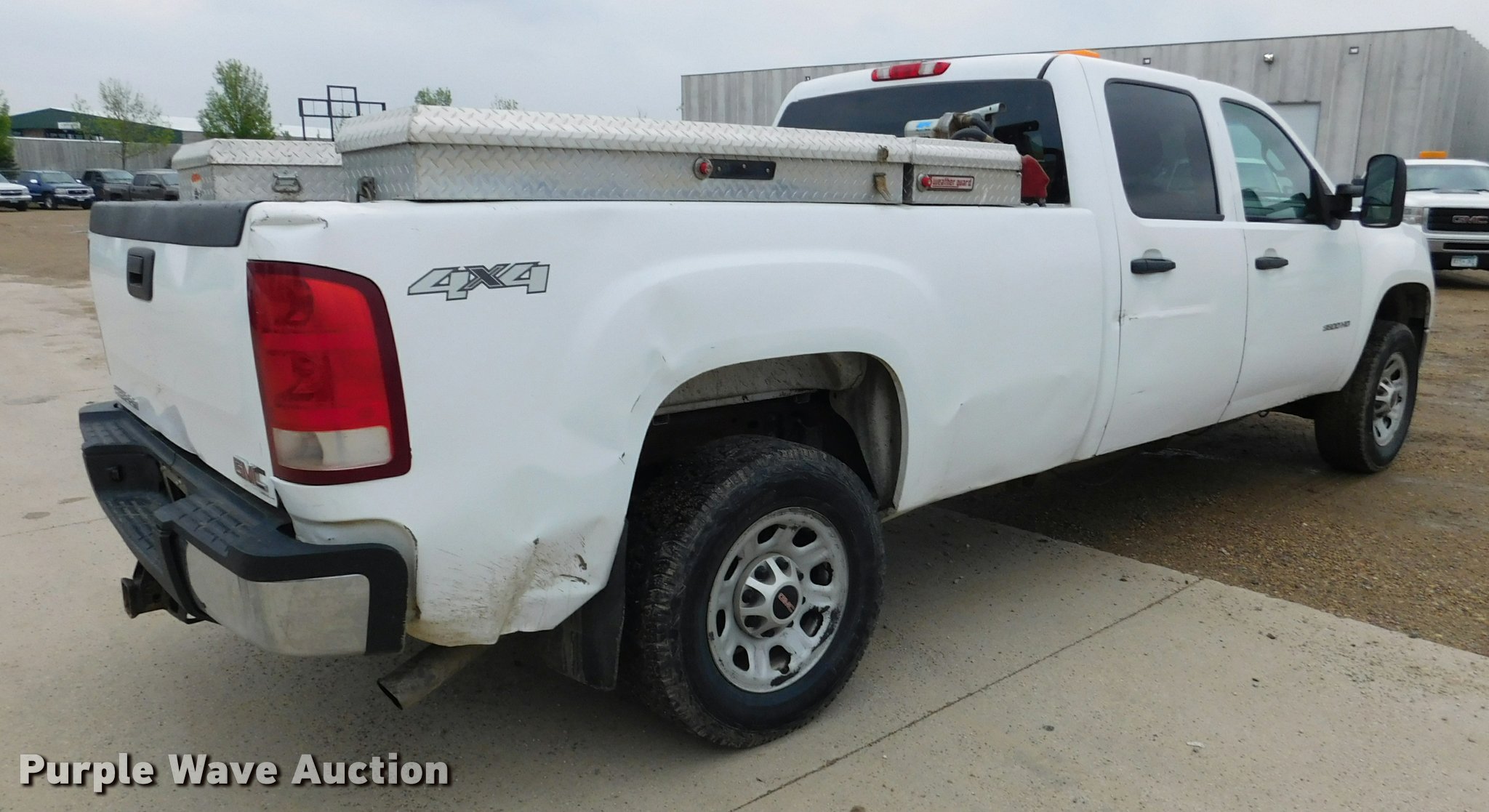 Purple Wave is selling a used 3/4 or 1 Ton Pickup or Van in Minnesota. This item is a 2011 GMC Sierra 3500HD Crew Cab pickup truck with the following: 200,107 miles on odometer, 6.0L V8 OHV 16V FFV gas engine, Automatic transmission, Four wheel drive, AC and heat, Tilt, Cruise, AM/FM, Manual windows, Power locks, Cloth interior, Front tow hooks, Brake controller, Beacon light, Block heater, Long bed, (3) toolboxes, Slide-in fuel tank, 70 gallon capacity, GPI 12V pump, 15 gpm, Nozzle, Hose,, Receiver hitch, Trailer wiring, LT275/65R18 tires, Front lower valance missing, Passenger side damage, Unit# 1302