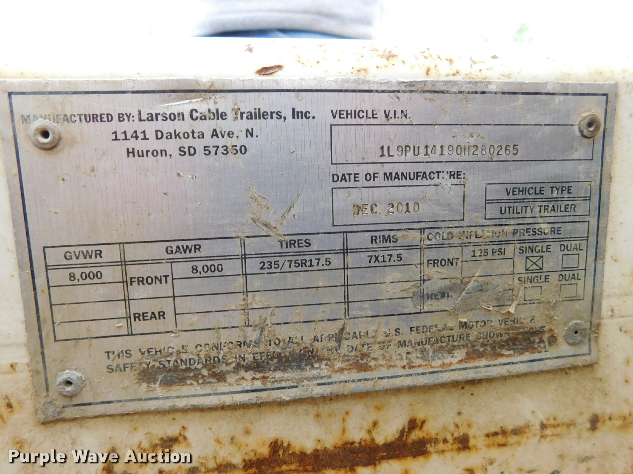 Purple Wave is selling a used Reel Trailer in Minnesota. This item is a 2010 Larson 5600 reel trailer with the following: 15' overall length, 7'L x 101"W wood deck, Single reel, 53" maximum reel width, 80" maximum reel diameter, Hydraulic height adjustment, Hydraulic wheel motor, Manual brake,, On-board hydraulic system, Honda GX390 single cylinder gas engine, Hydraulic pump, Tank, Swing-out operator controls, Hydraulic remote set, (2) rear stabilizers, Single leg landing gear, Pintle hitch, Solid suspension, Electric brakes, Steel wheels, 235/75R17.5 tires, GVWR 8,000 lbs, GAWR 8,000 lbs, Unit# 1292
