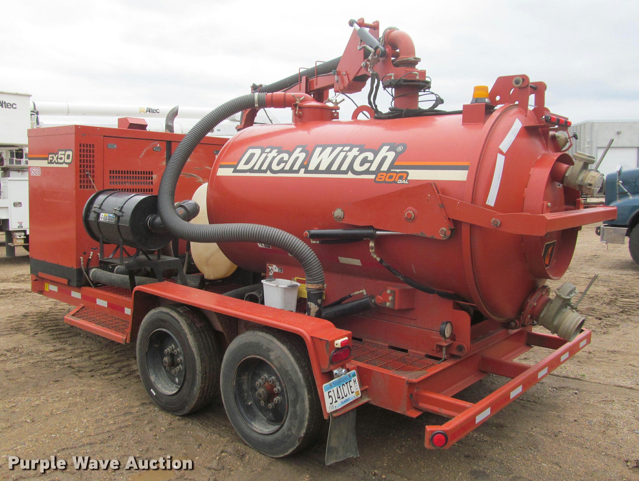 Purple Wave is selling a used Vacuum Excavator in Minnesota. This item is a 2013 Ditch Witch FX50 vacuum excavator trailer with the following: 757 hours on meter, Deutz D2011L031 2.3L three cylinder diesel engine, 49 HP, Serial 11349453, 200 gallon poly water tank, 800 gallon steel debris tank, Hydraulic rear door, Hydraulic tilt, (2) rear outlets, 6", 4.5", Sight glass, Hydraulic top boom, 4" boom hose, Remote control, Assorted hose, Water hose reel with wand, Pump scrubber, 21'L x 8'W trailer, Recessed toolbox, Pintle hitch, Single jack stand, Spring suspension, Electric brakes, Tandem axle, 215/75R17.5 tires, Serial CMWFX50XHD0000090, Unit# 1520