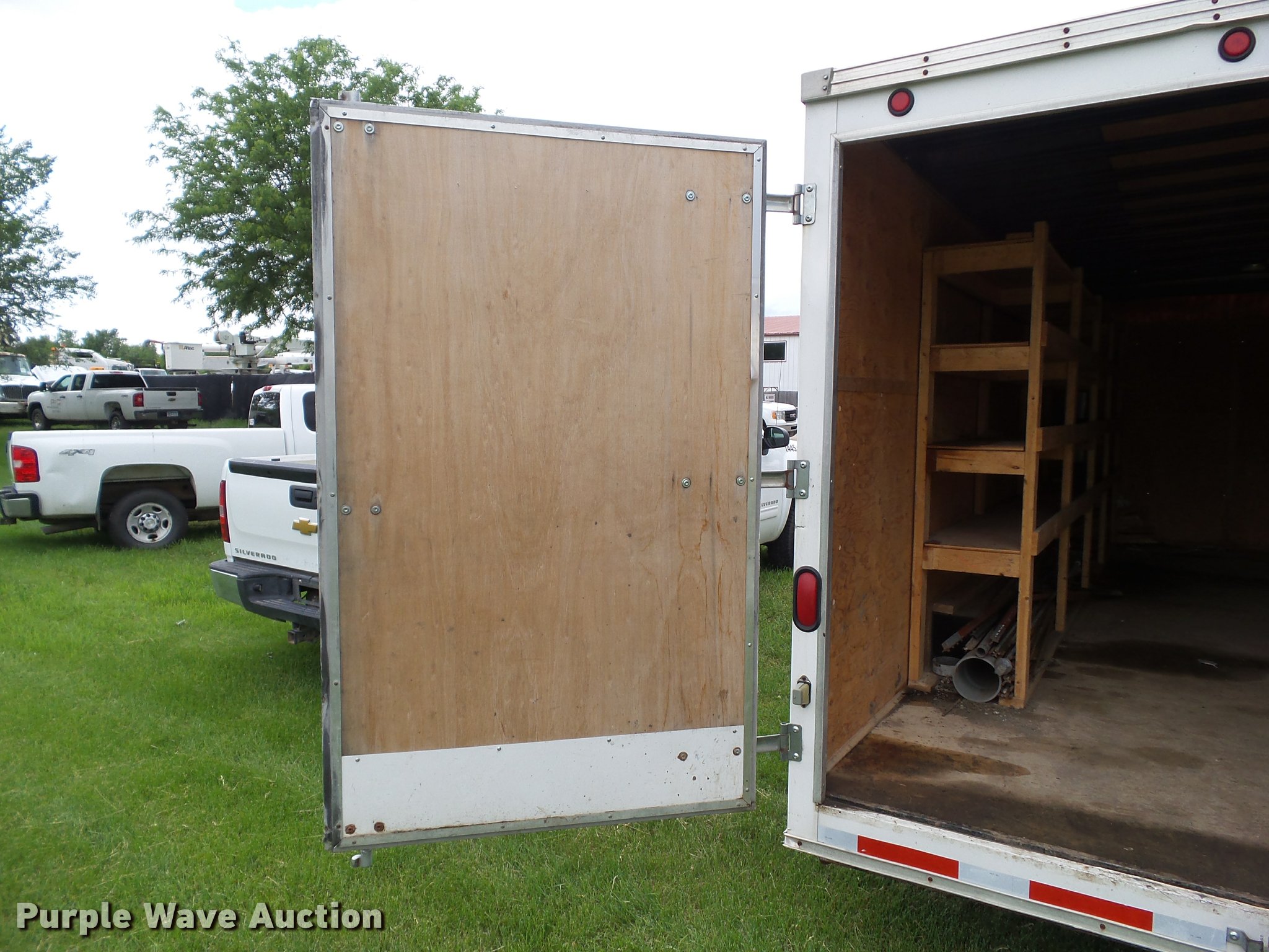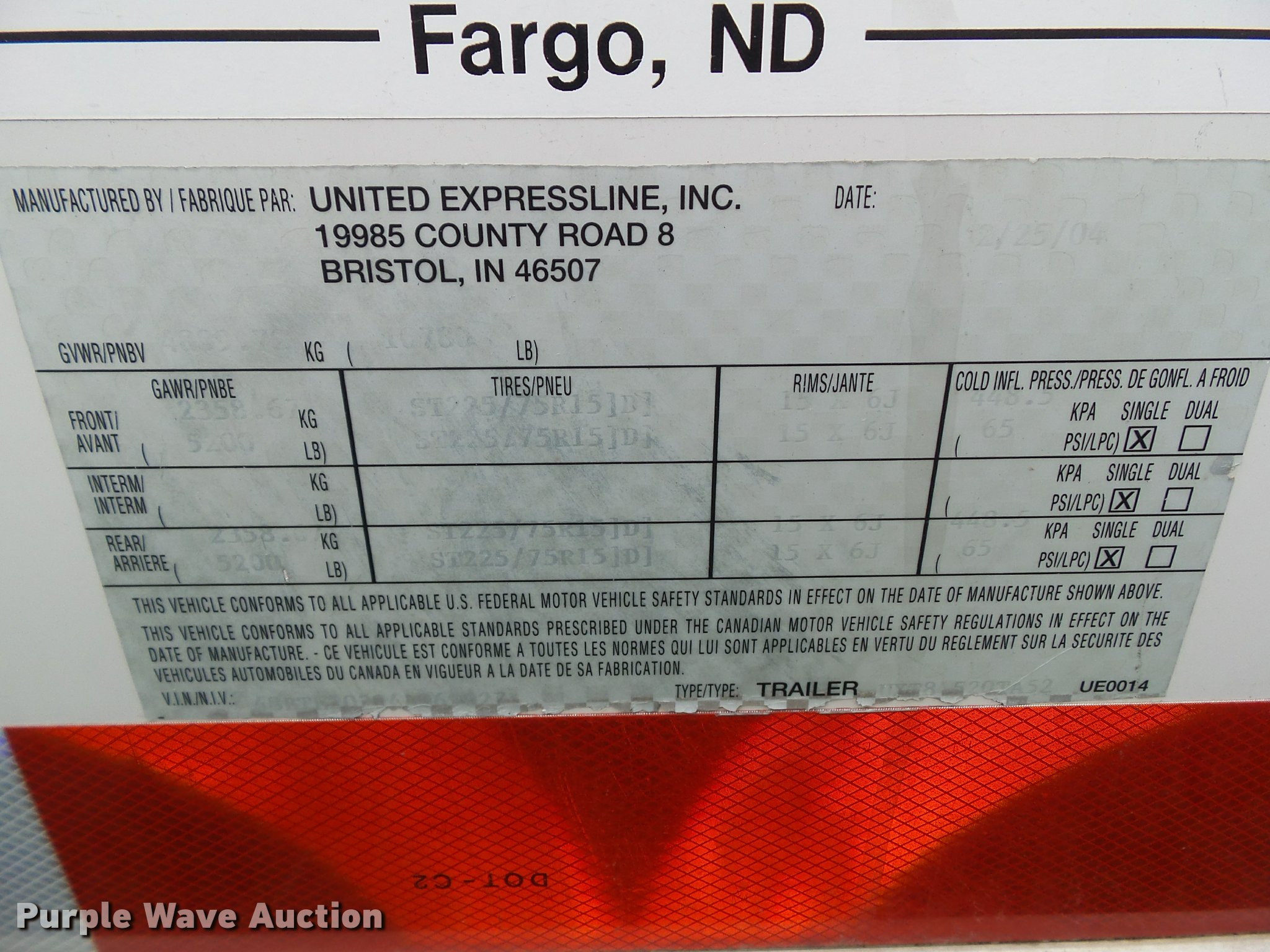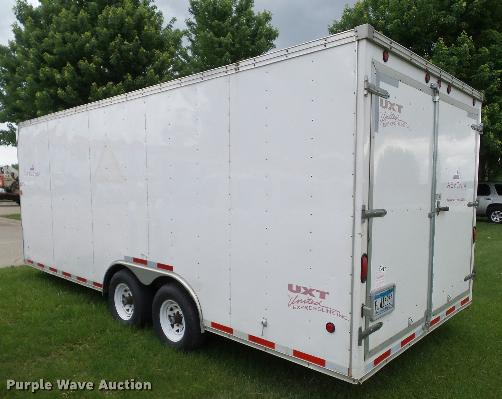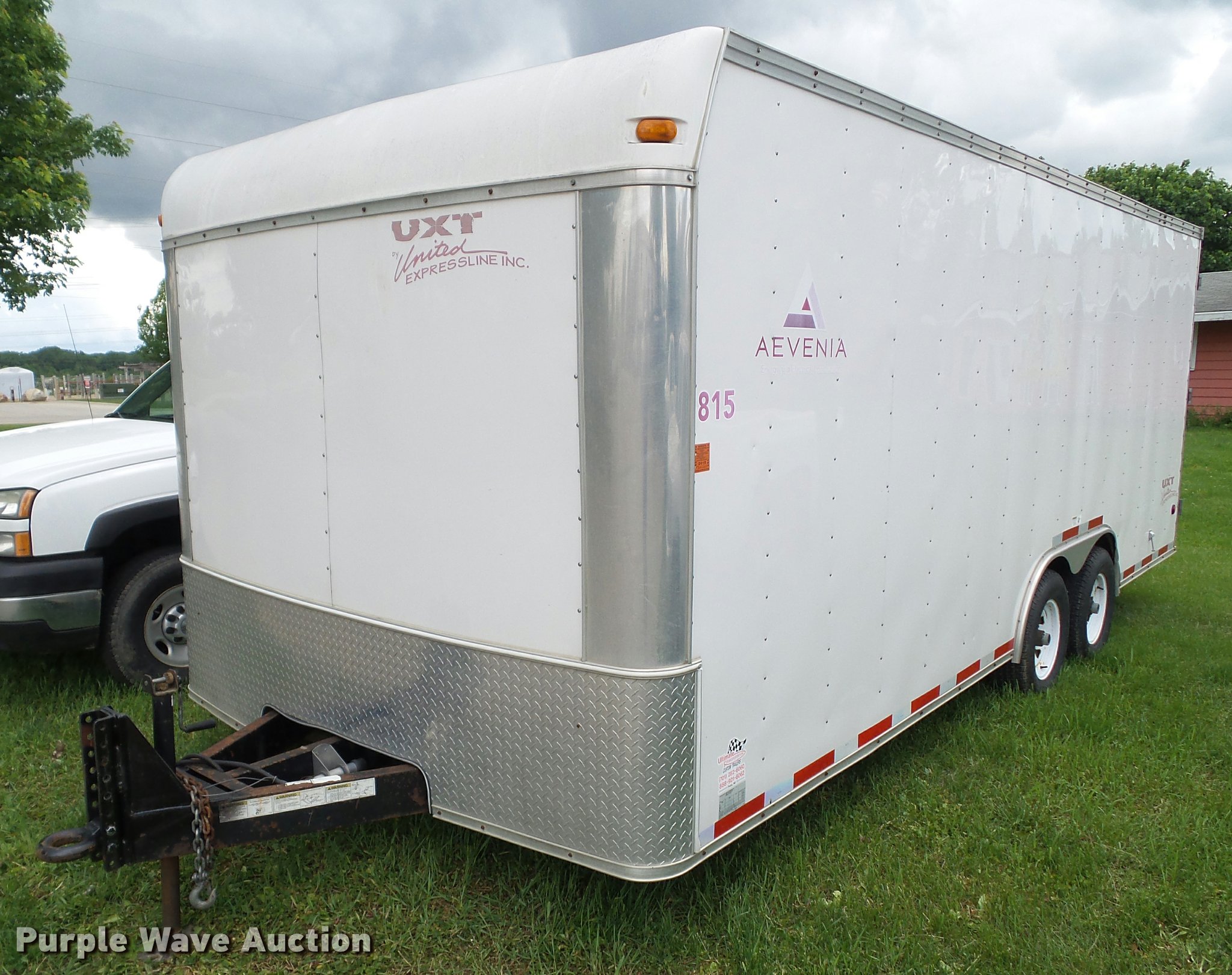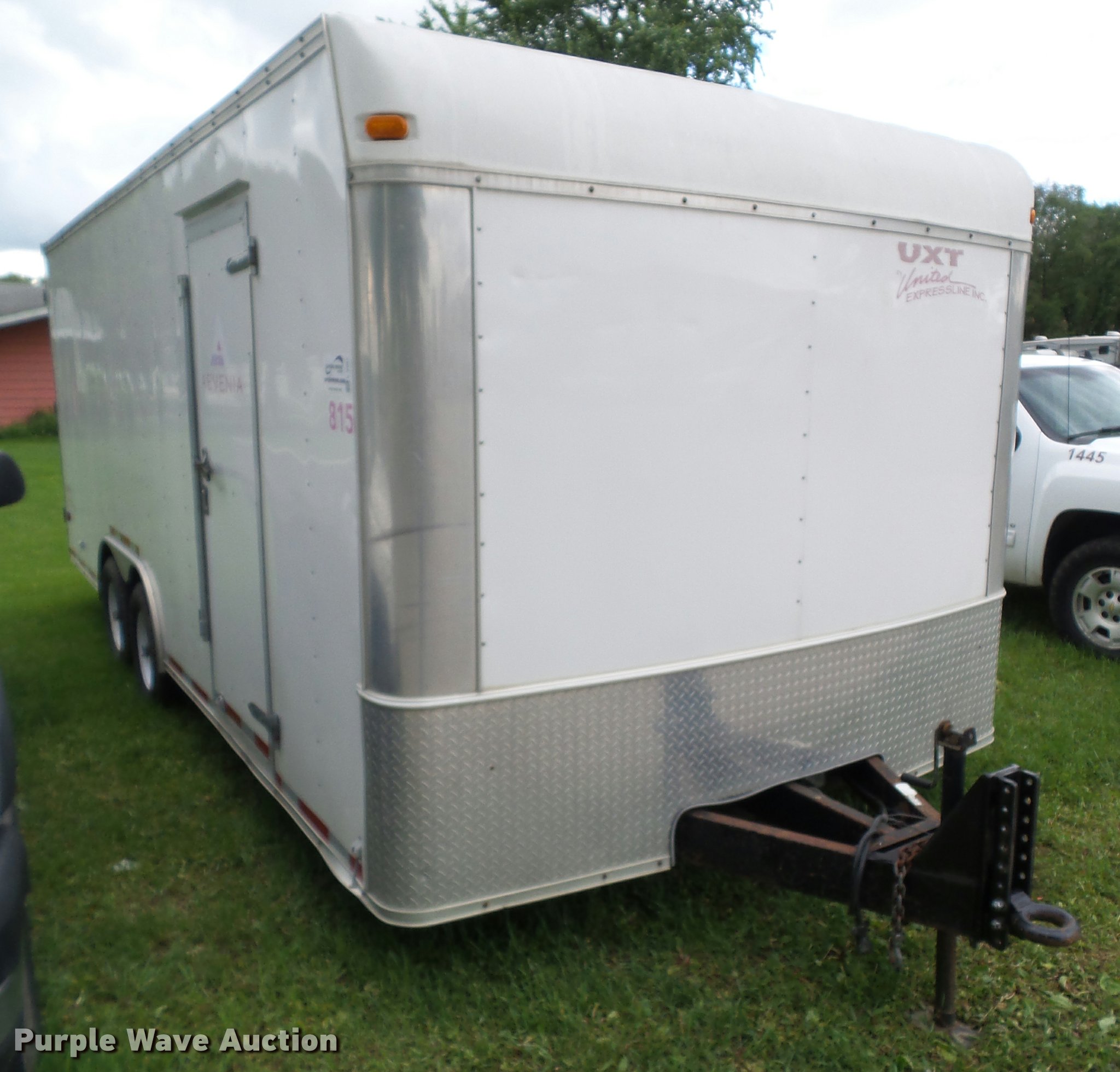 Purple Wave is selling a used Enclosed Cargo Trailer in Iowa. This item is a 2004 United Express enclosed cargo trailer with the following: 23' overall length, 20'L x 102"W body, 74" rear door height, 82" interior height, Wood floor, Shelving, Single side entry door, Swinging rear doors, 74" door height, Single leg landing gear, Pintle hitch, Tandem axle, Spring suspension, Electric brakes, Steel wheels, ST225/75R15 tires, GVWR 10,780 lbs