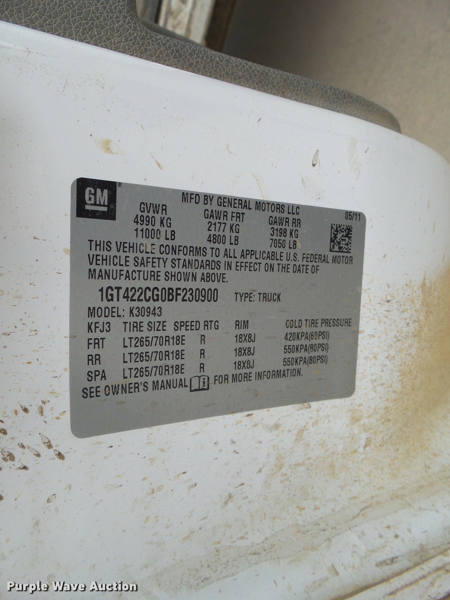 2011 GMC Sierra 3500HD Crew Cab pickup truck. 166,148 miles on odometer, 6.0L V8 OHV 16V FFV gas engine, Automatic transmission, Four wheel drive, AC and heat, Tilt, Cruise, AM/FM, Manual windows, Power locks, Cloth interior, Receiver hitch, Trailer wiring, LT245/65R18 tires, Contents not included, Motorola two way radio not included. Minnesota title. 1GT422CG0BF230900. Primoris Services Corporation. 5660 NW Beaver Dr. Johnston, IA 50131