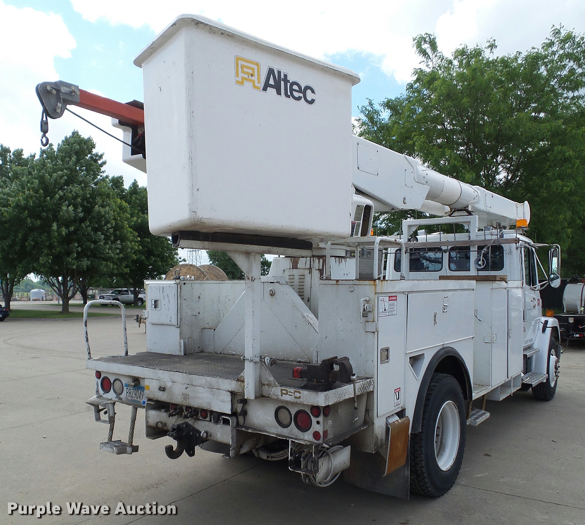 Purple Wave is selling a used Bucket Truck in Iowa. This item is a 2001 Freightliner FL70 bucket truck with the following: 105,667 miles on odometer, 4,254 hours on meter, Caterpillar C7 7.2L L6 turbo diesel engine, 246 HP, Serial 8YL70484, Automatic transmission, Single axle, AC and heat, AM/FM, Spring suspension seat, Beacon light, Block heater, Front tow hooks, PTO, Altec service bed, 15'L, Shelving, Work lights, Serial 37-70898, 2001 Altec AM855 boom, 700 lbs maximum lift capacity, 55' maximum lift height, Cable material handler, (4) outriggers, Serial 0800BB2189, Single fuel tank, Pintle hitch, Trailer wiring, Spring suspension, Air brakes, 11R22.5 tires, GVWR 33,000 lbs, Contents are not included, Motorola two way radio not included