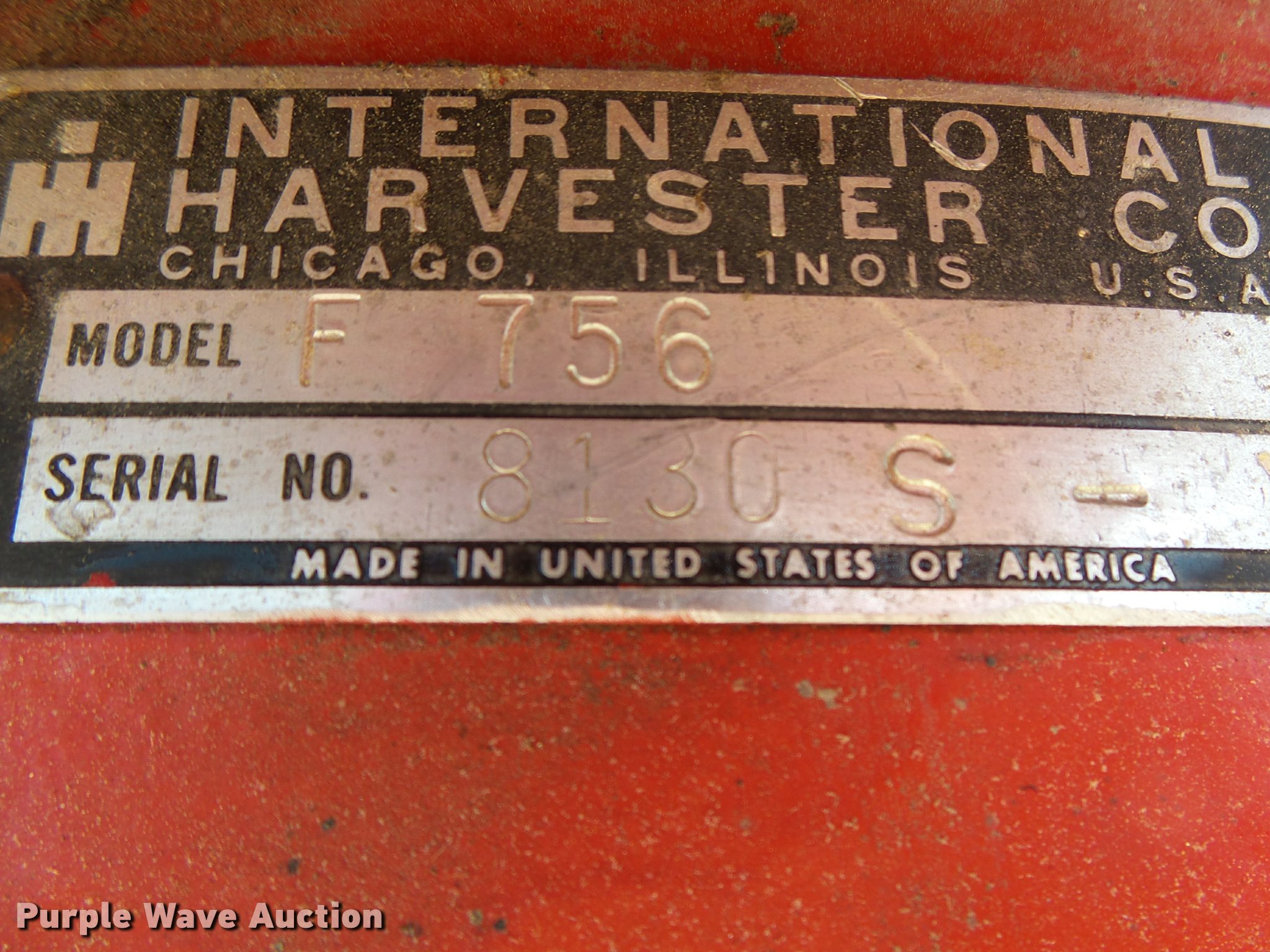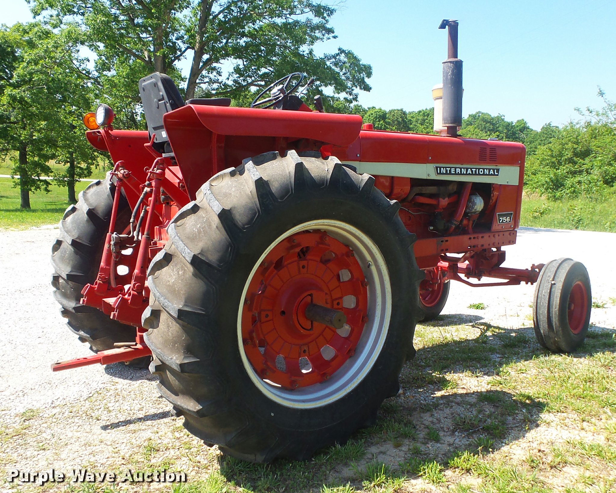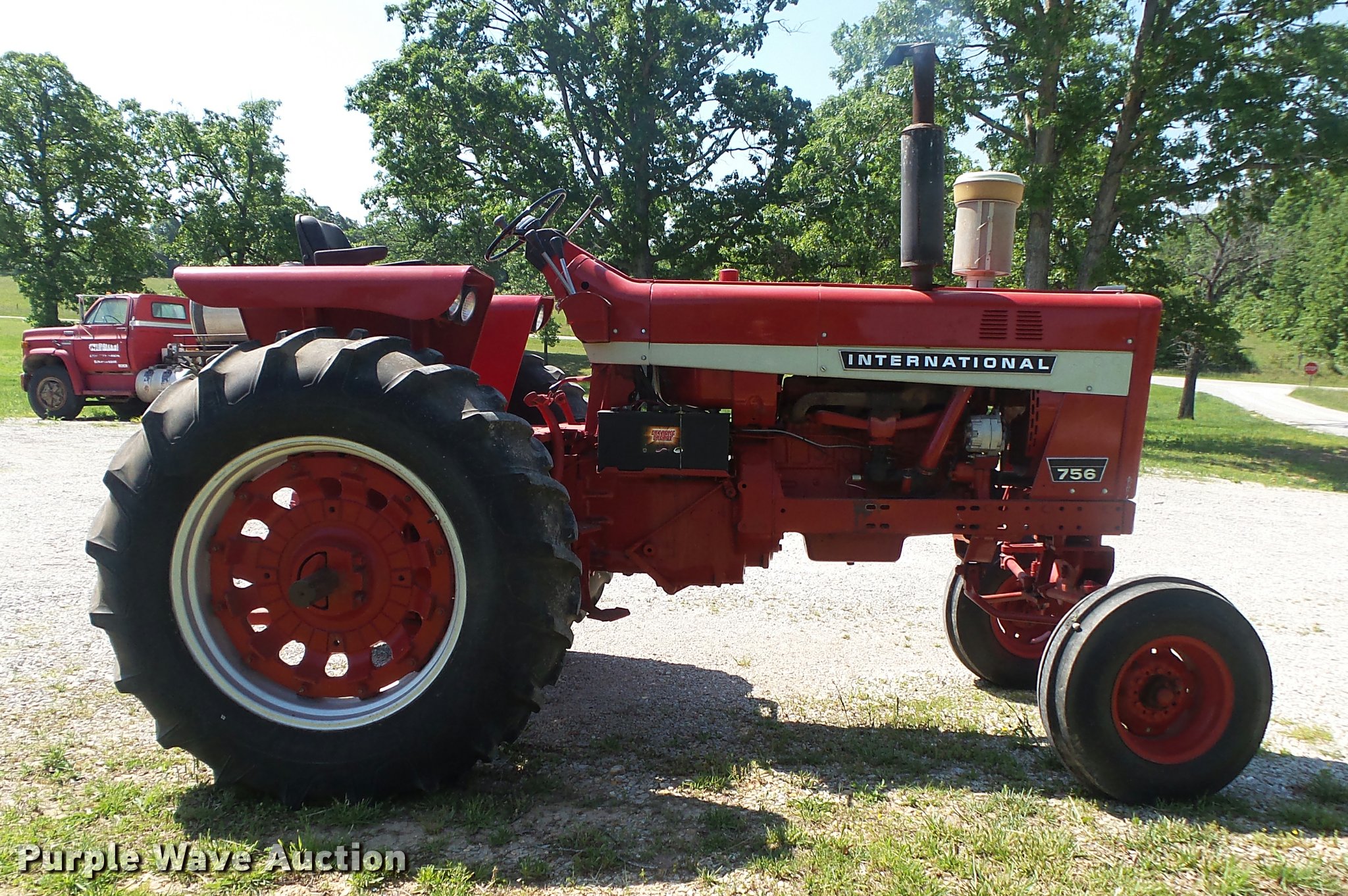 Purple Wave is selling a used Tractor in Missouri. This item is a International Farmall 756 tractor with the following: 223 hours on meter, International six cylinder gas engine, Torque amplifier transmission, 8F-8R gears, Differential lock, Tilt steering wheel, Suspension seat, Three point, 540 PTO, Rear hydraulic remote sets, 9.5L-15 front tires, 16.9-34 rear tires, Serial 81305