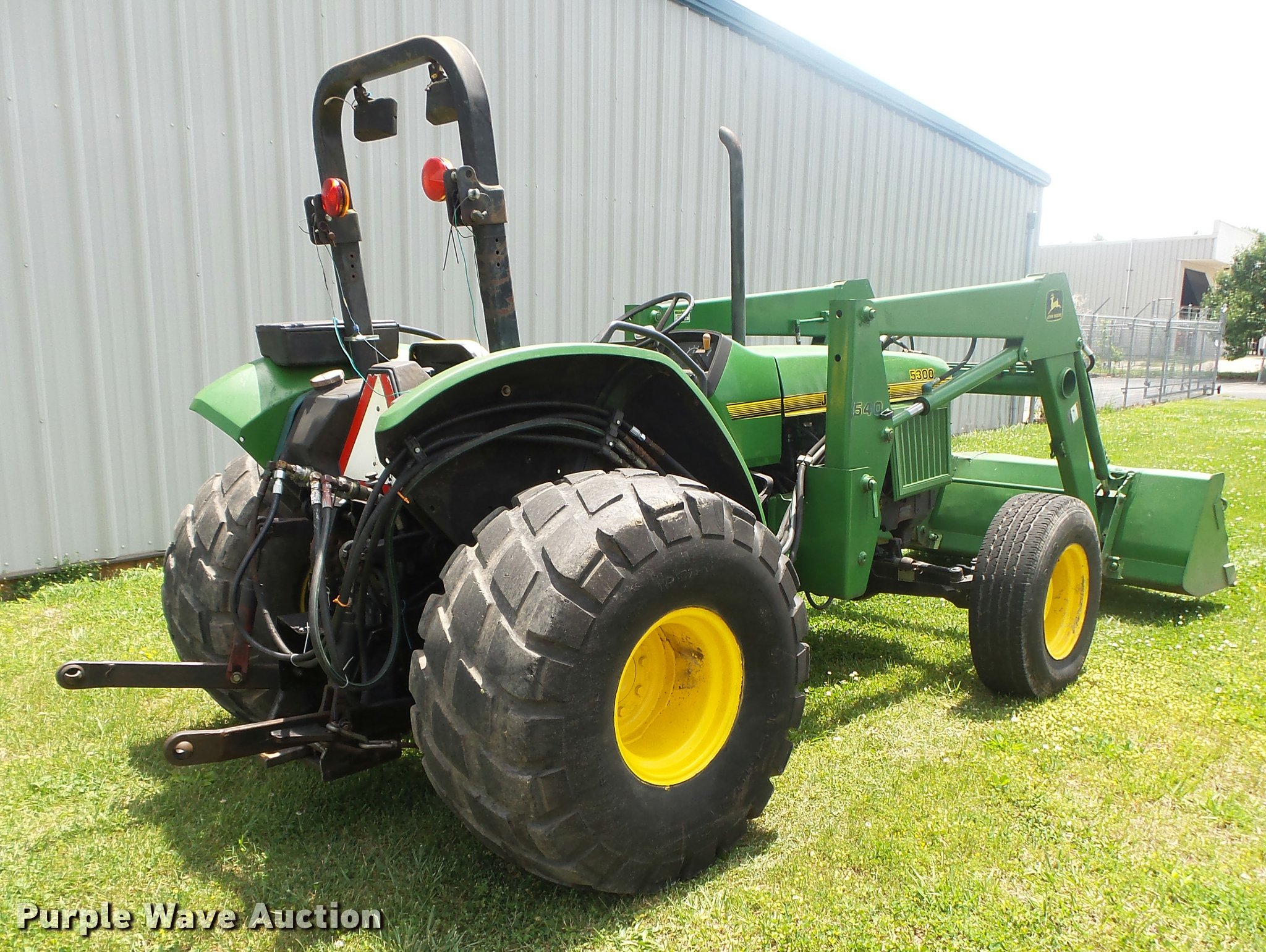 Purple Wave is selling a used Tractor in Missouri. This item is a 1994 John Deere 5300 MFWD tractor with the following: 2,223 hours on meter, John Deere 2.9L three cylinder diesel engine, Synchro transmission, 9F-3R gears, Differential lock, Suspension seat, John Deere 540 loader, 73"W bucket, Quick attach, Joystick controls, Serial W00540X006696, Three point, 540 PTO, Rear hydraulic remote sets, LT265/75R16 front tires, 21.5L-16.1SL rear tires, Serial LV5300D232077