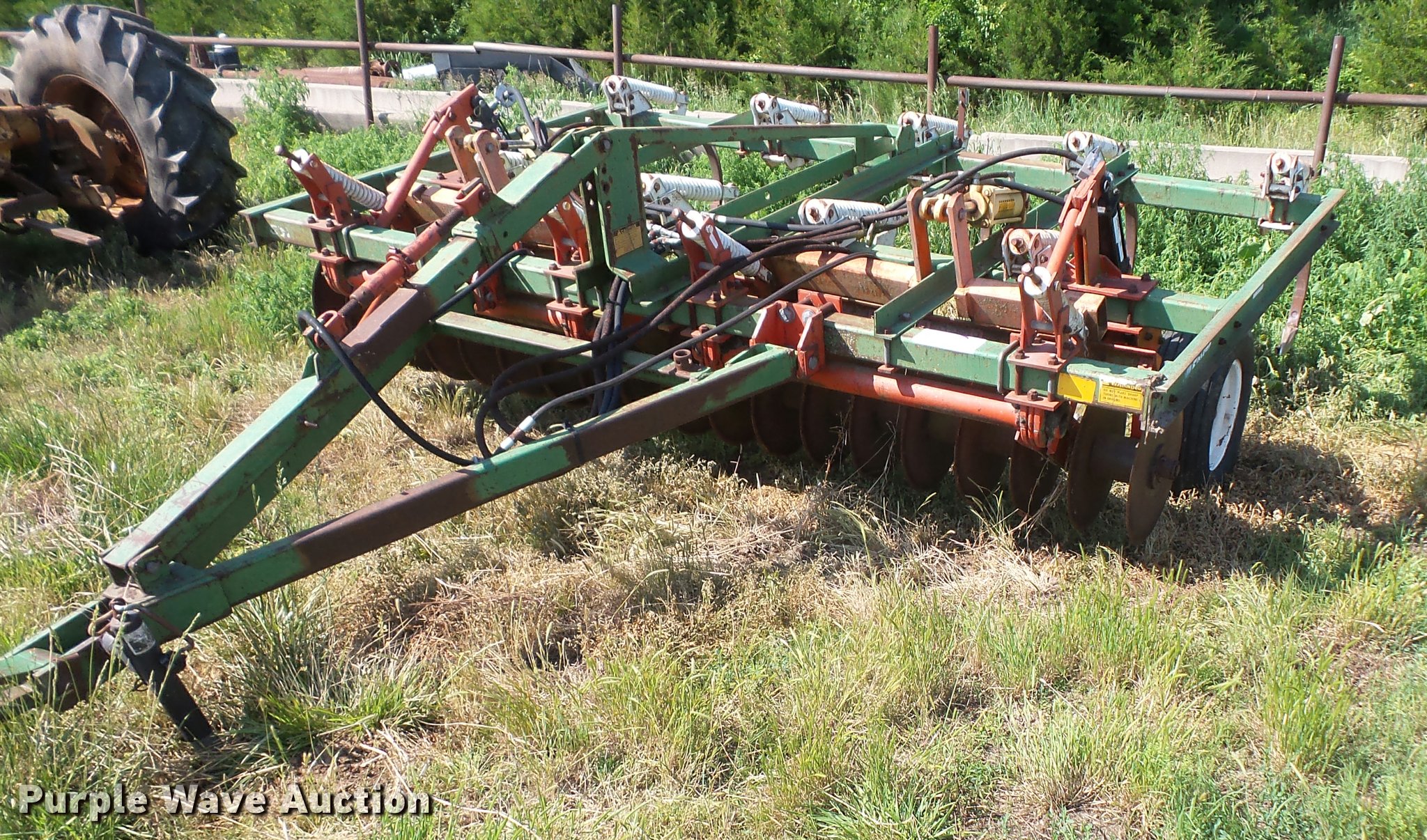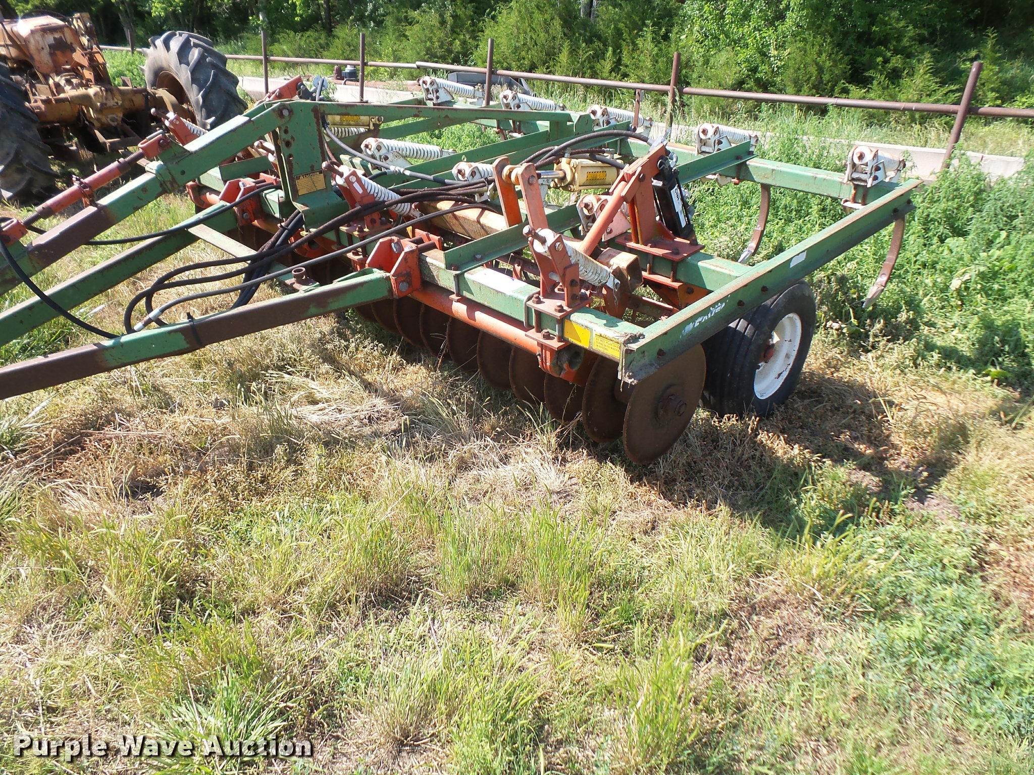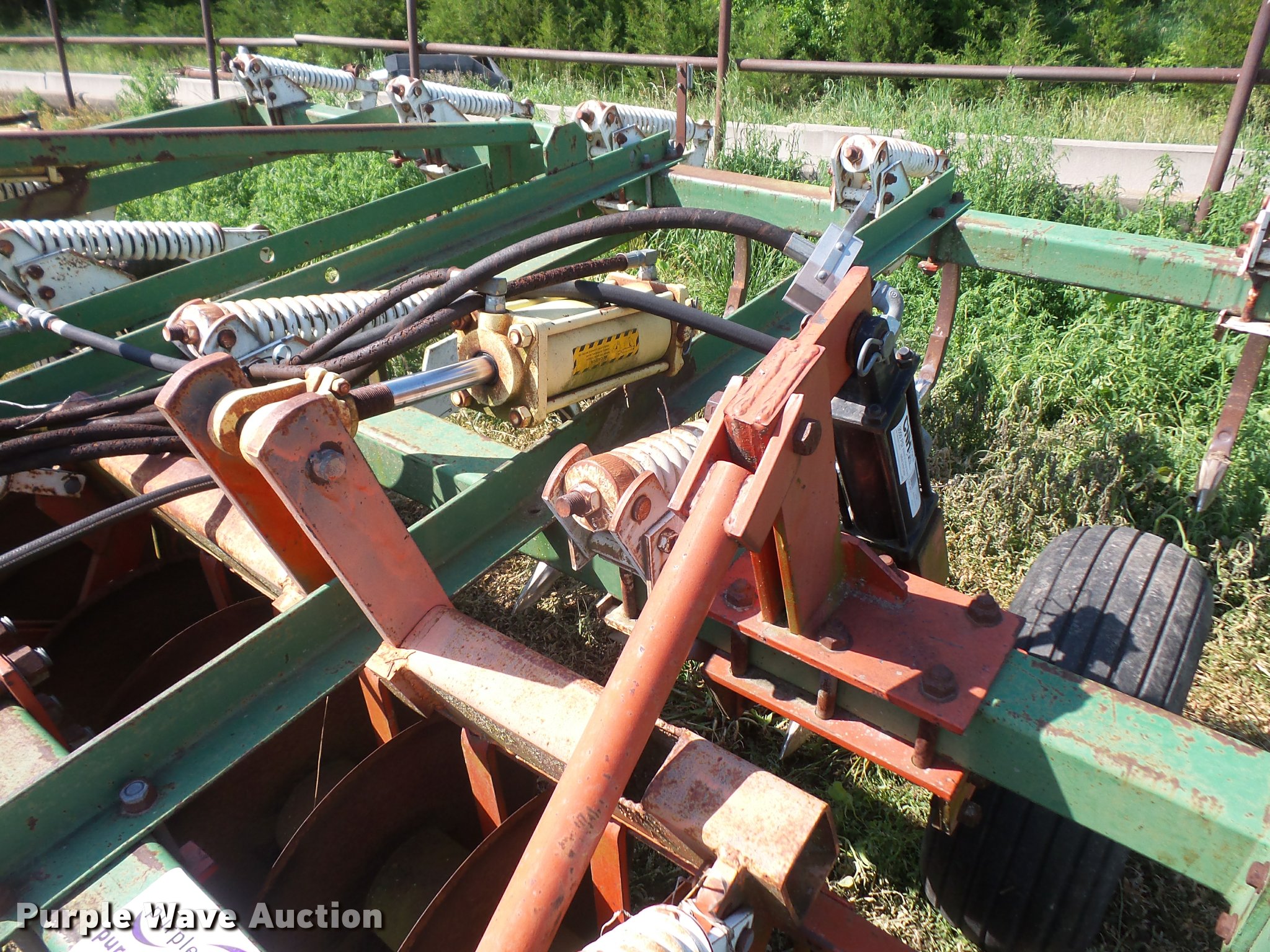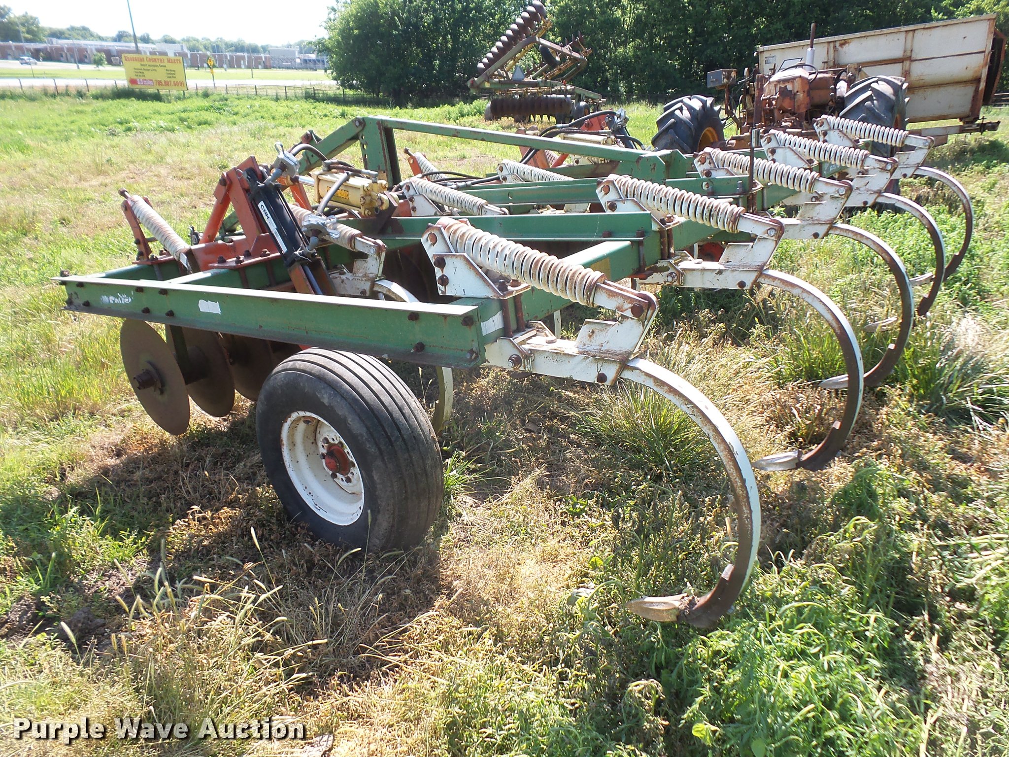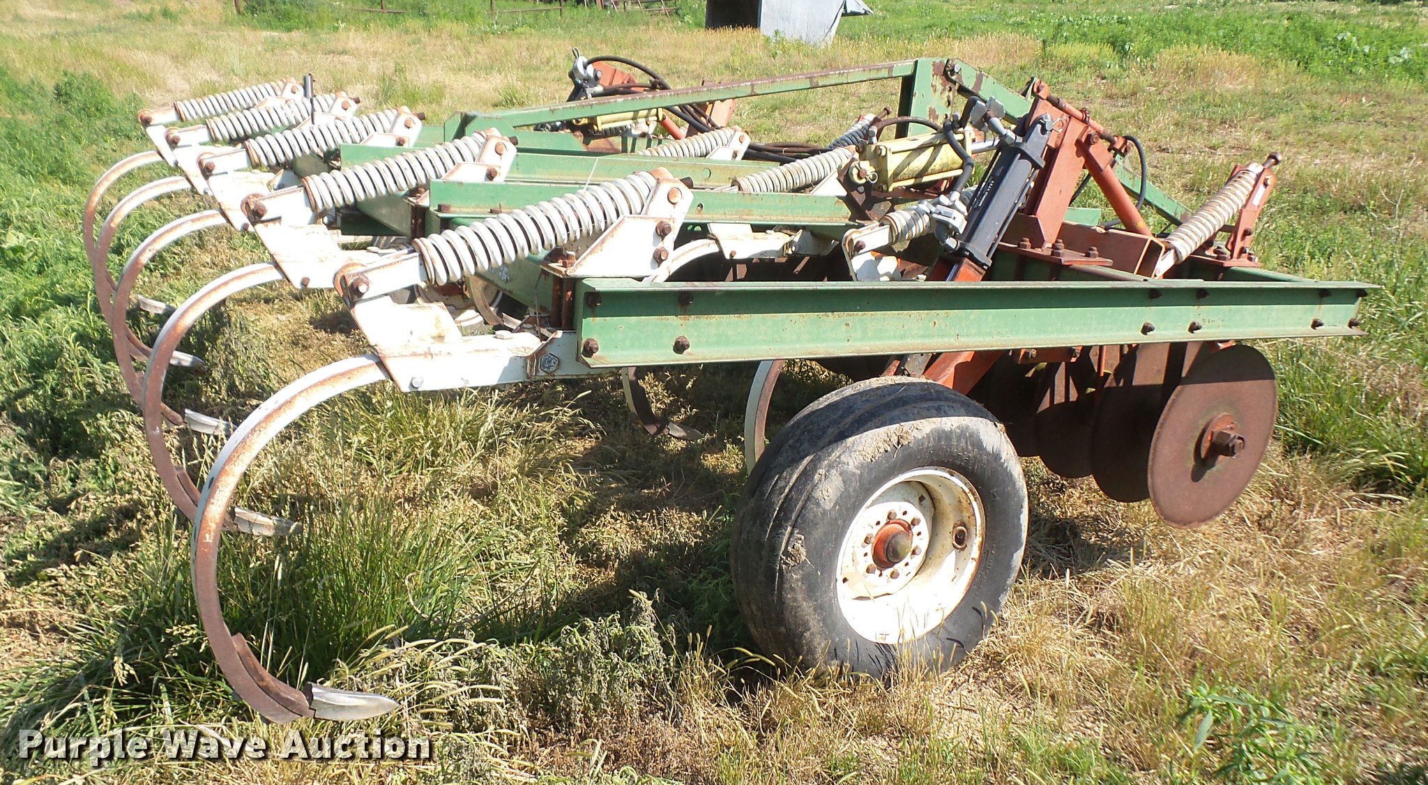 Purple Wave is selling a used Chisel in Kansas. This item is a Glenco Soil Saver chisel with the following: 12'W, (9) shanks, 19.5" diameter front blades, 7.5" spacing, Manual leveler, Hydraulic lift, Pin/clevis hitch, 11L-15 tires, (6) additional chisel shanks