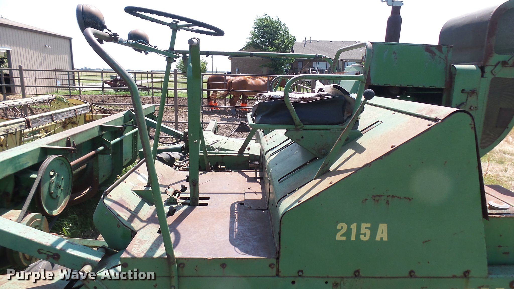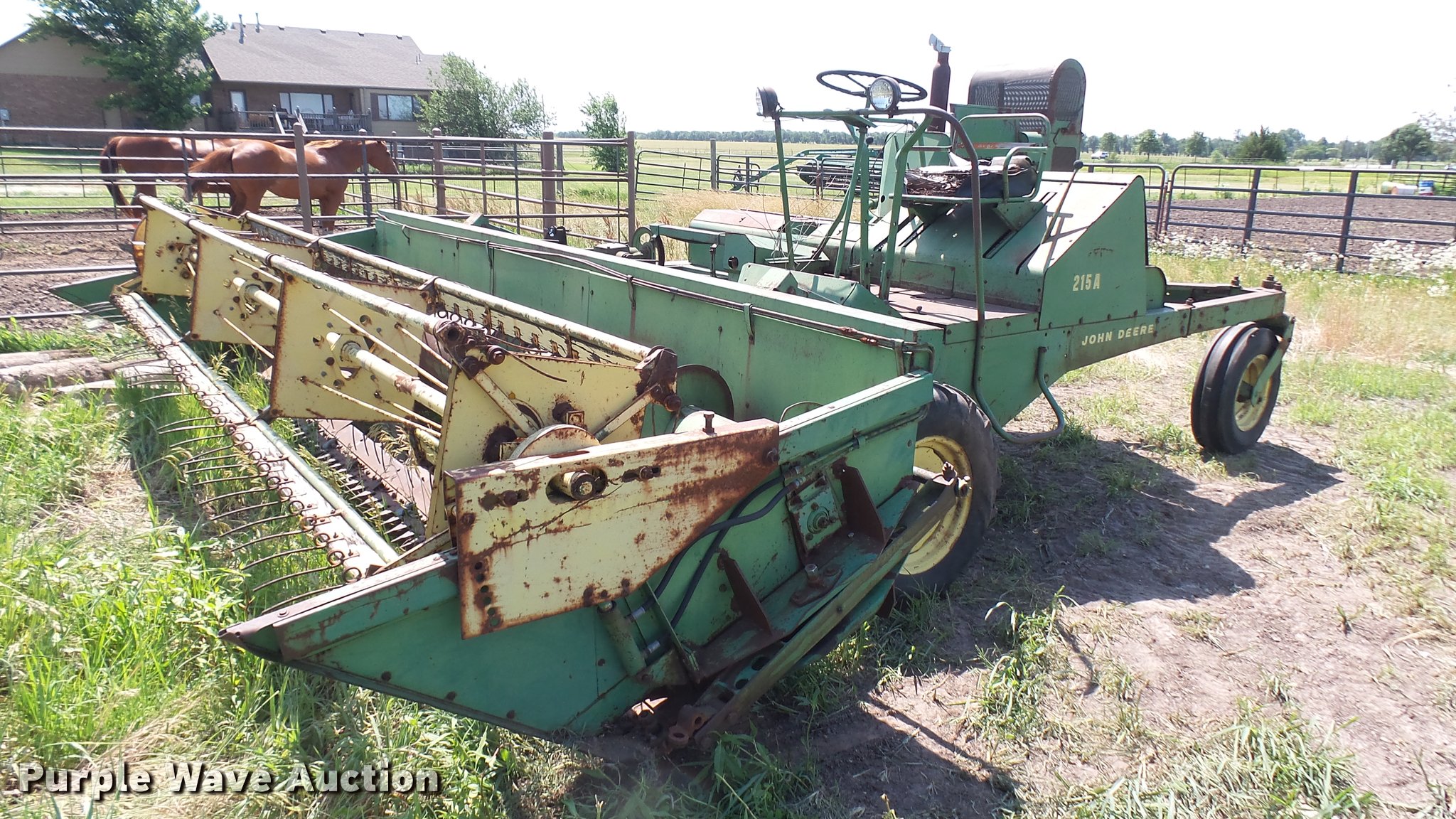 John Deere 215A self-propelled windrower. Four cylinder gas engine Model EA145, Serial 145G8F42782, John Deere SNEAPF1 head 14'W, 7.50-18 front tires, 7.50-15 rear tires, Starter issues. 4135 S Greenwich Rd. Derby, KS 67037