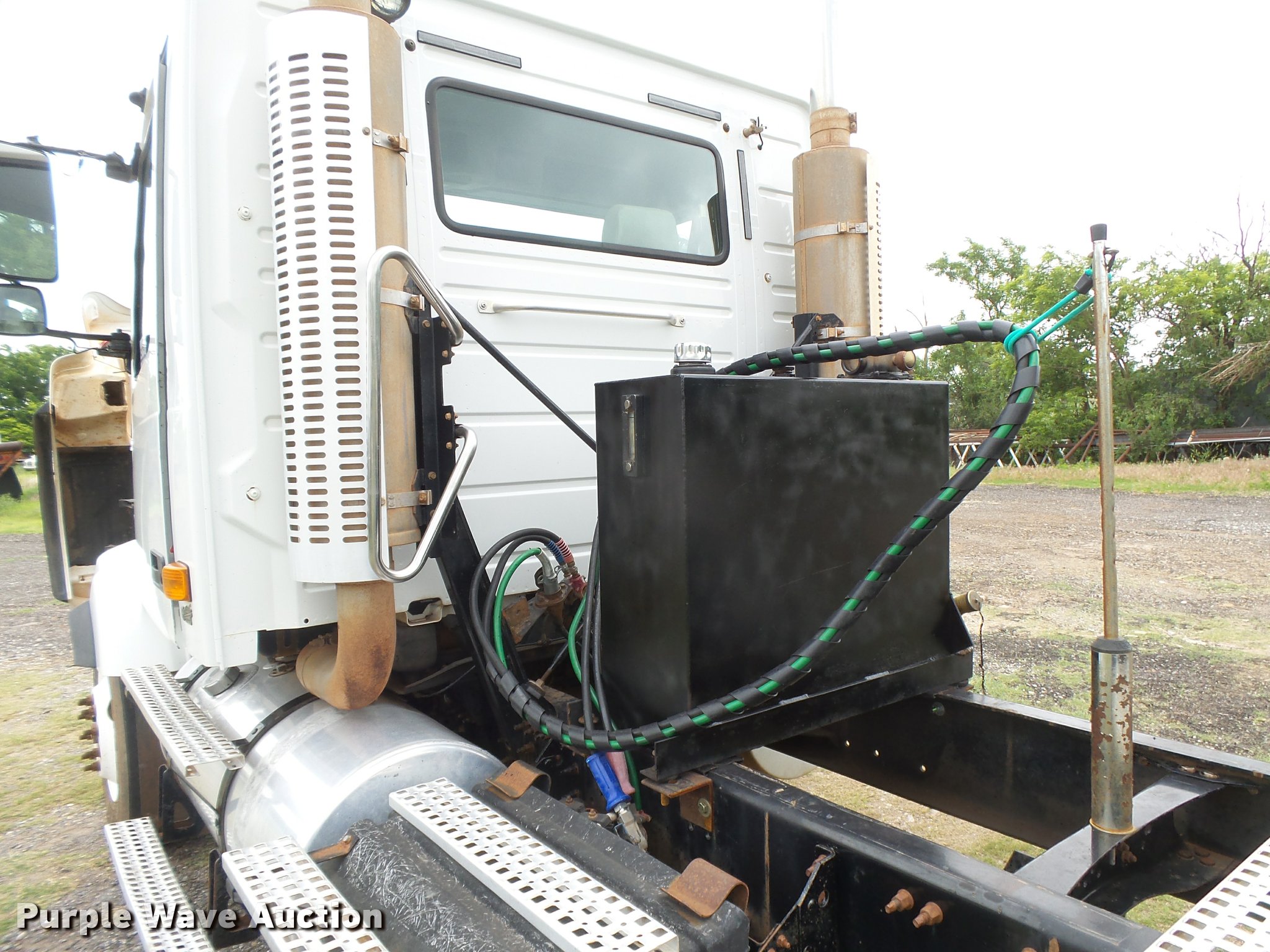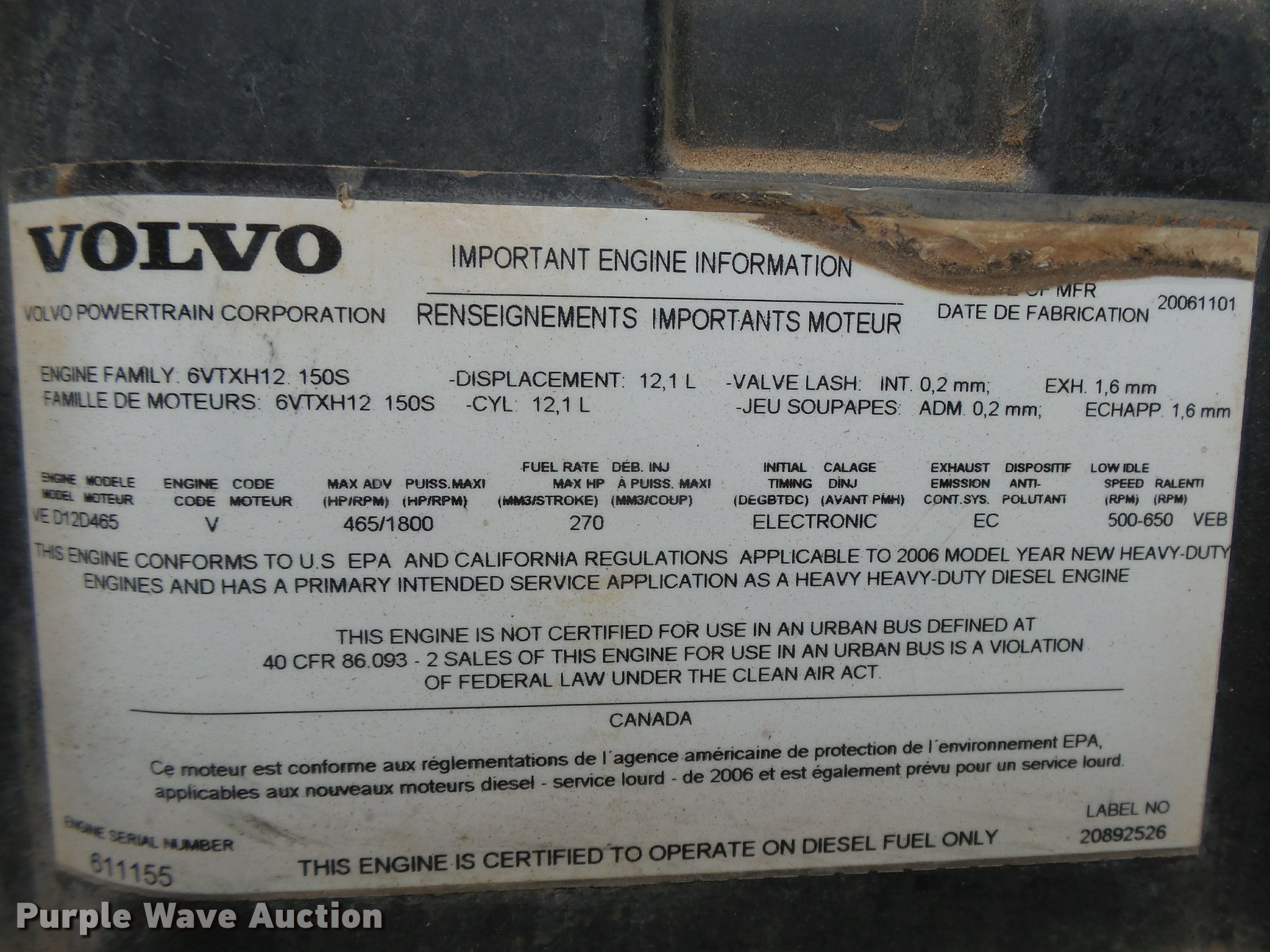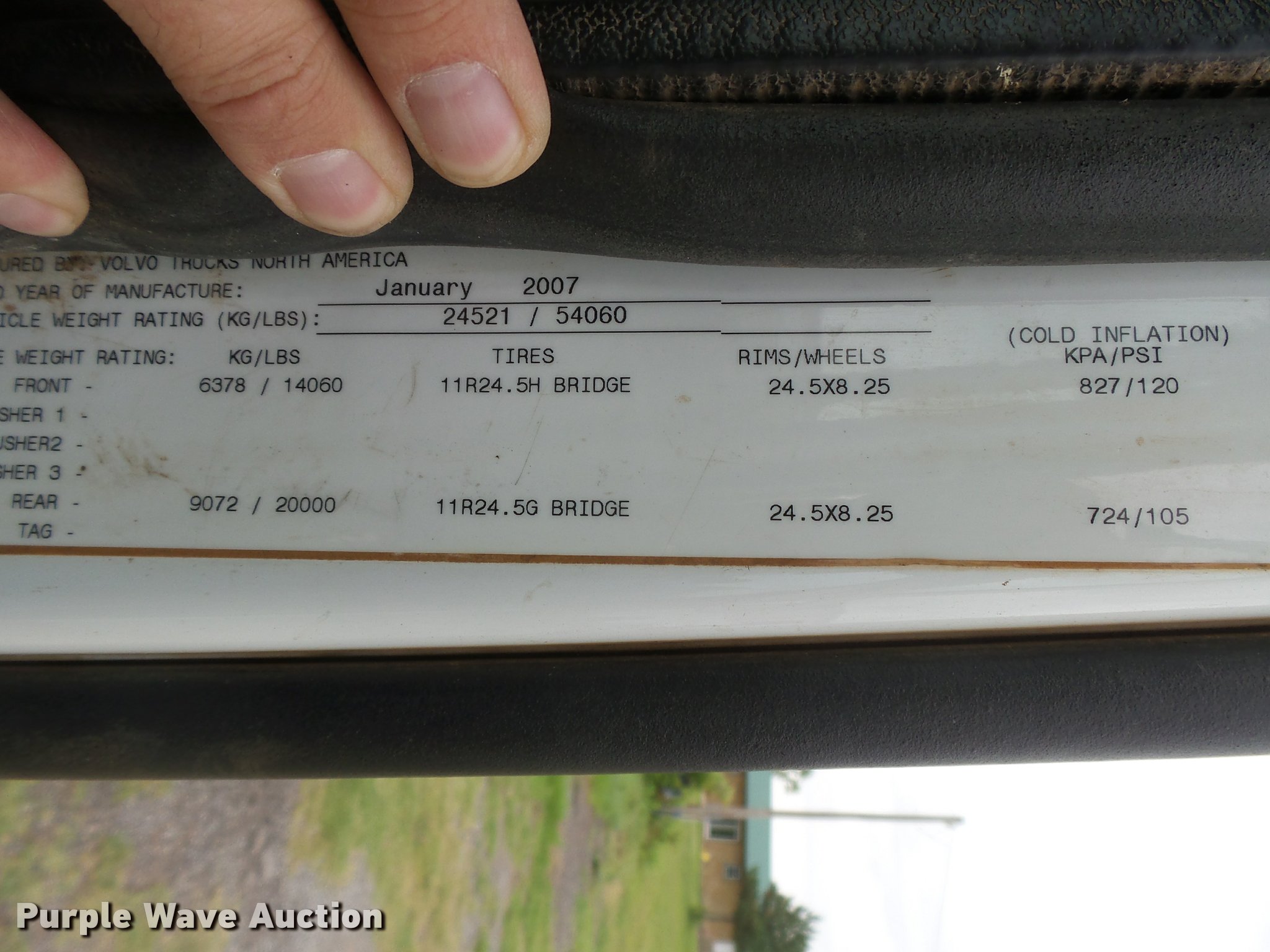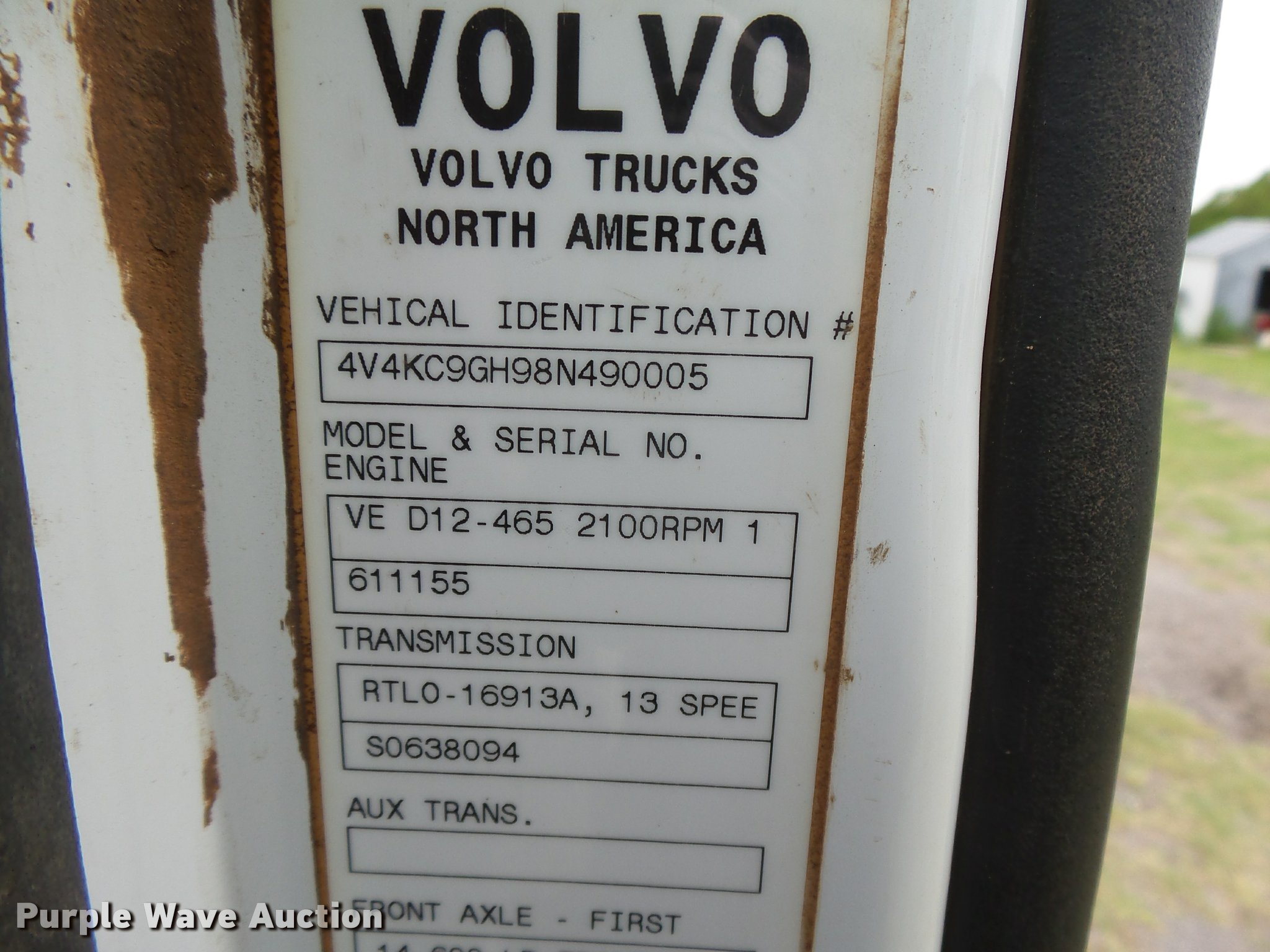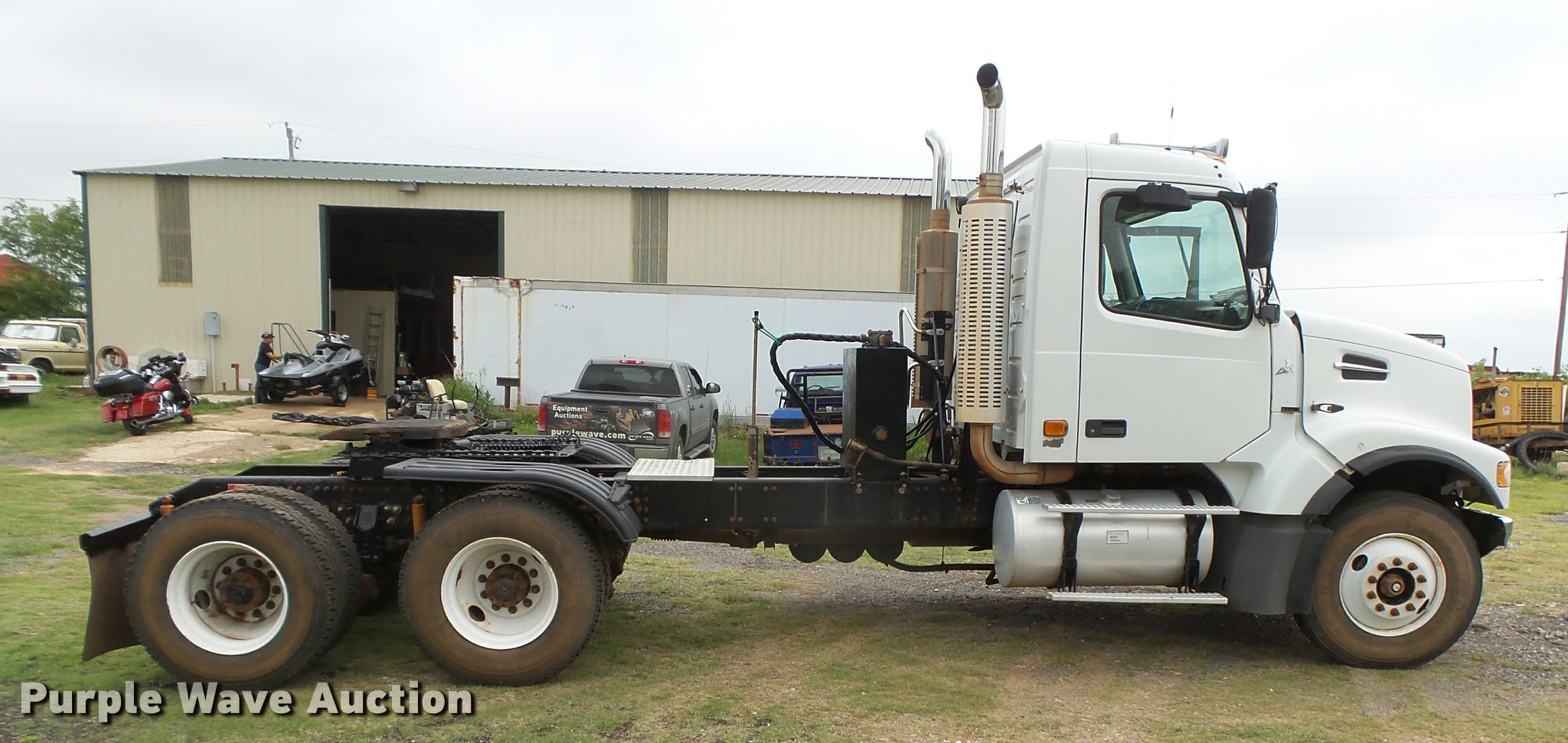 Purple Wave is selling a used Truck Tractor in Oklahoma. This item is a 2008 Volvo VHD semi truck with the following: 288,221 miles on odometer, Volvo VE D12 12.1L L6 diesel engine, 465 HP, Serial 611155, Eaton Fuller 13 speed manual transmission, Tandem axle, AC and heat, Cruise, AM/FM/CD, Power windows and locks, Power and heated mirrors, Air suspension seat, Air ride cab, Wet kit, Dual rear exhaust stacks, Air operated sliding fifth wheel plate, Dual fuel tanks, Half fenders, Mud flaps, Air suspension, Air brakes, 226" wheelbase, 11R22.5 tires, GVWR 54,060 lbs
