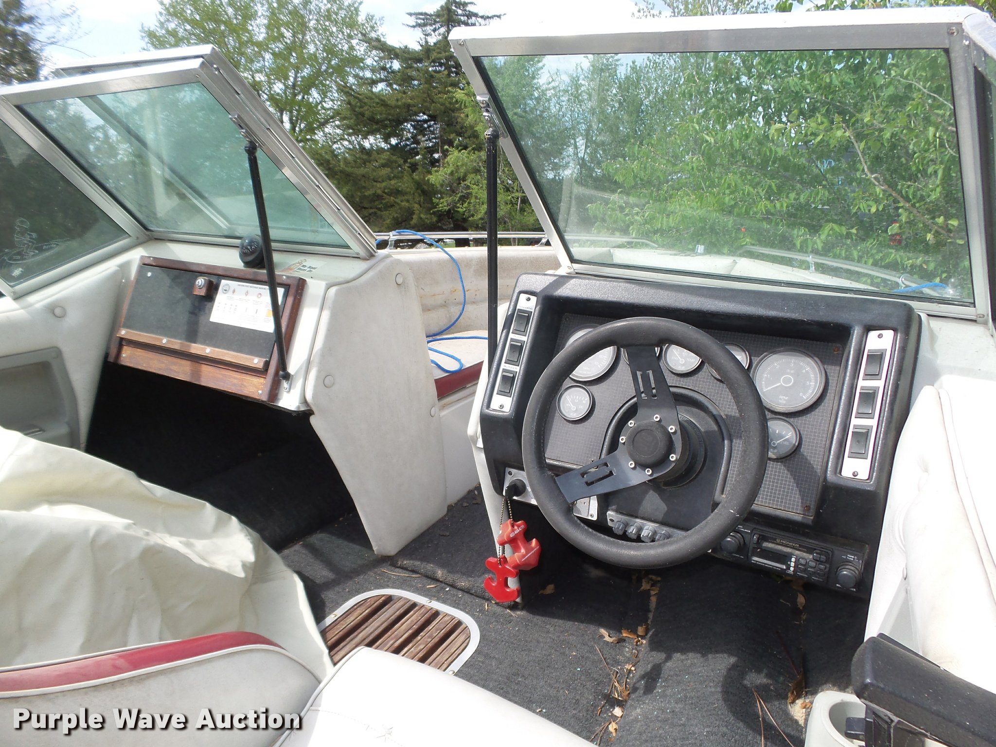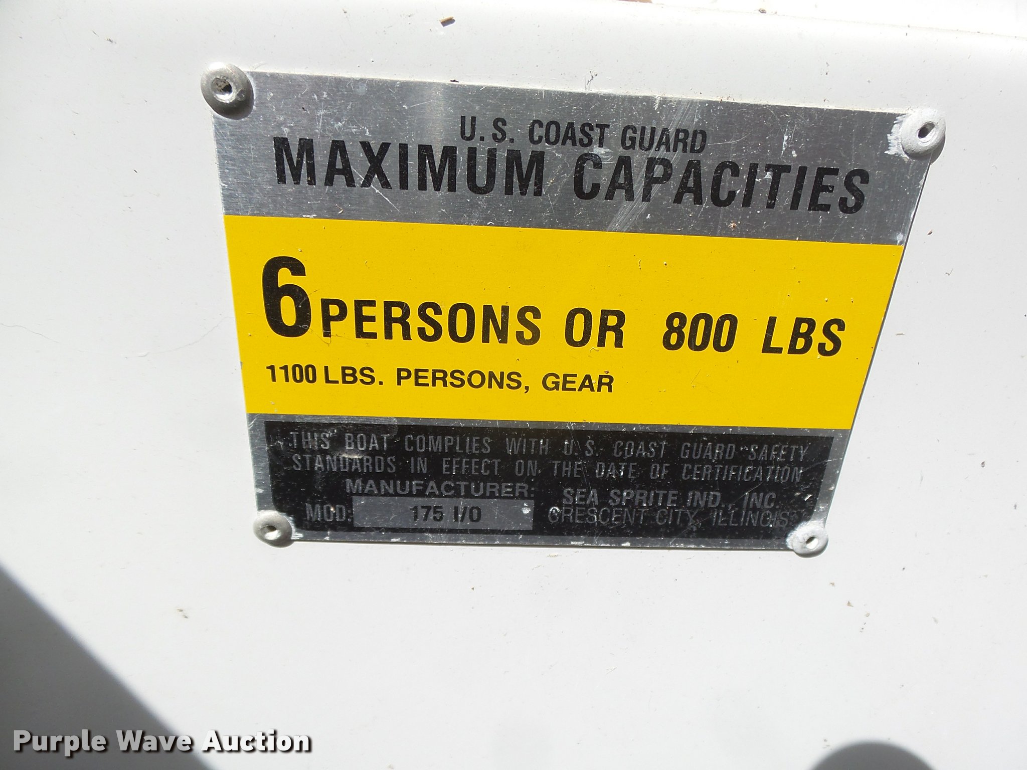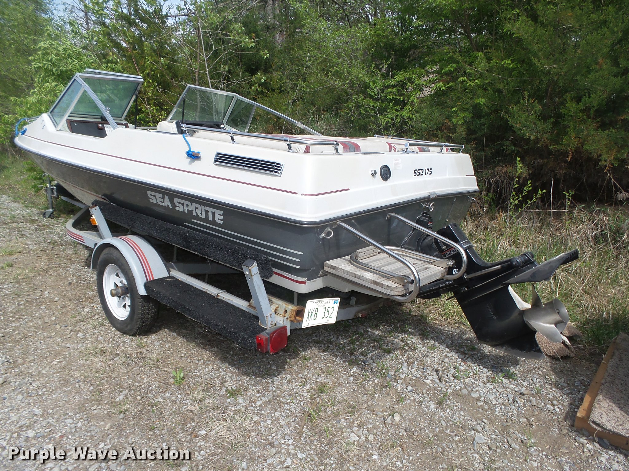 Purple Wave is selling a used Boat in Nebraska. This item is a 1987 Sea Sprite SSB175 boat with the following: Model 175 1/0, 17'L, MerCruiser Alpha One V6 engine, 75 HP, MerCruiser Stern Drive SE106 outboard motor, Power Trim XD, Serial 0B635, 12" three blade prop, Transom assembly serial 0B63598, AM/FM/cassette, Rear platform entry, Six person or 800 lbs ccapacity, Supra Pro I.D. Eagle monitor, Flip up engine cover chusions, One unattached, Hull I.D> S3B06498B787, Rolco boat trailer, 2" ball hitch, Safety chains, Trailer wiring, Manual winch, ST175/80D13 tires, P175/75B14 spare tire