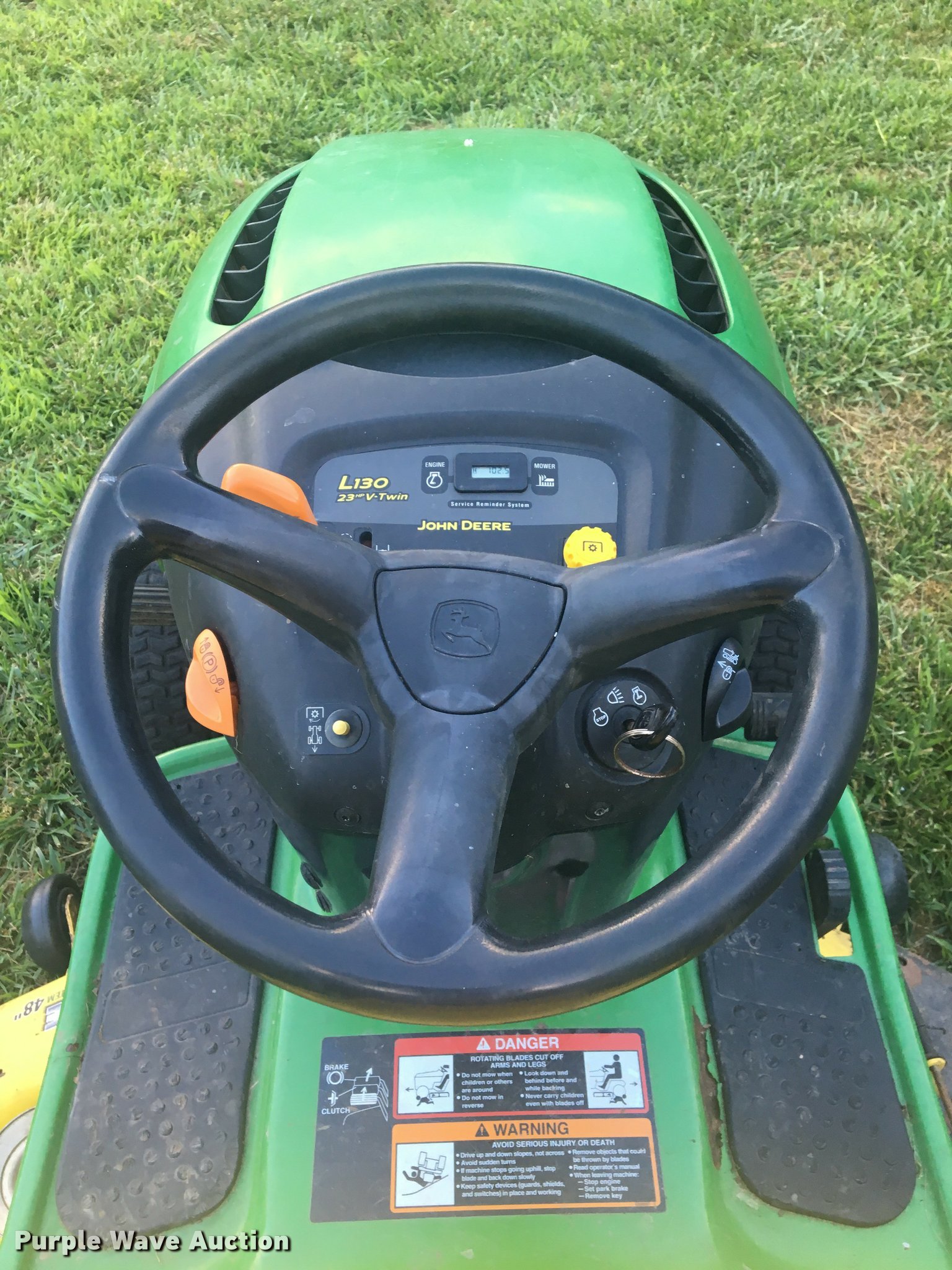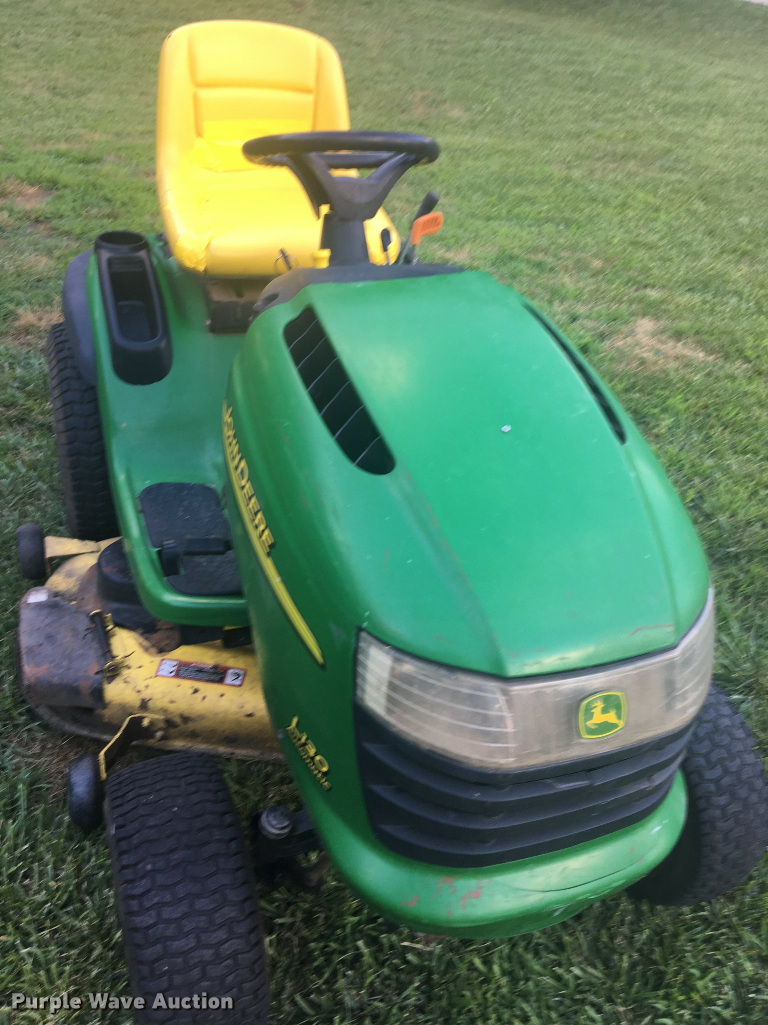 Purple Wave is selling a used Lawn Mower in Kansas. This item is a John Deere L130 riding lawn mower with the following: 48" cutting width, Kohler Command gas engine, 23 HP, Left side pulley deck cover will be installed prior to auction, Non-operational headlights