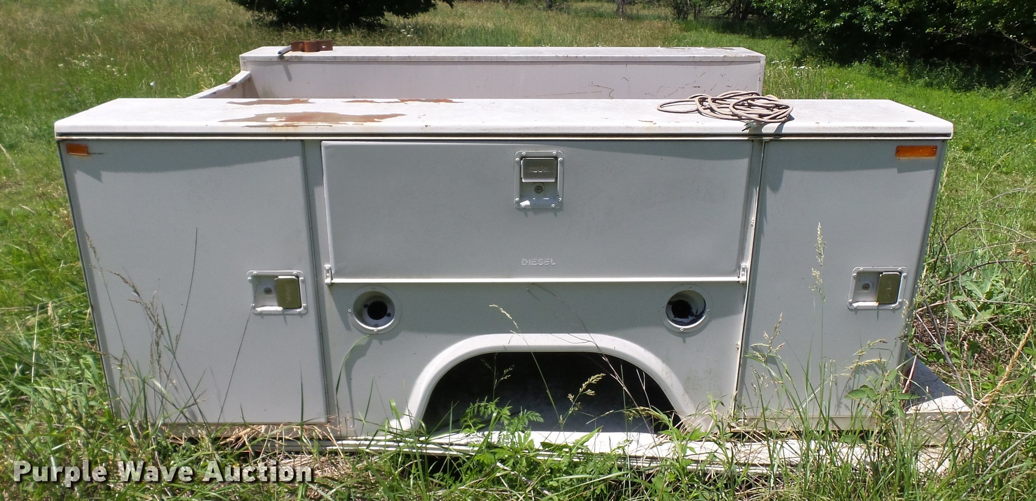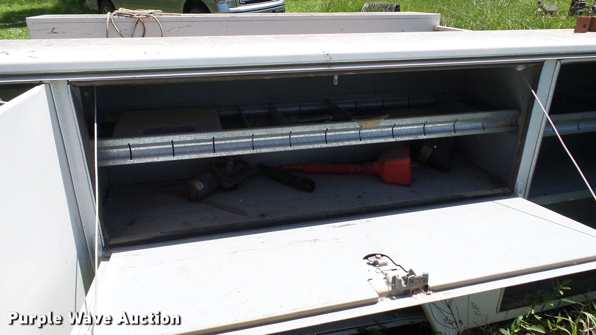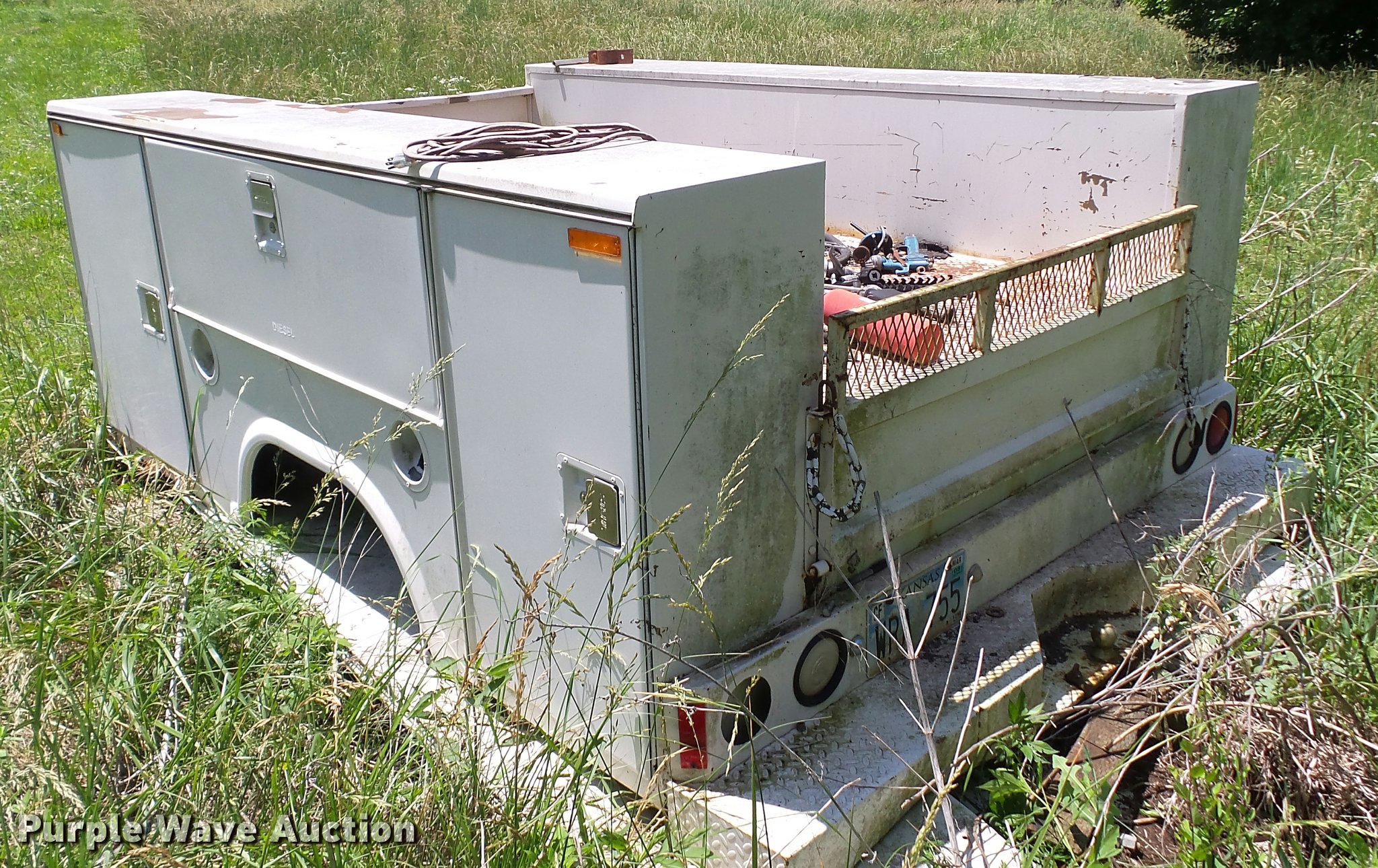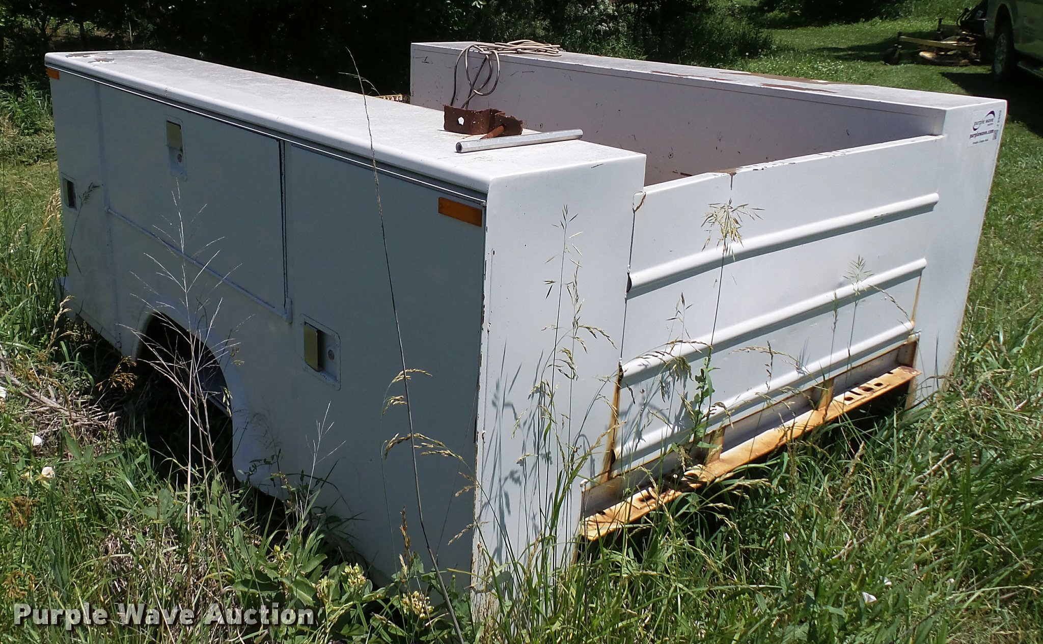 Purple Wave is selling a used Automotive Parts or Acces. in Kansas. This item is a Stahl utility bed with the following: 8'L x 80"W, Adjustable shelves, Removed from 1991 Ford F350 pickup truck, Serial 56-1585