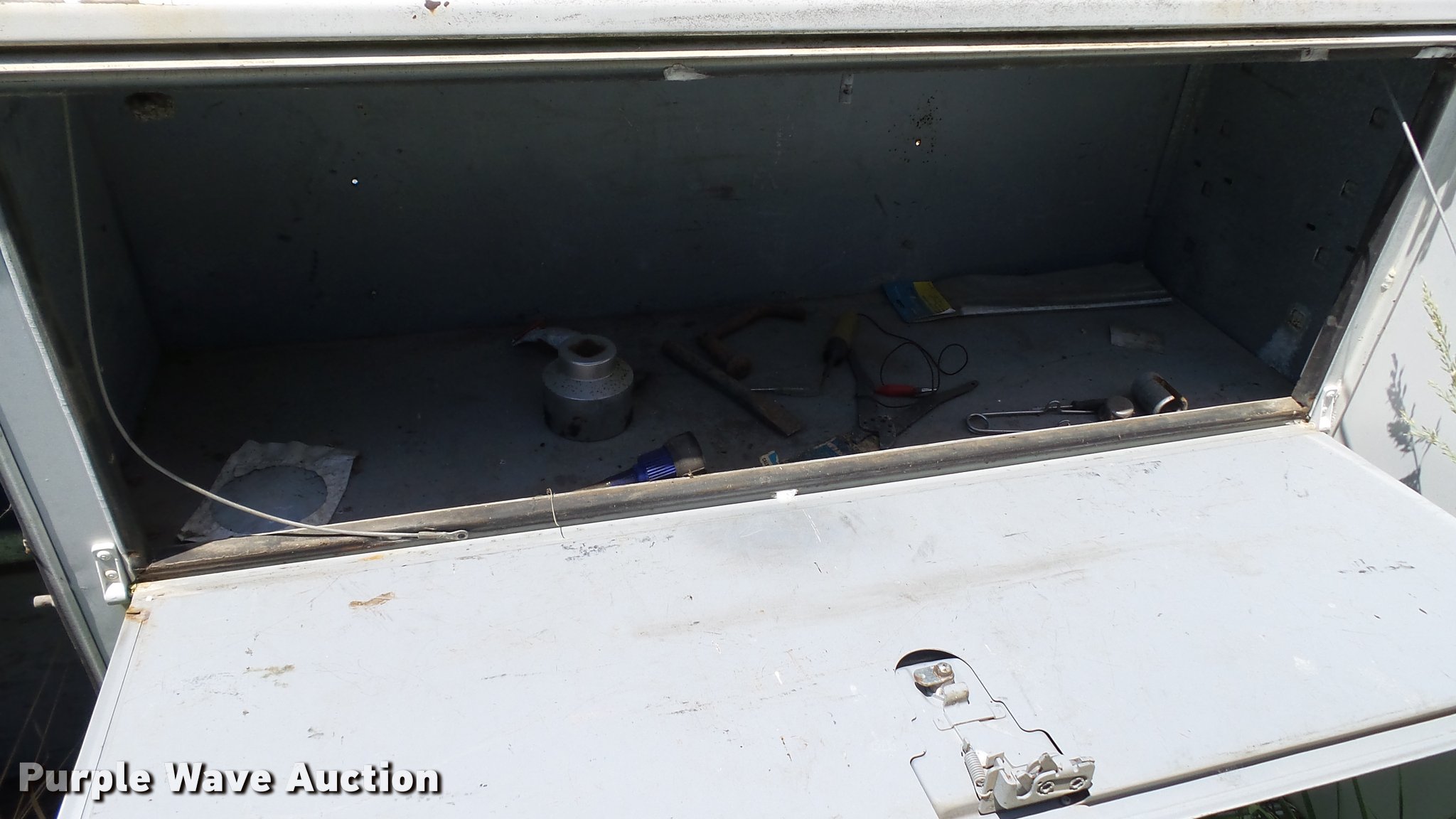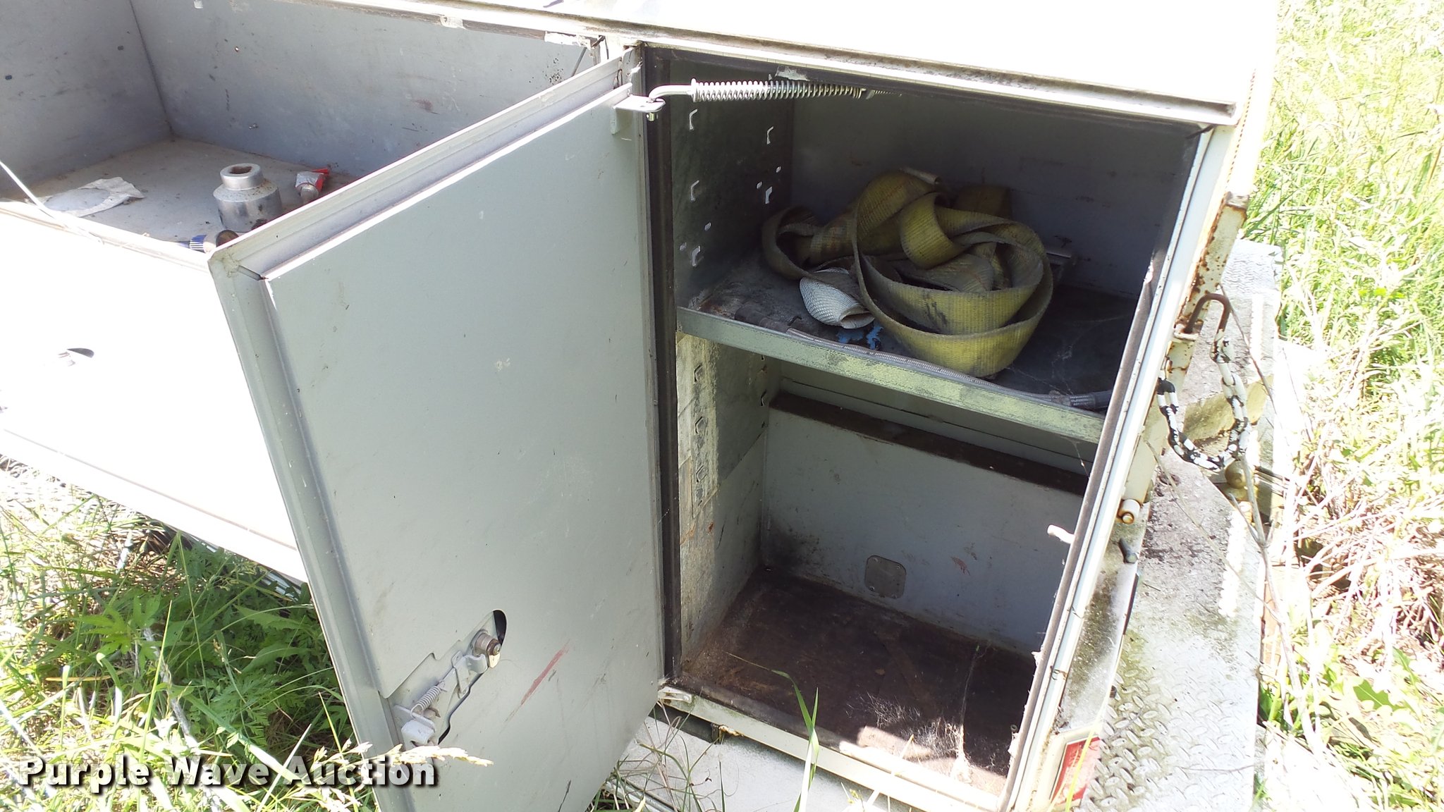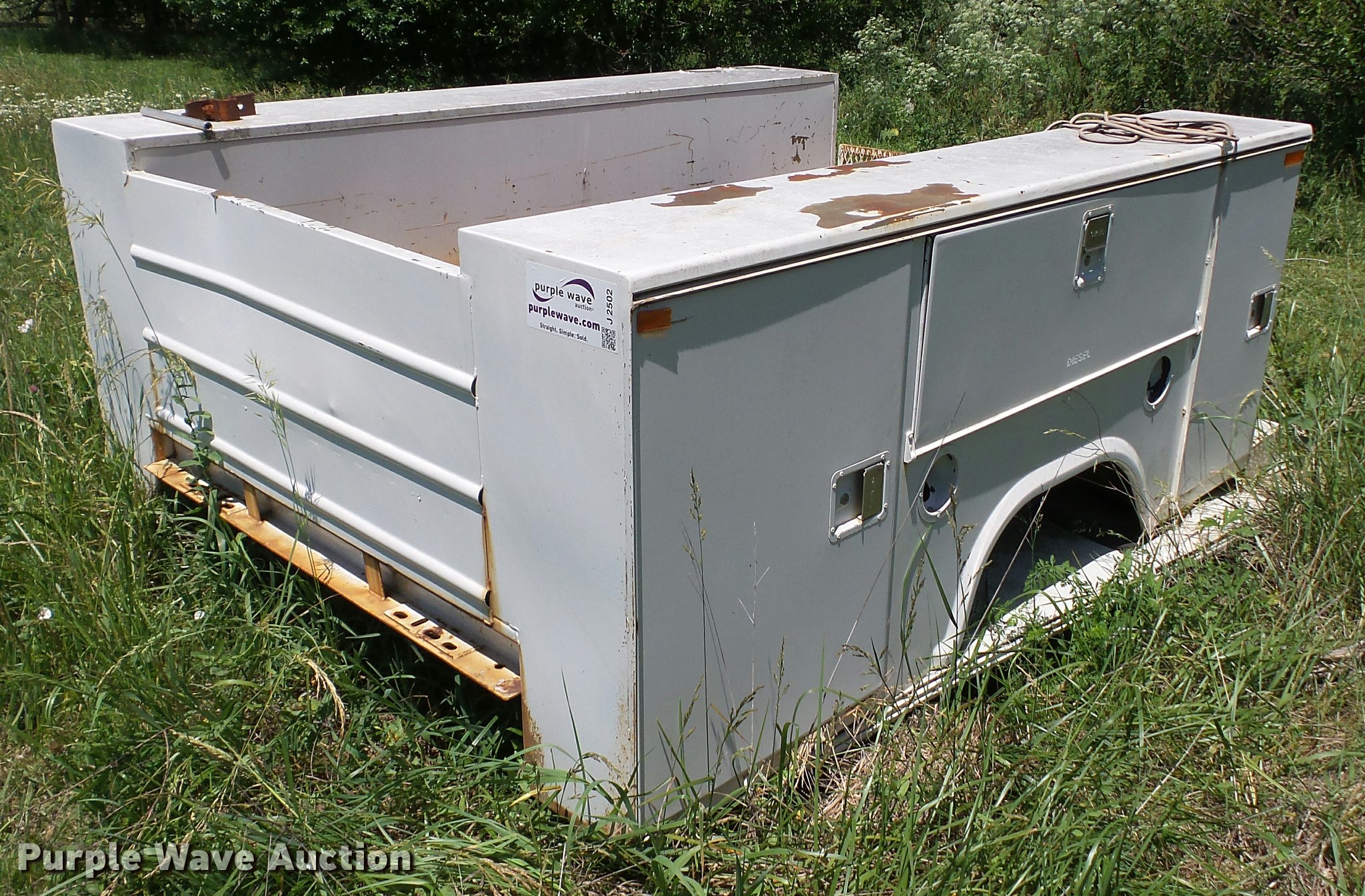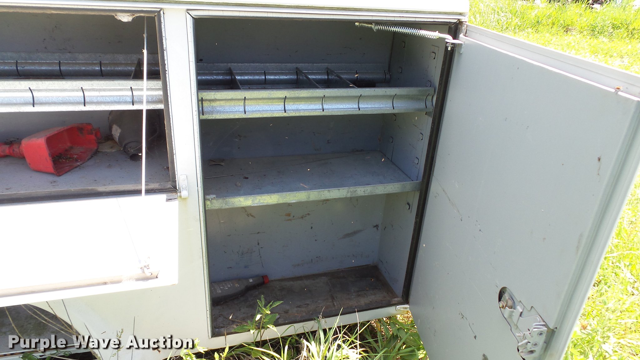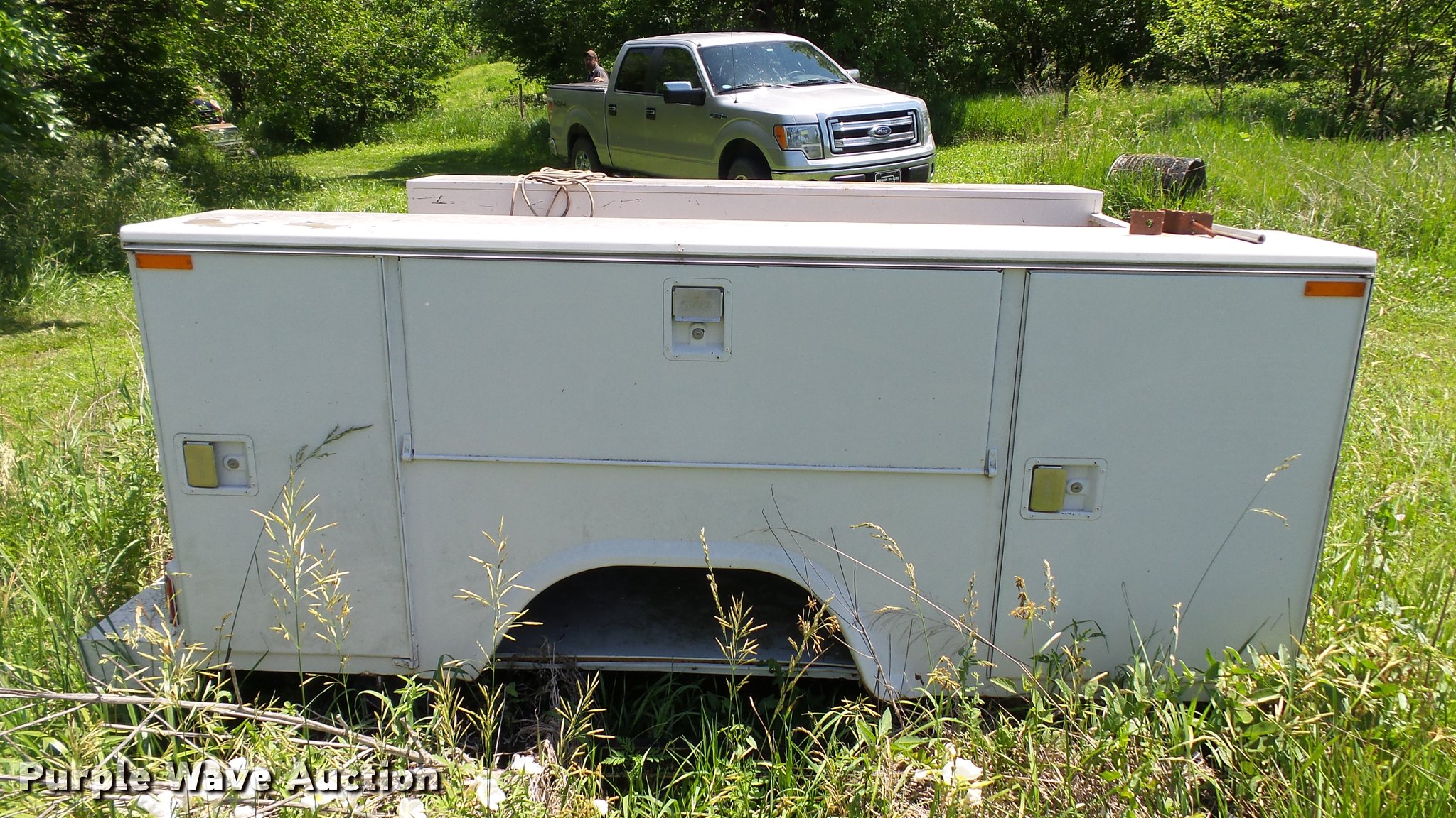 Purple Wave is selling a used Automotive Parts or Acces. in Kansas. This item is a Stahl utility bed with the following: 8'L x 80"W, Adjustable shelves, Removed from 1991 Ford F350 pickup truck, Serial 56-1585