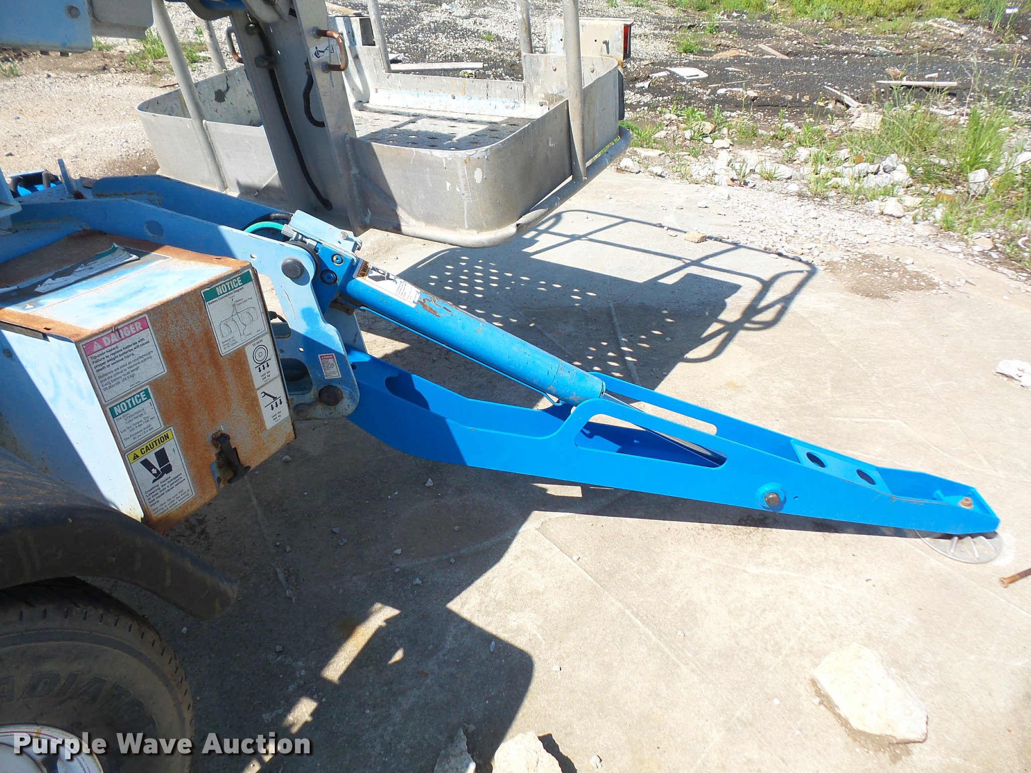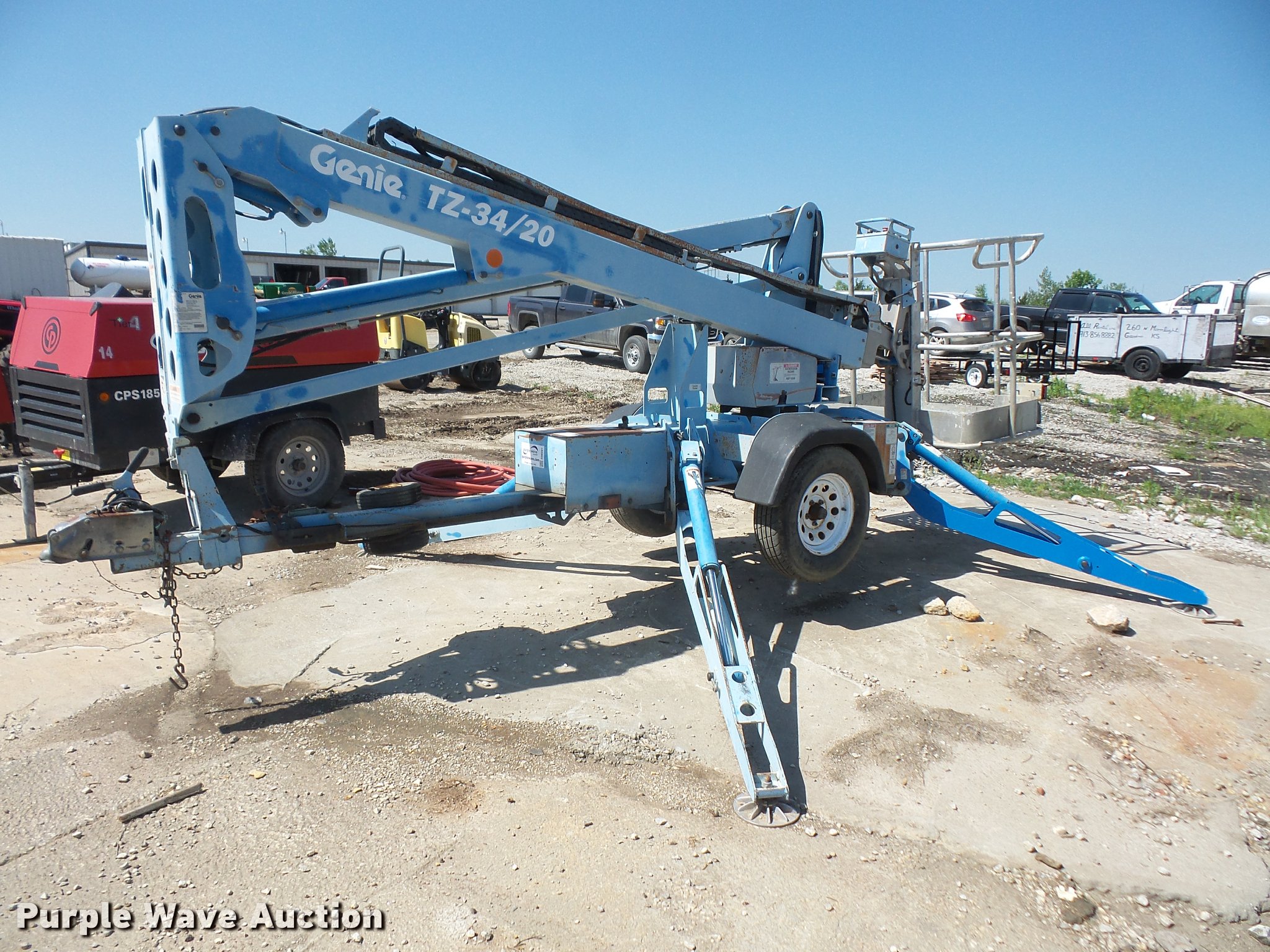 Purple Wave is selling a used Boom Lift in Kansas. This item is a 2006 Genie TZ-34/20 boom lift with the following: 24V operation, 500 lbs maximum lift capacity, 18.3' maximum reach, 34' maximum lift height, 45"L x 28"W platform, AC power outlet, Platform and ground controls, Hydraulic platform rotation, Hydraulic outriggers, 215/75R14 tires, Serial TZ3406-670