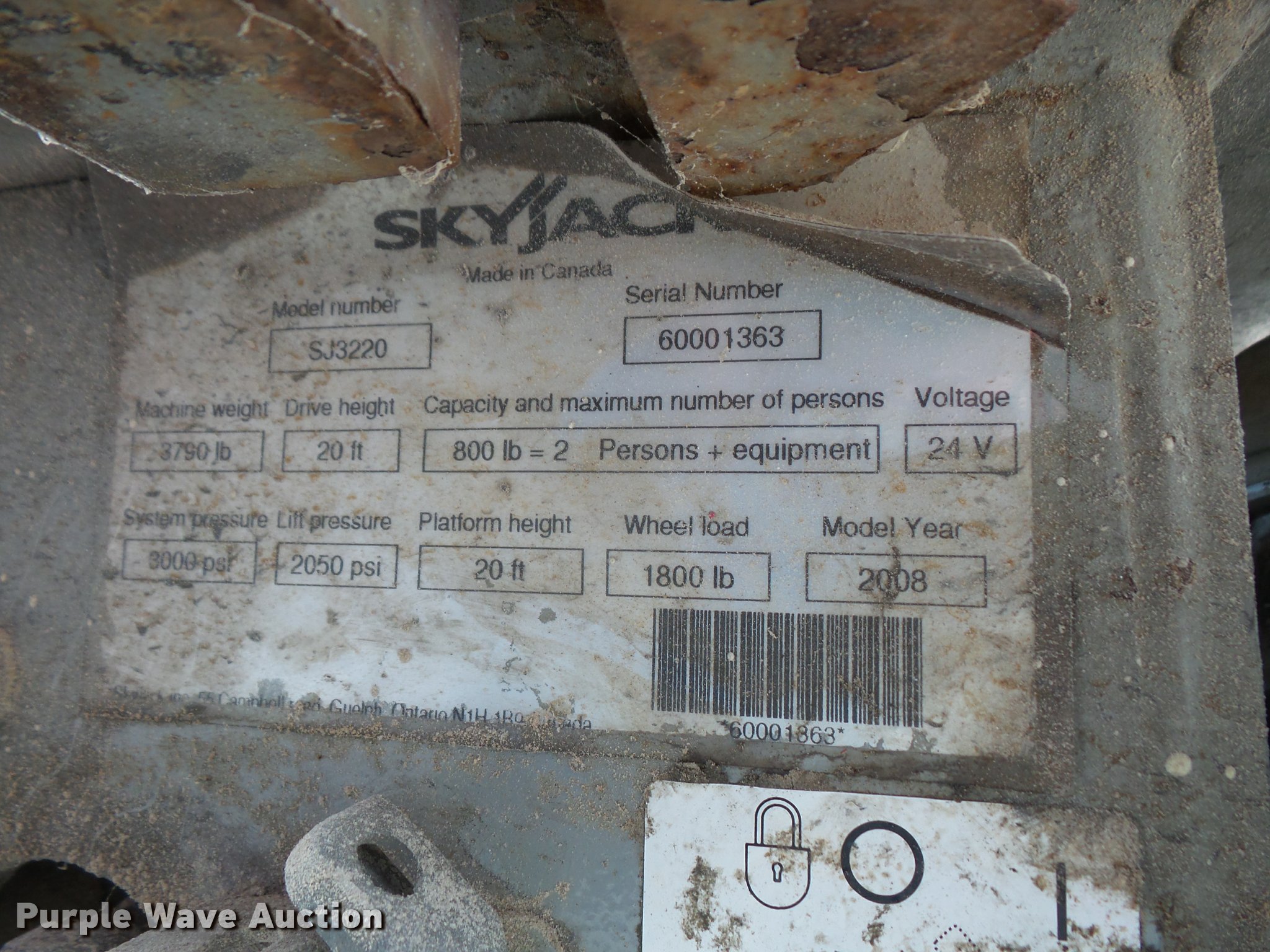 Purple Wave is selling a used Scissor or Vertical Lift in Kansas. This item is a 2008 Sky Jack SJ III 3220 scissor lift with the following: 200 hours on meter, 24V operation, 900 lbs maximum lift capacity, 20' maximum lift height, 7.5'L x 30"W platform, 6' powered platform extensions, AC power outlet, Non-marking tires, Serial 60001363