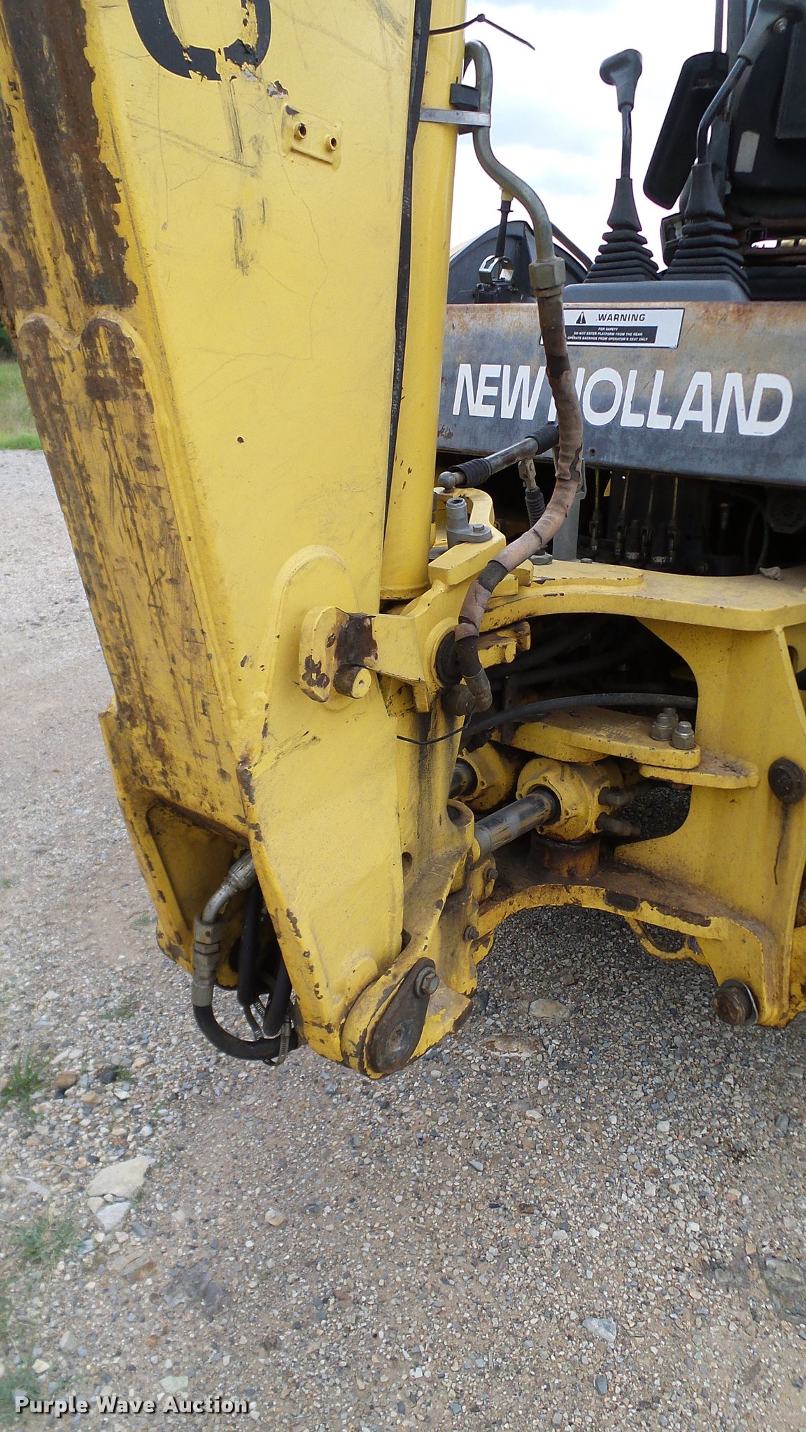 Purple Wave is selling a used Tractor Loader Backhoe in Oklahoma. This item is a 2001 New Holland LB75B backhoe with the following: 3,384 hours on meter, New Holland 445T/M2 4.5L four cylinder turbo diesel engine, 95 HP, Serial B960300, Shuttle shift transmission, 4F-4R gears, OROPS, Suspension seat, Wobble stick backhoe controls, Front and rear work lights, 88"W loader bucket, 1.3 cu. yd. capacity, Bolt-on cutting edge, E-stick, 18"W backhoe bucket, Bolt-on cutting edge, (4) teeth, Front counter weights, 11L-16SL front tires, 19.5L-24 rear tires, Battery weak, Engine side covers missing, Right outrigger cylinder leaks, Serial 031033267