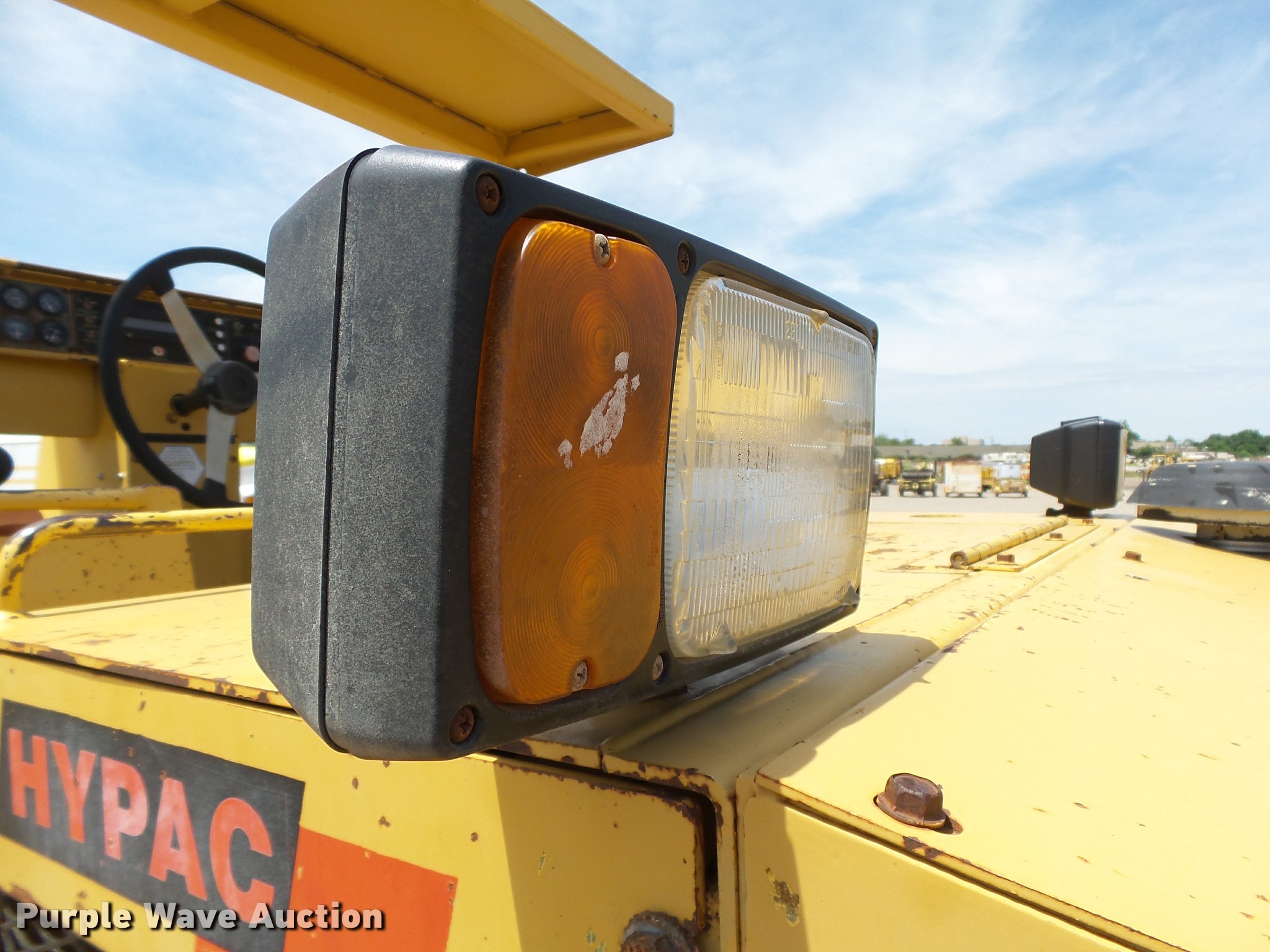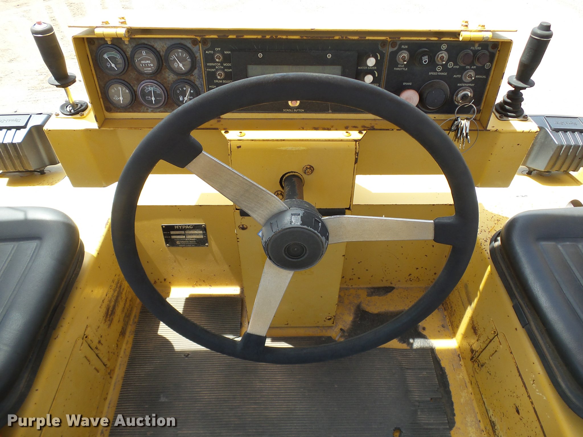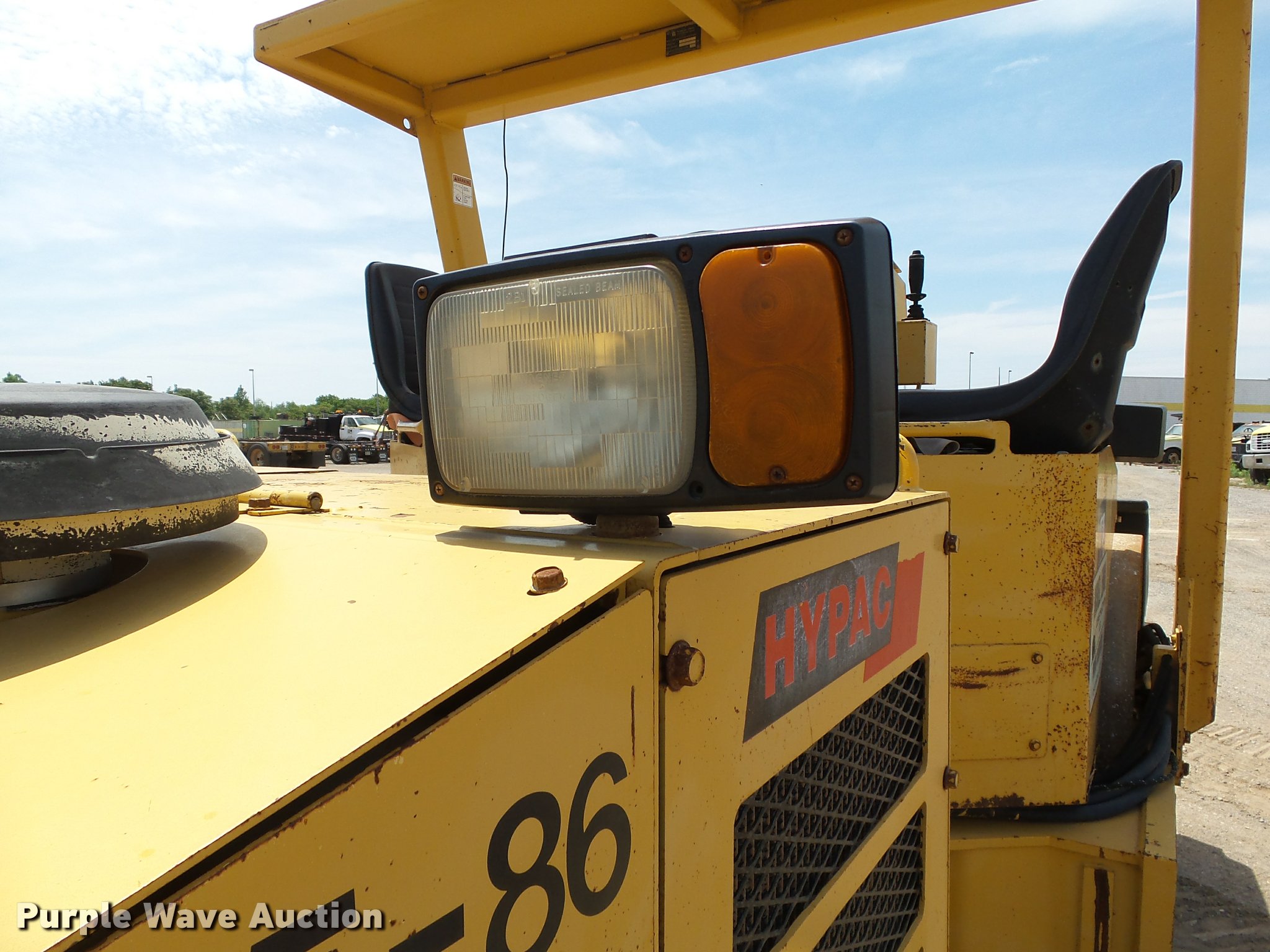 Purple Wave is selling a used Double Drum Roller Compactor in Oklahoma. This item is a 1998 Hypac C778B double drum vibratory roller with the following: 9,319 hours on meter, Cummins four cylinder turbo diesel engine, Two speed hydrostatic transmission, Canopy, Dual operators stations, Vandal cover, Work lights, Combination/shell kit, 78"W x 48" diameter smooth drums, Dual two speed vibratory system, Independent drum controls, Front and rear drum scrapers, Front and rear water application, Goodyear 245/75R22.5 tires, Serial 109B21501689, Unit# 5-86