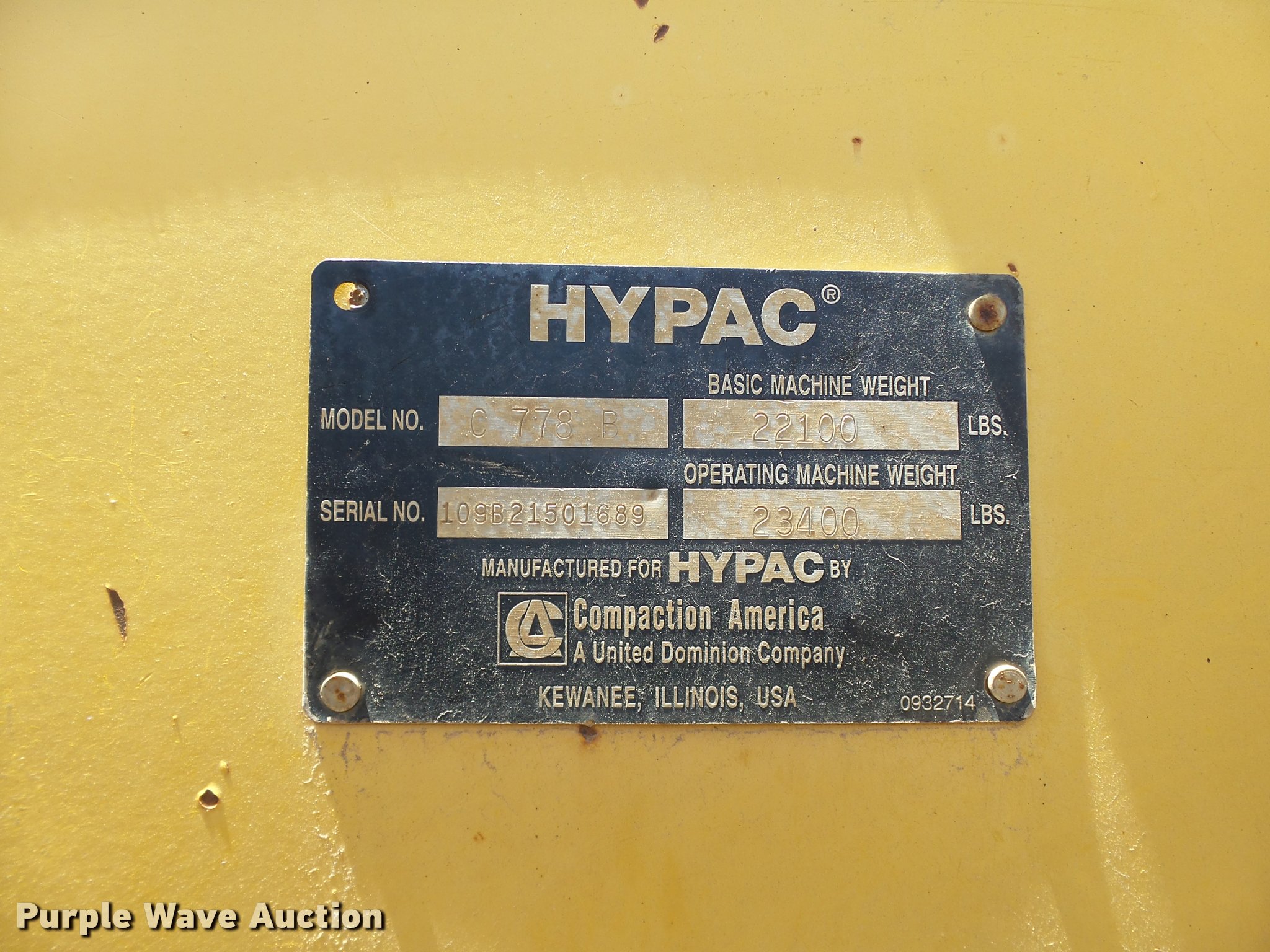 1998 Hypac C778B double drum vibratory roller. 9,319 hours on meter, Cummins four cylinder turbo diesel engine, Two speed hydrostatic transmission, Canopy, Dual operators stations, Vandal cover, Work lights, Combination/shell kit, 78"W x 48" diameter smooth drums, Dual two speed vibratory system, Independent drum controls, Front and rear drum scrapers, Front and rear water application, Goodyear 245/75R22.5 tires, Serial 109B21501689, Unit# 5-86. Haskell Lemon Construction Co.. 3800 SW 10th St. Oklahoma City, OK 73108