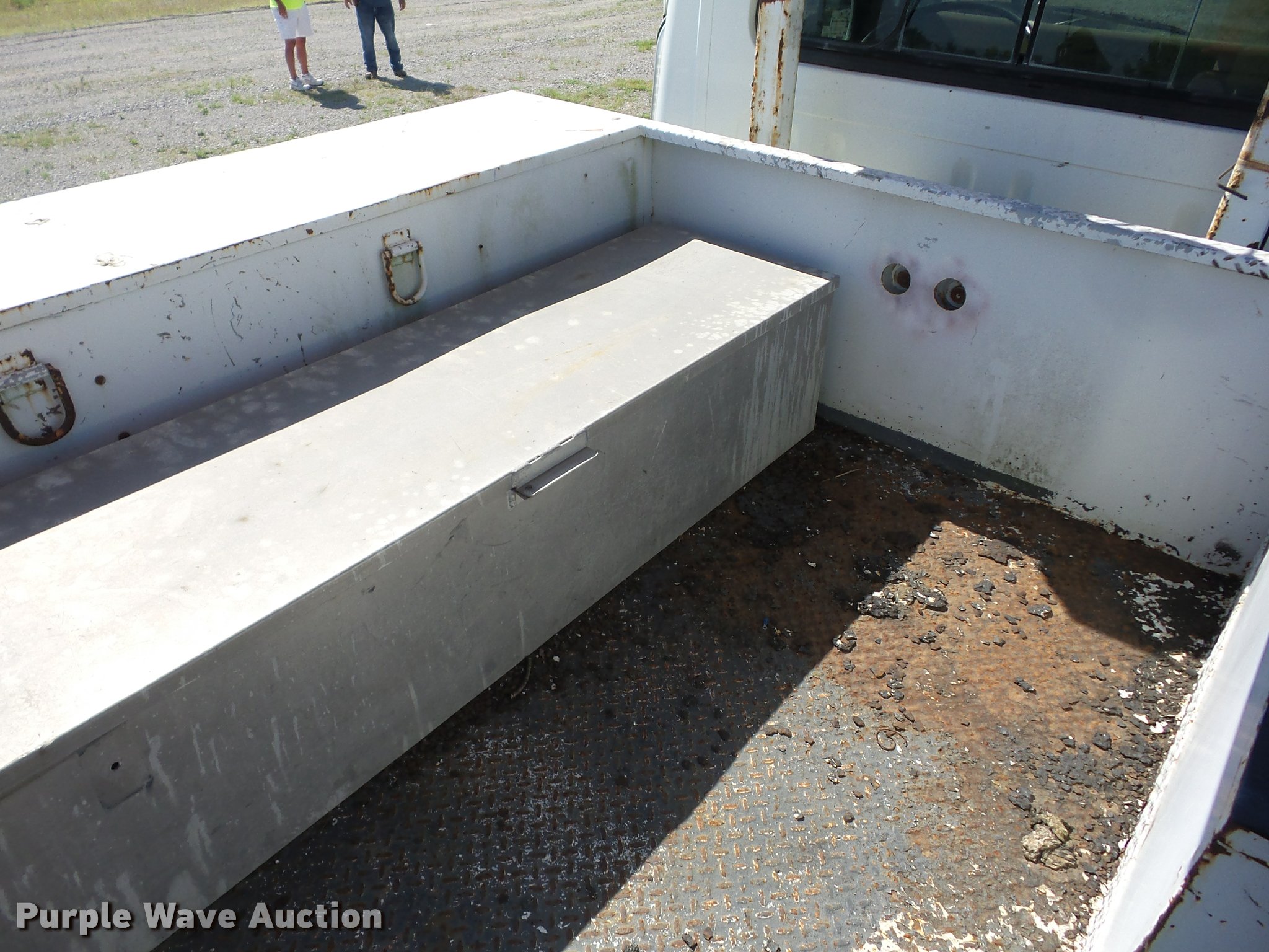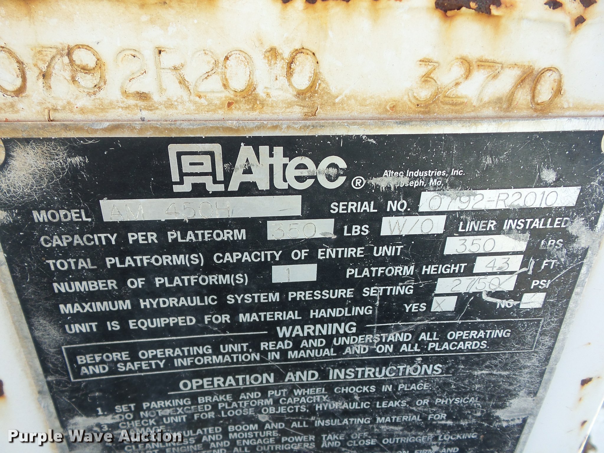 Purple Wave is selling a used Bucket Truck in Oklahoma. This item is a 1993 International 4900 bucket truck with the following: 227,959 miles on odometer, International DT466 7.6L L6 turbo diesel engine, Automatic transmission, Single axle, AC and heat, AM/FM, Beacon light, Front tow hooks, PTO, Altec service bed, 14'L, Altec AM450H break over boom, 350 lbs maximum lift capacity, 43' maximum lift height, Man basket, Boom rotation, Outriggers, Serial 0792R2010, Single fuel tank, Spring suspension, Air brakes, 11R22.5 front tires, Unit# MB03
