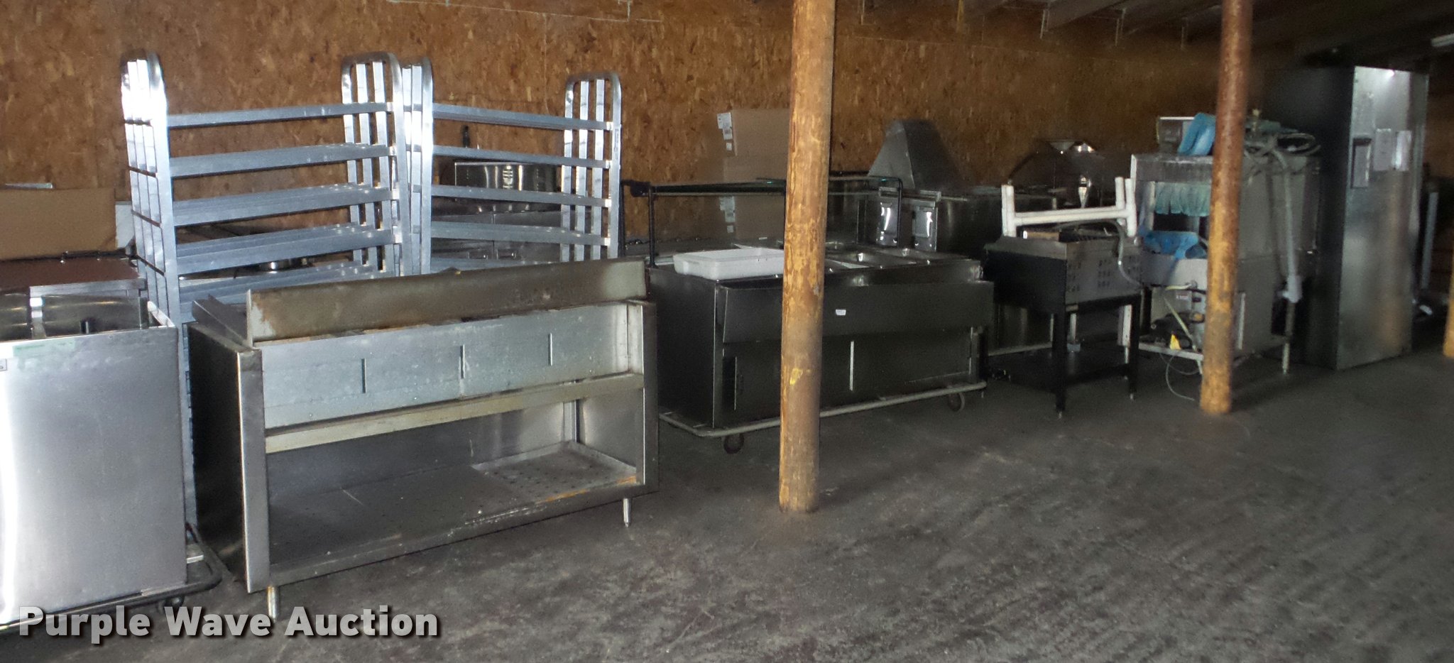 Purple Wave is selling a used Restaurant Equip. in Kansas. This item is a Restaurant equipment with the following: Vulcan electric stove, Two bay stainless steel sink, Counter top, Stainless steel L-shaped counter top, Shelving, Plate warmer, (4) buffer tables, Open front cooler, Hobart dish washer, Char broiler, Tray warmers, (2) can racks, Plate holder