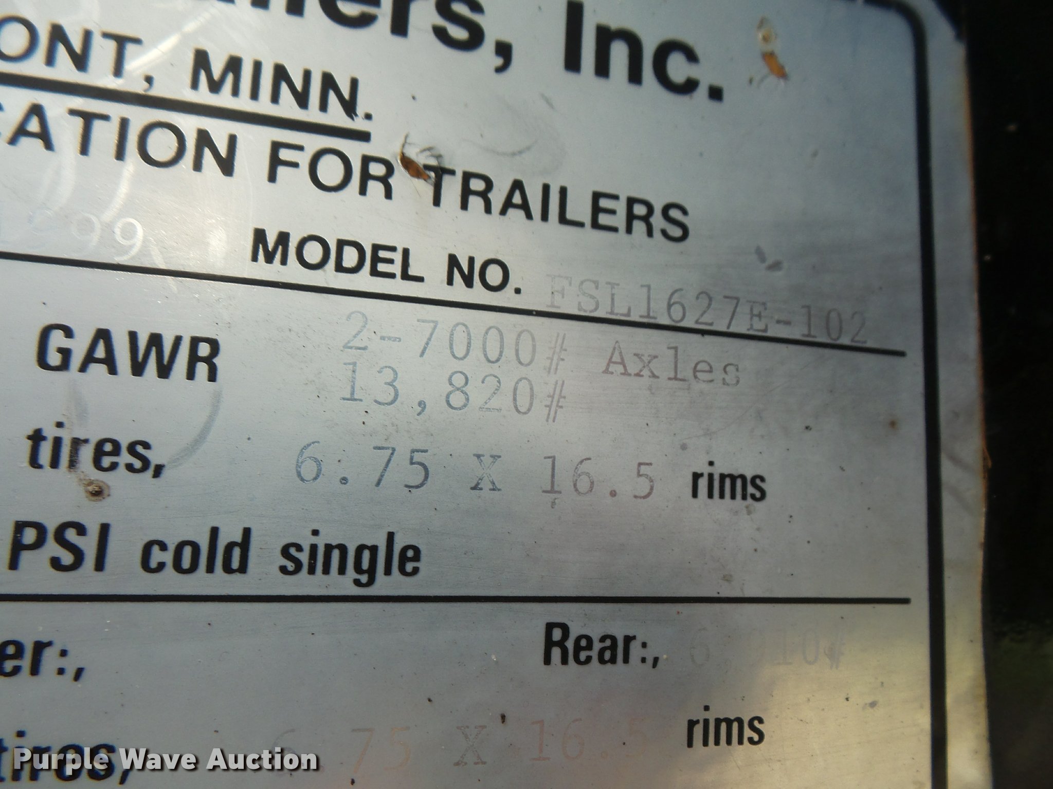 Purple Wave is selling a used Equip. Trailer in Kansas. This item is a 1999 Redi Haul FSL1627E-102 equipment trailer with the following: 18'L x 81"W overall, 16'L wood deck, 2'L dovetail, 4.5'L ramps, D-ring tie downs, Toolbox, 2 5/16" ball hitch, Single leg landing gear, Spring suspension, Electric brakes, Tandem axle, 9.50-16.5 tires, GVWR 17,150 lbs, GAWR 7,000 lbs
